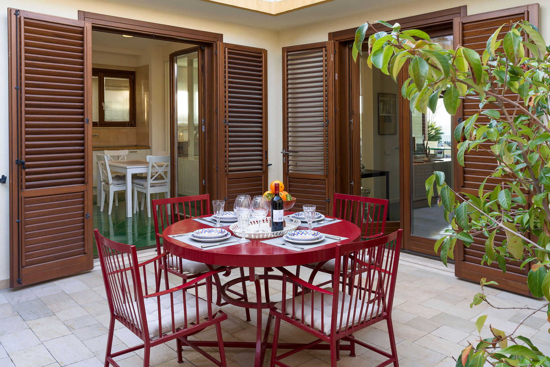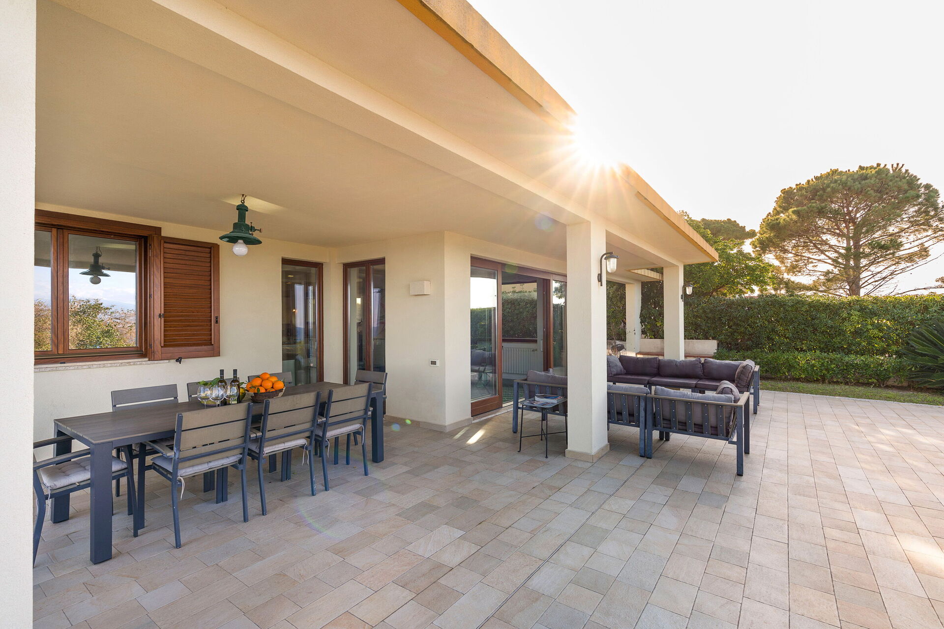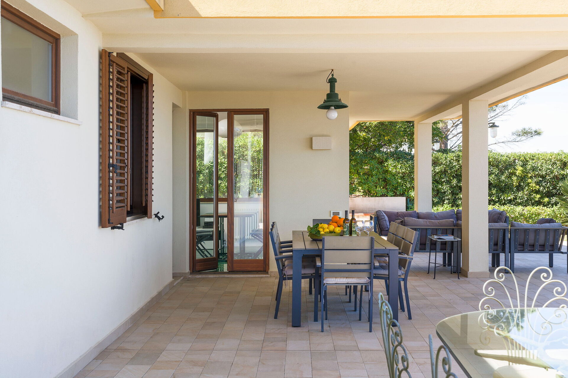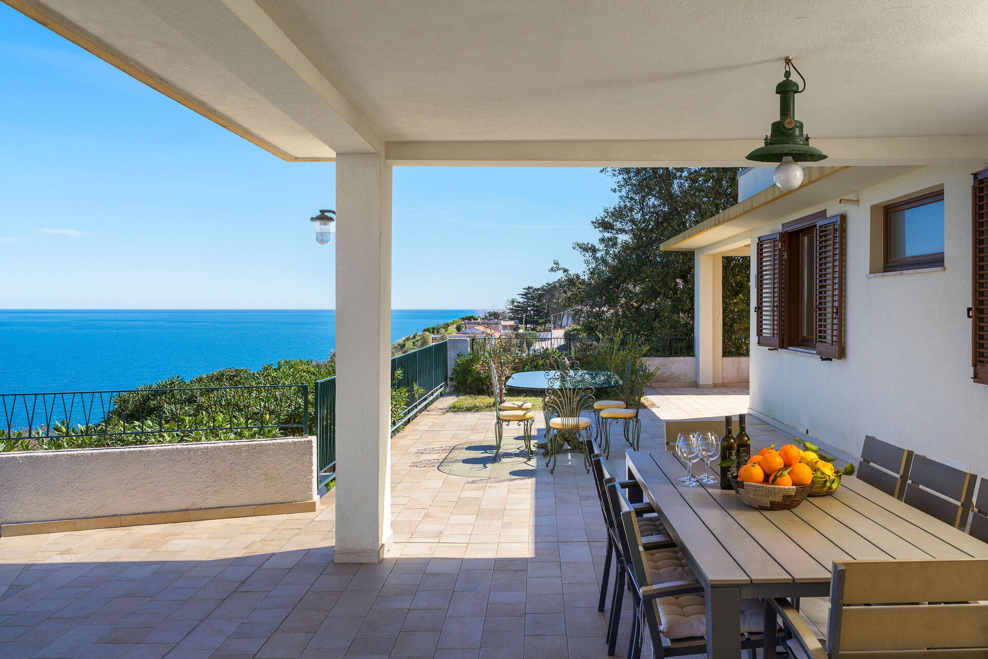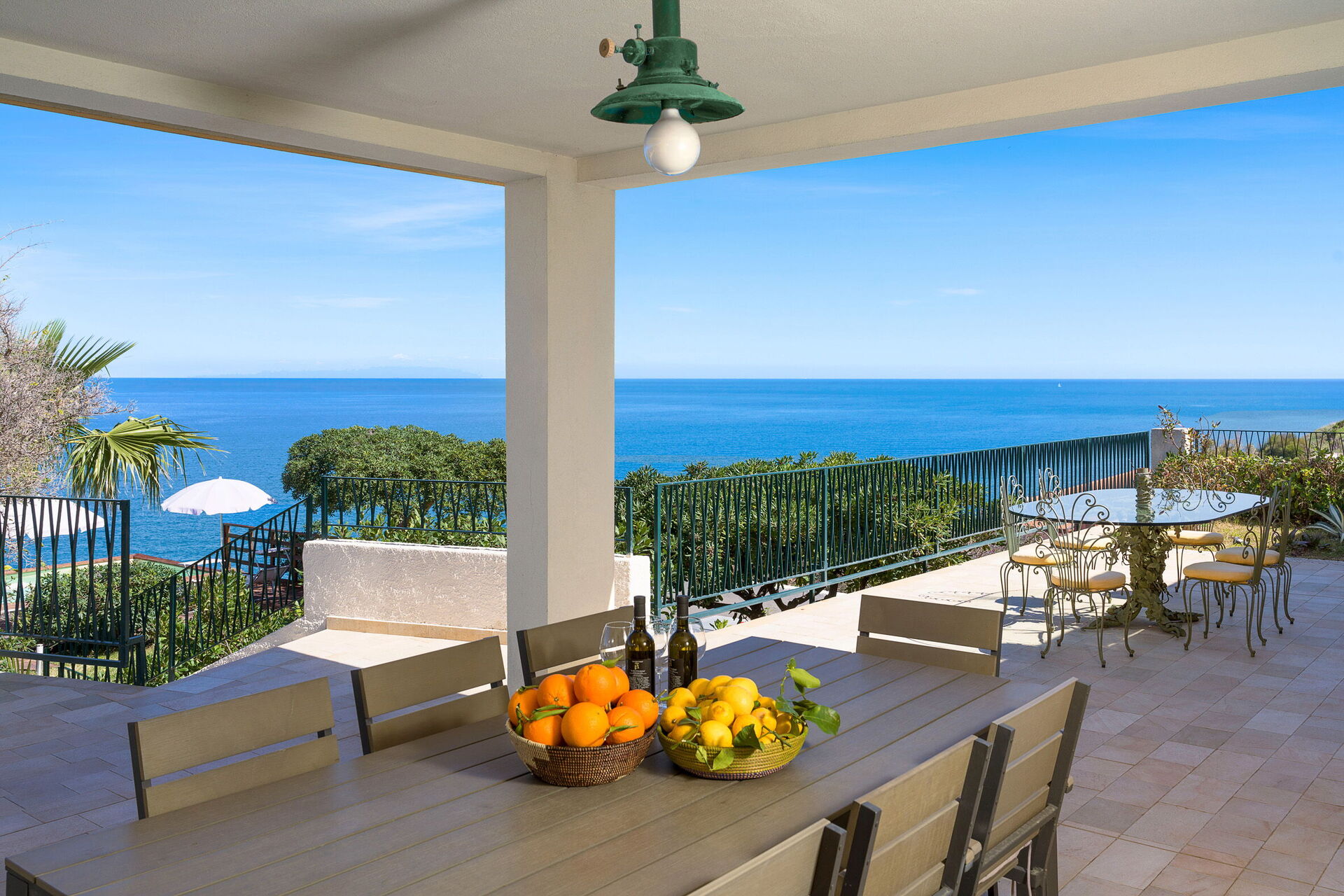 Et utendørs spiseområde under verandaen er eiendommens høydepunkt: her kan du slappe av med et utendørs måltid mens du nyter den fantastisk havutsikten.