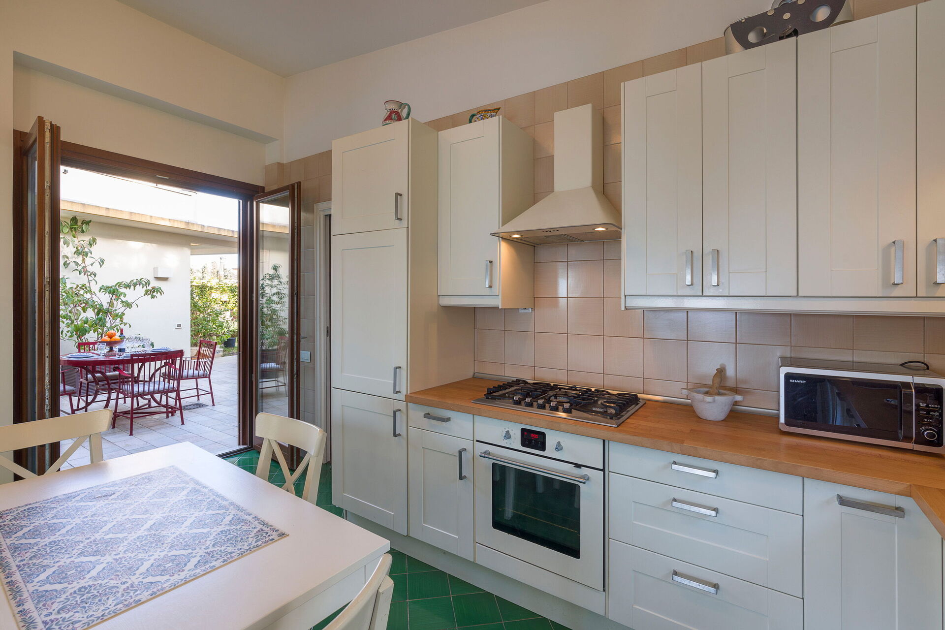 - veranda med utsikt, utstyrt med bord og stoler for utendørs måltider