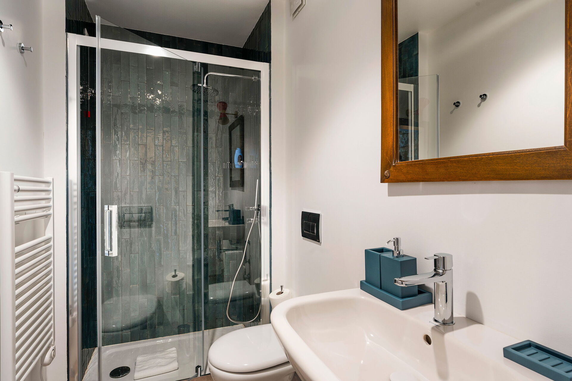 Første etasje: stue (med ekstra enkeltsovesofa på forespørsel) med kjøkkenkrok (kjøleskap, vannkoker, espressomaskin); soverom med dobbeltseng (sengemål: 160 x 200 cm) og eget bad med dusj.