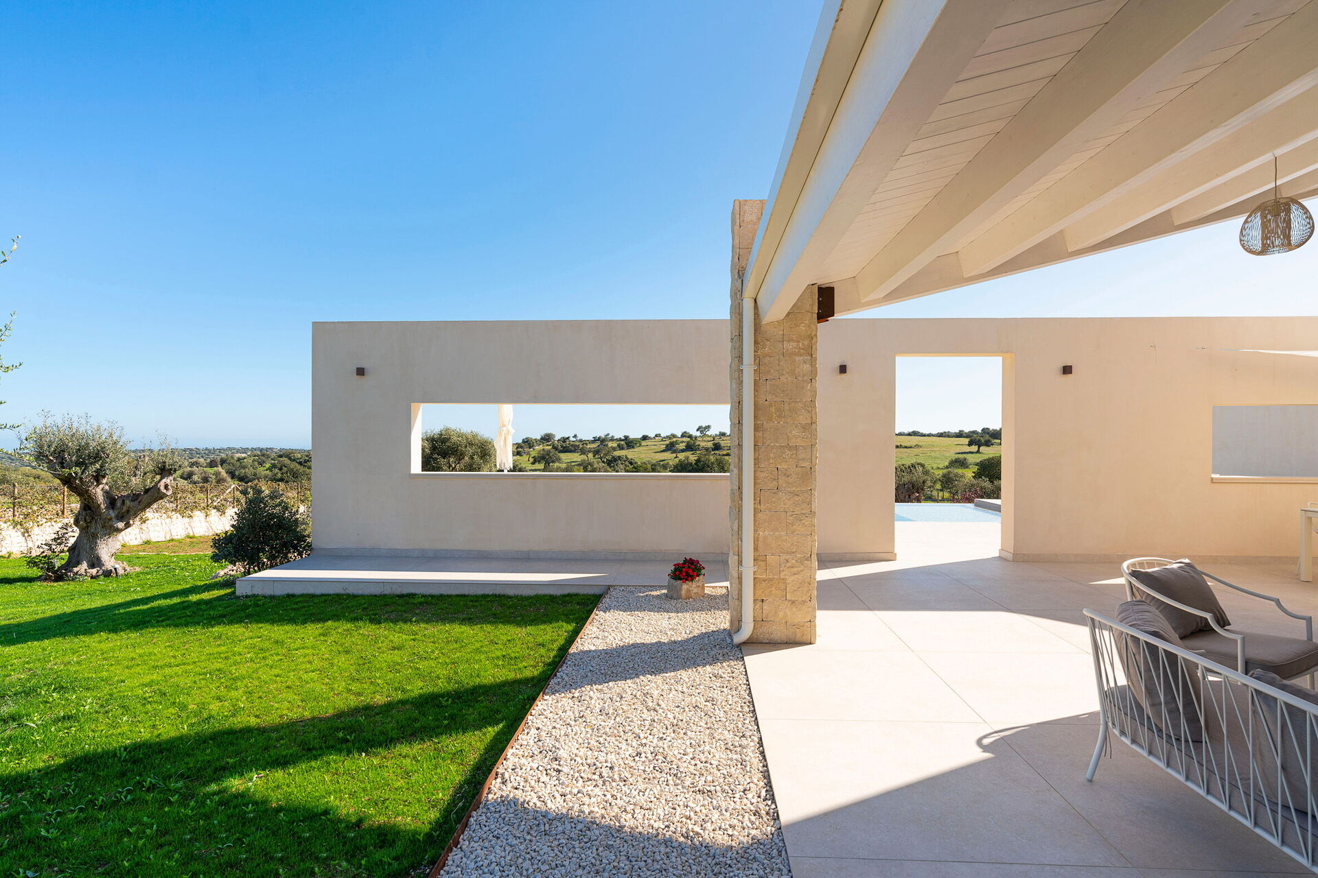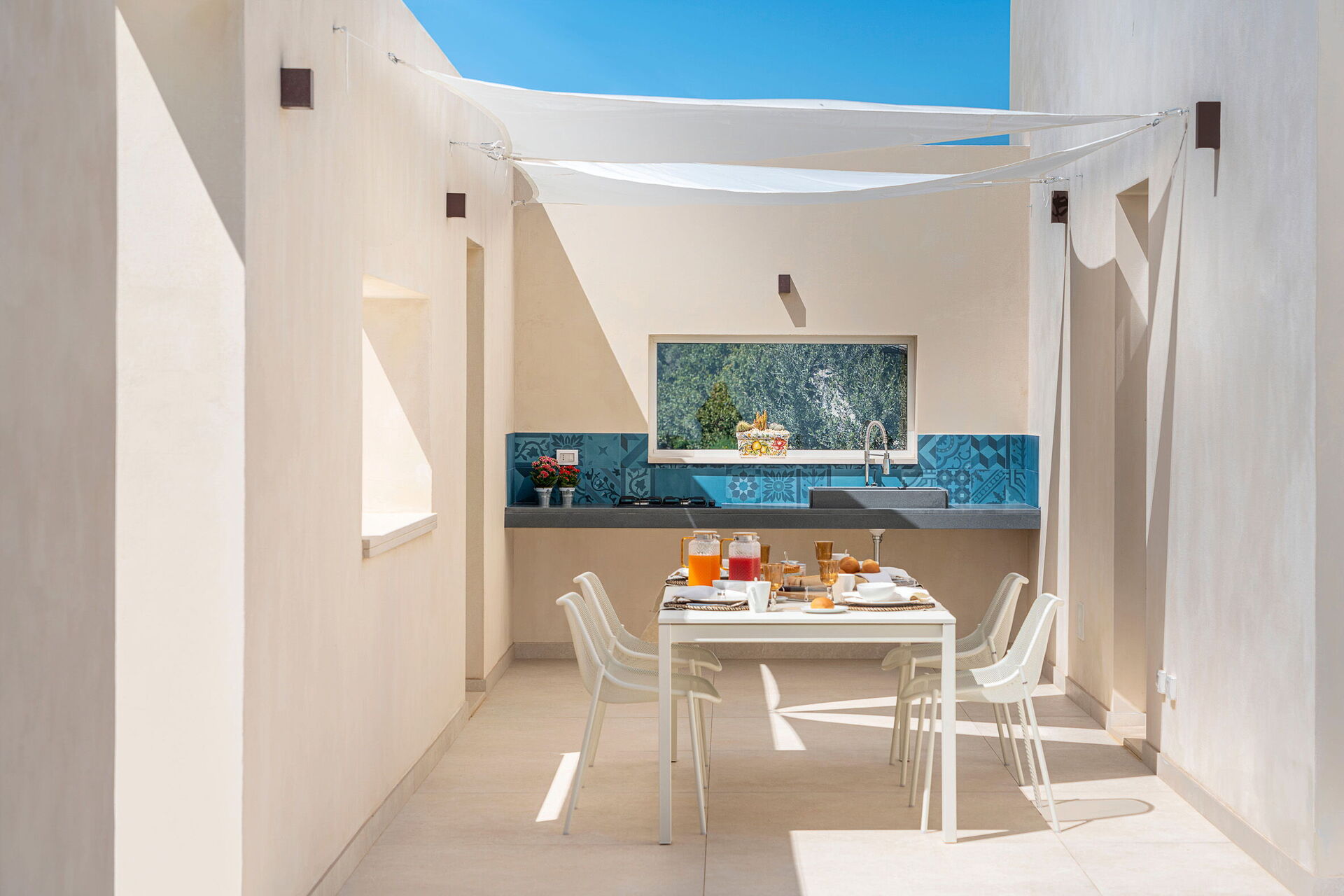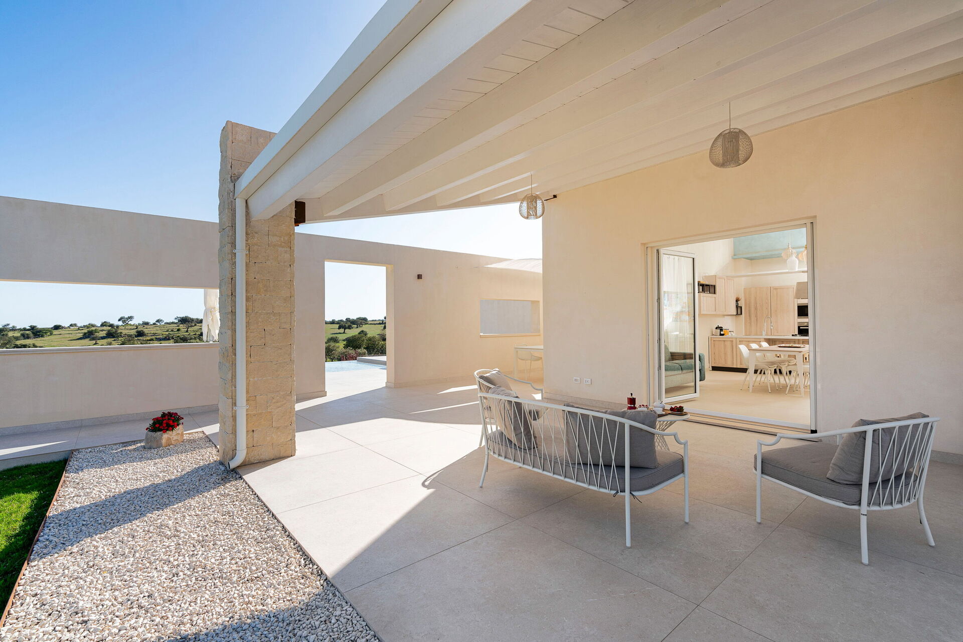 Det omkringliggende landskapet består av oliventrær, johannesbrødtrær og hvite kalkede steinmurer du kan beundre mens du slapper av ved det fantastiske saltvannsbassenget, eller fra en av de store møblerte terrassene. På uteområdet er det også en grill og kjøkken for enkelt å kunne lage mat utendørs under ferien på Sicilia.