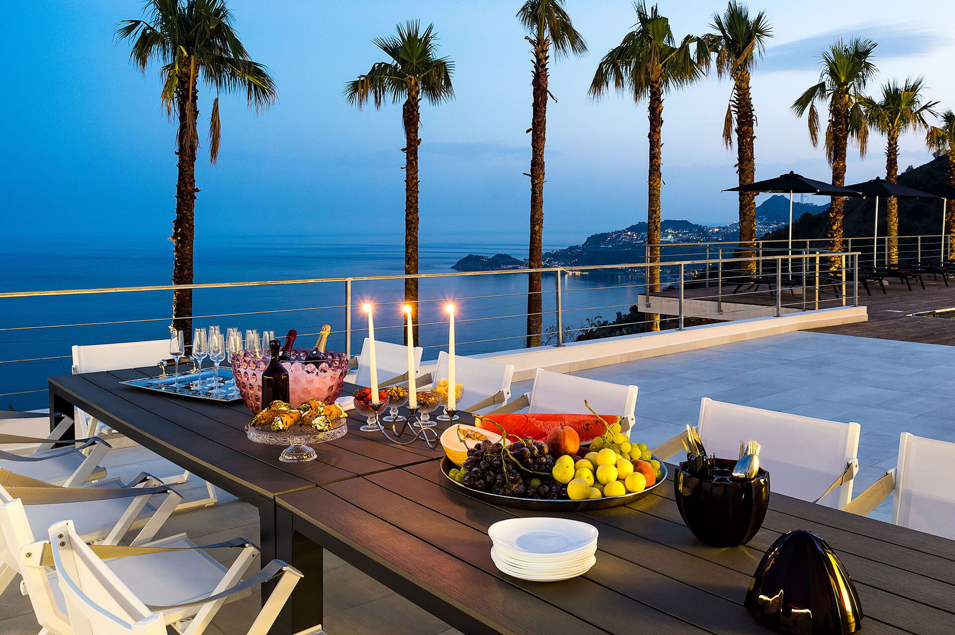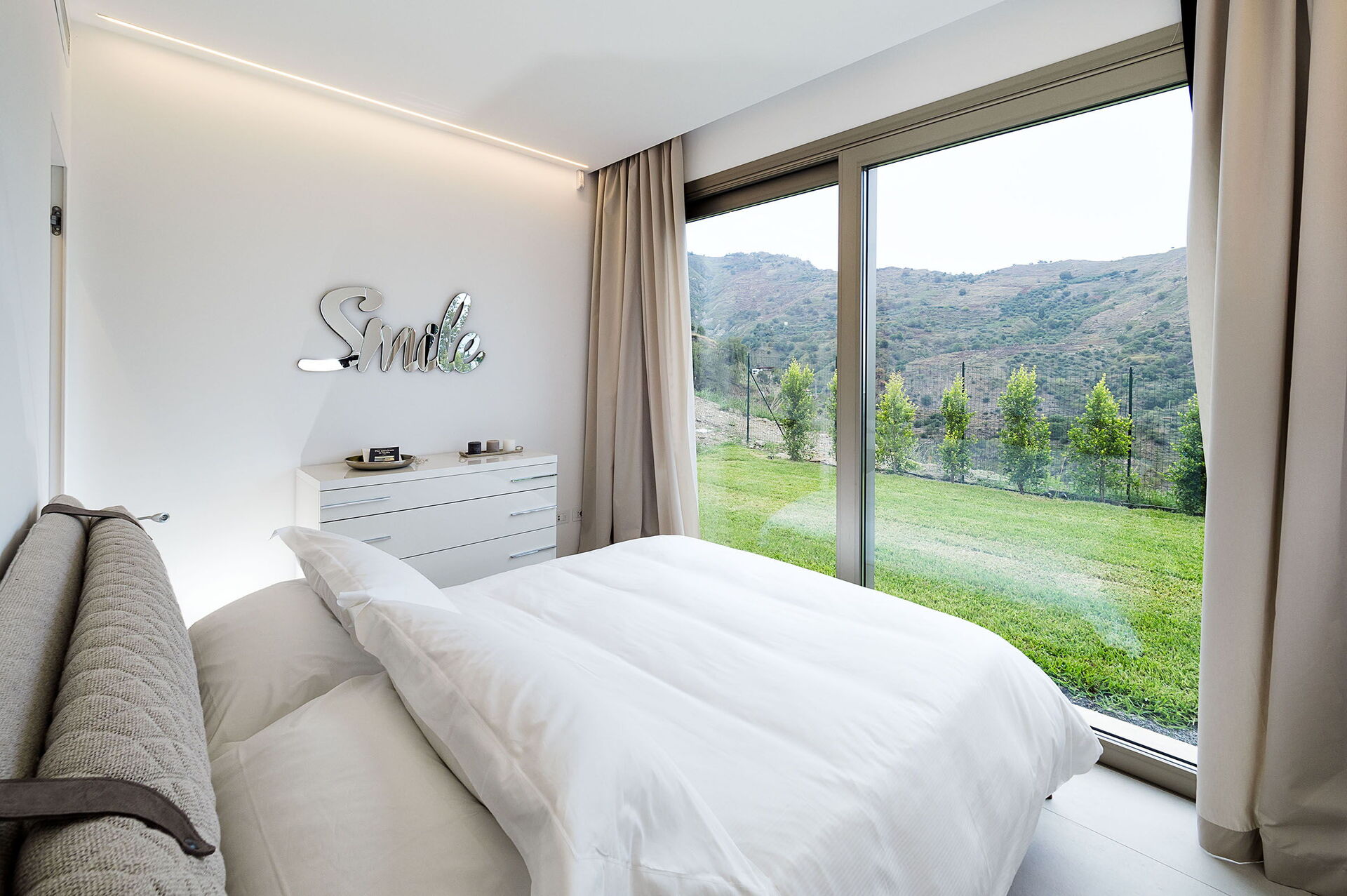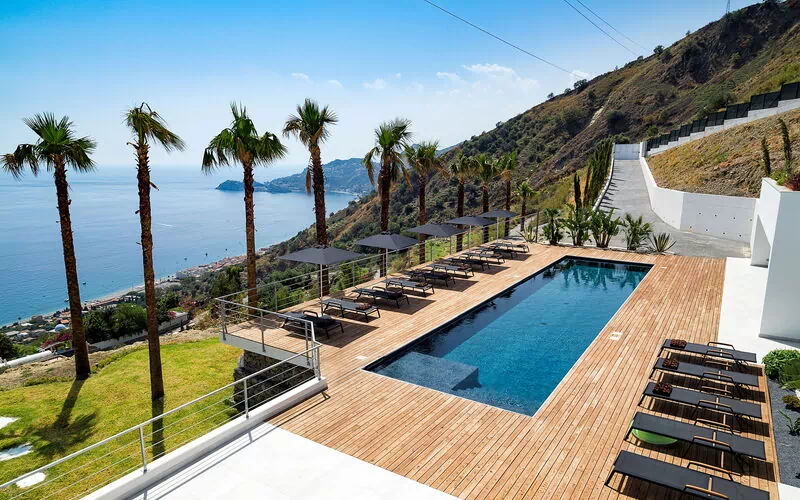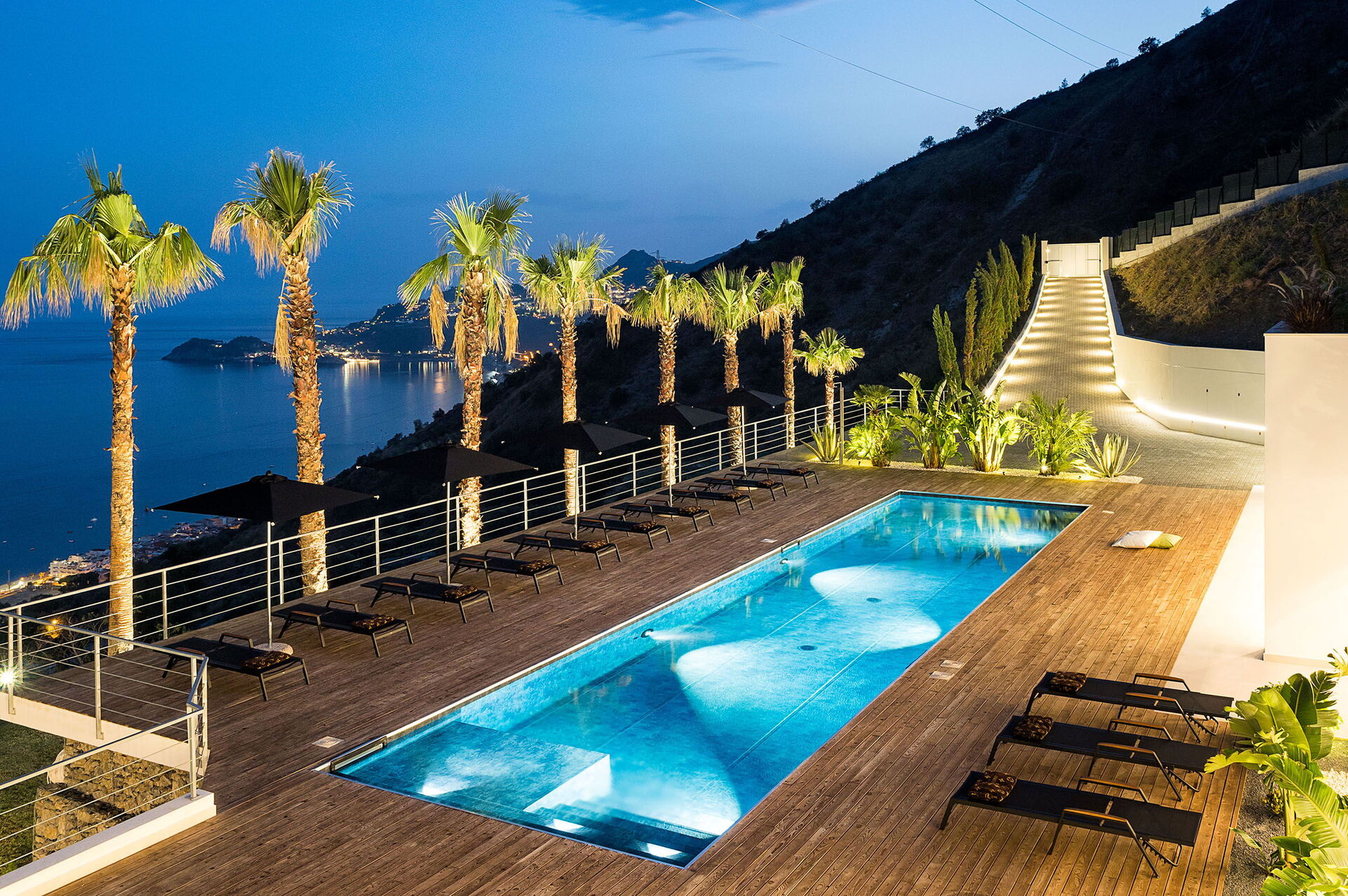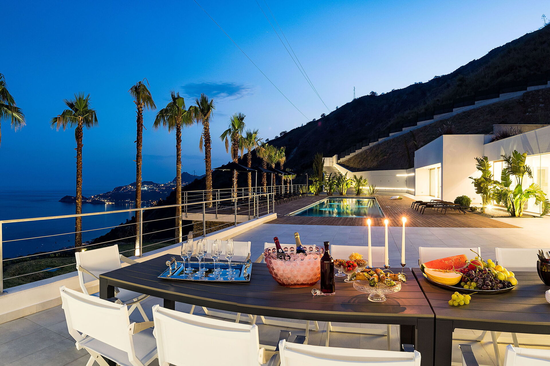 Feriehuset er luksuriøst og moderne med fantastisk utsikt over havet og Taormina-bukten, en utsikt som også beundres fra svømmebassenget med møblert bassengdekk og terrassene.