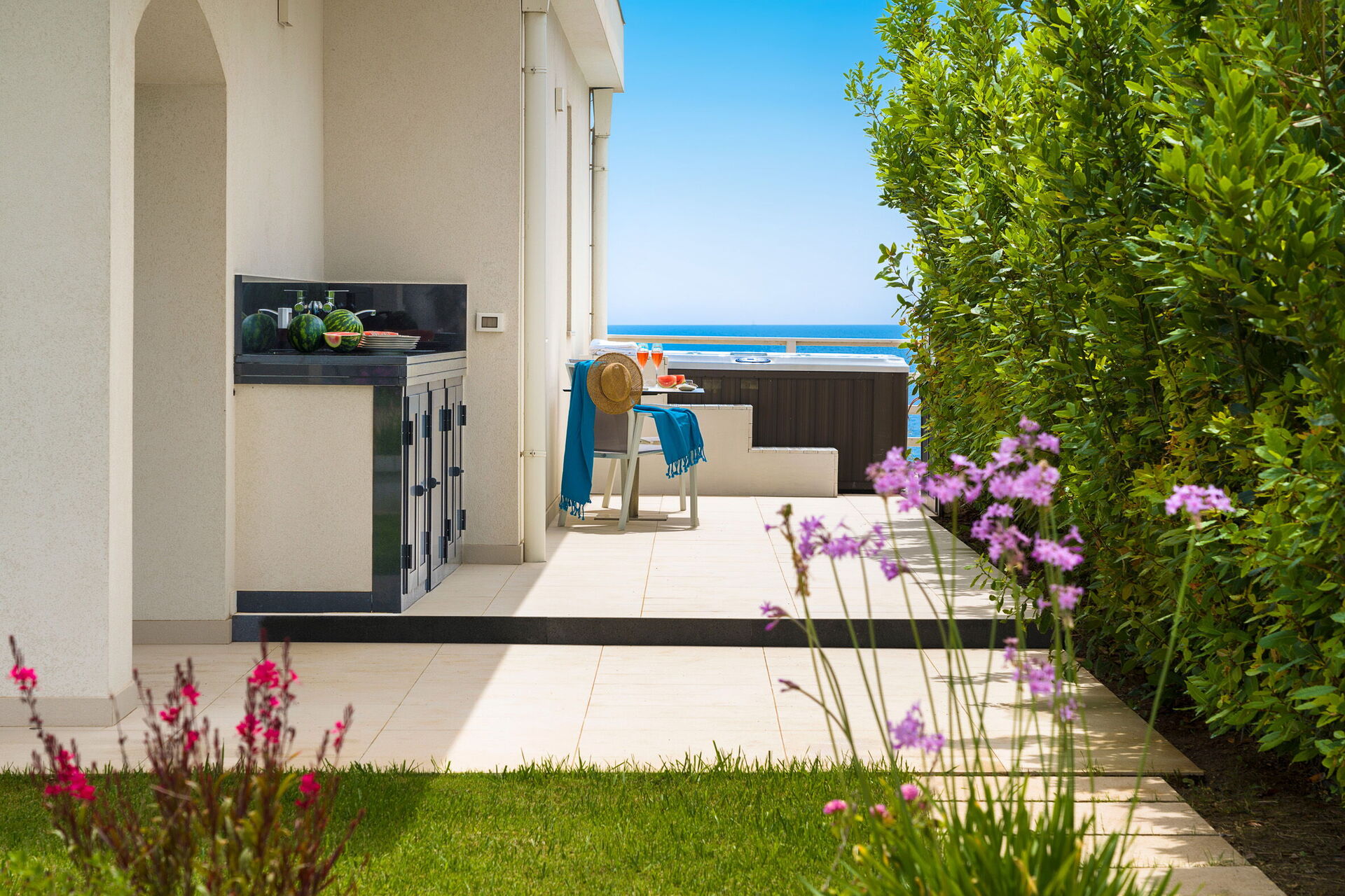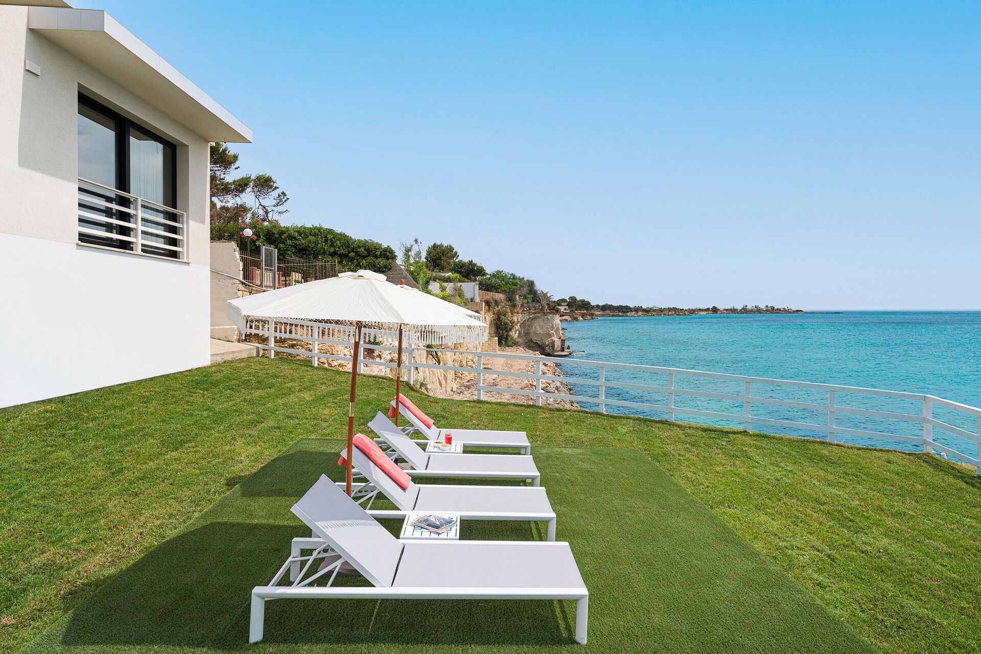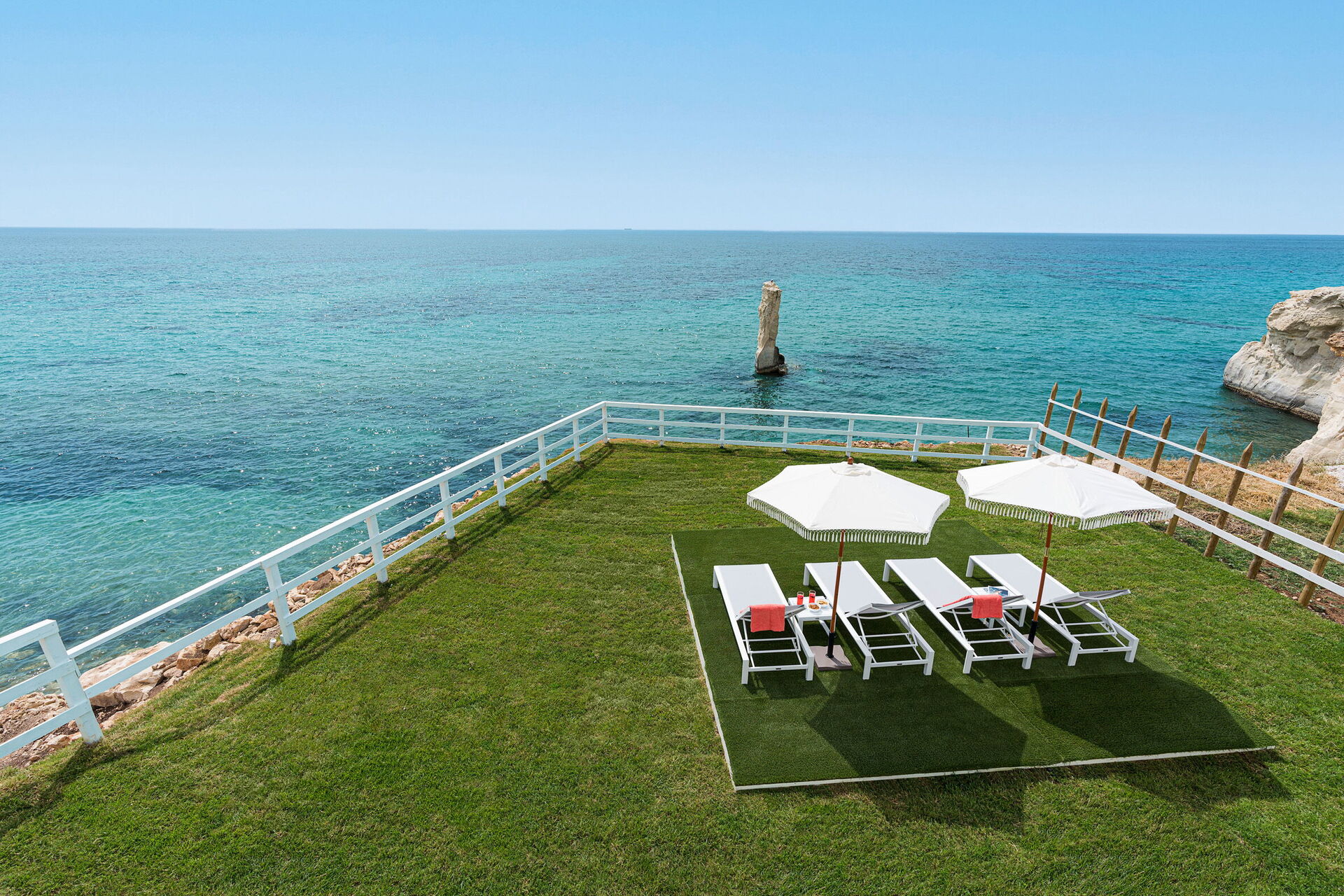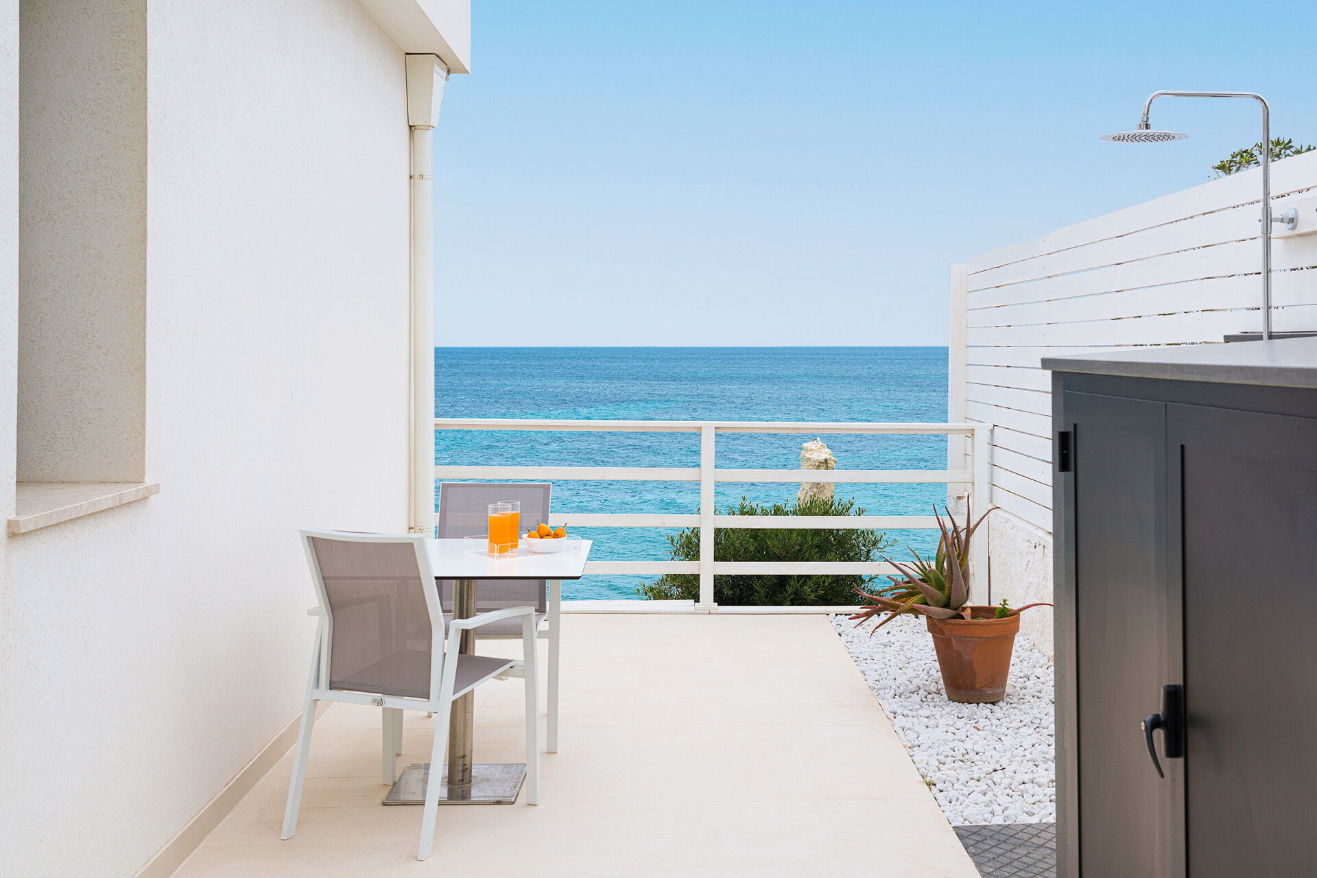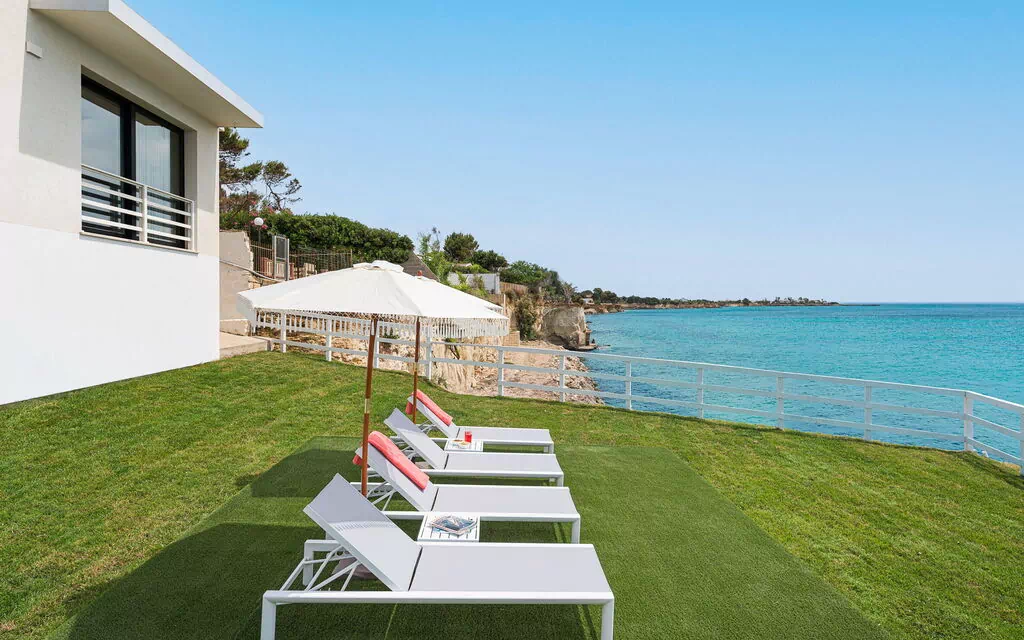 Uteområdene med panoramautsikt har mange fellesarealer, perfekte for trivelige stunder med familie eller venner. Det er også et utendørs og oppvarmet boblebad, direkte tilgang til klippen og havet.