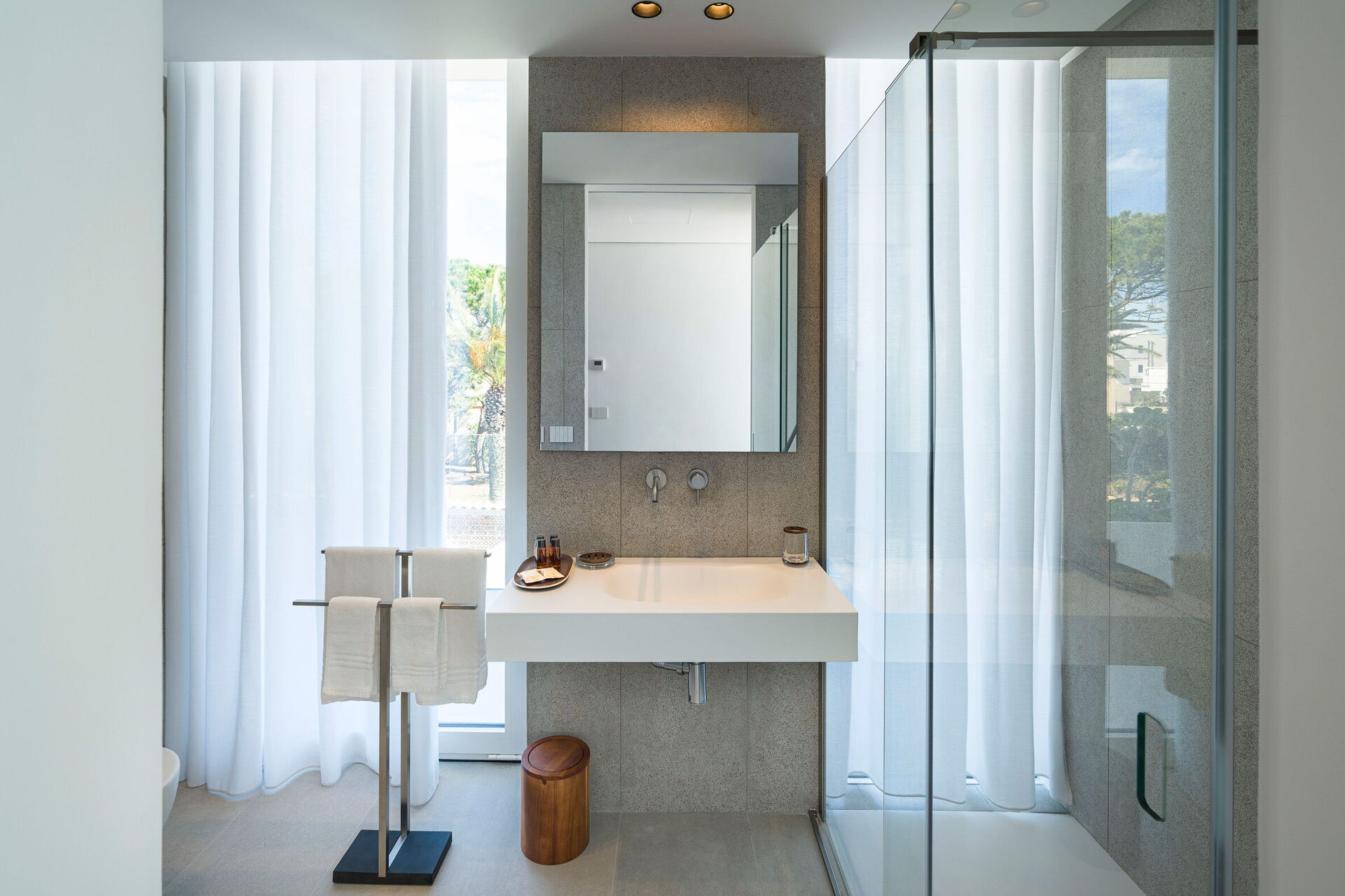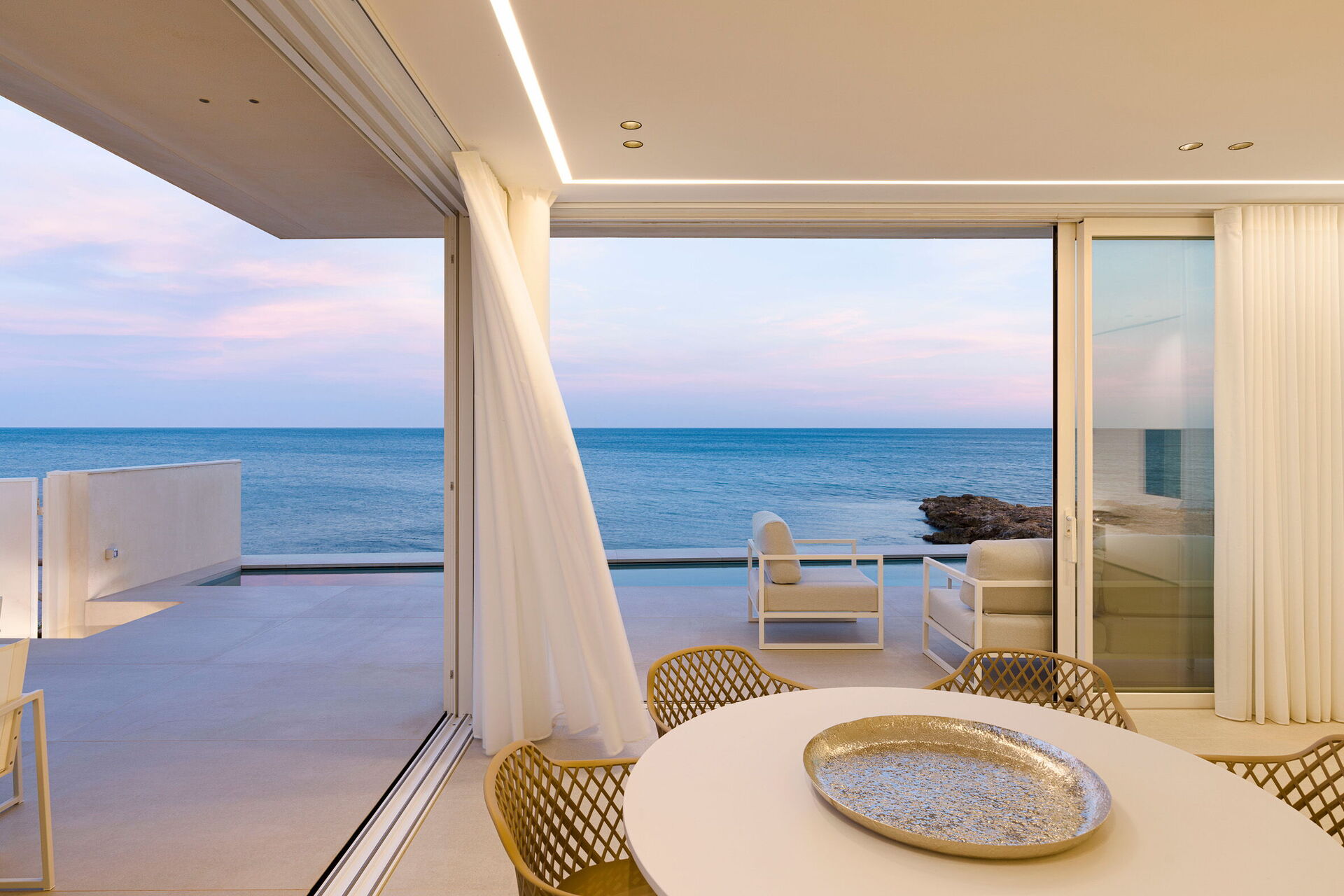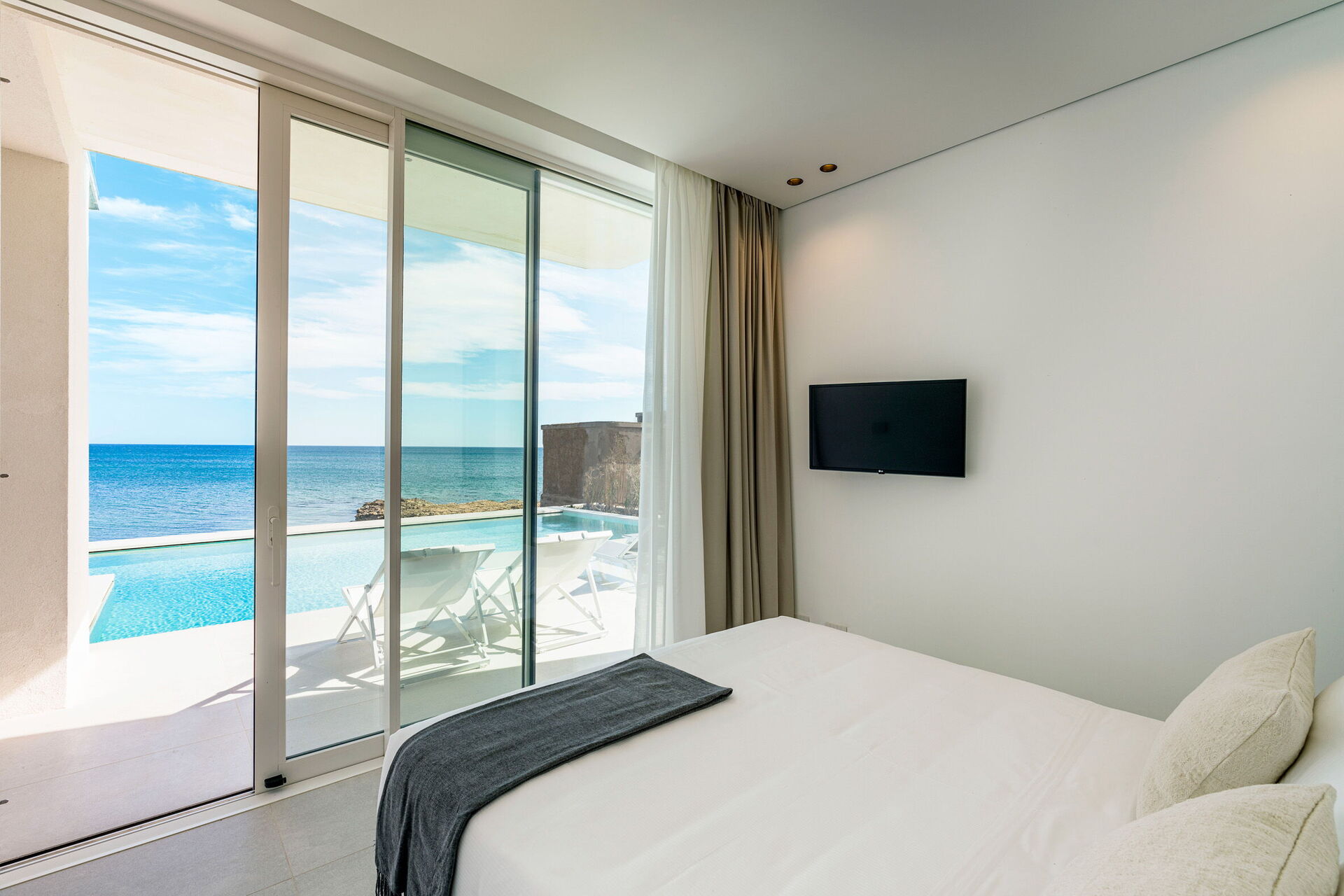 Uteområdene med panoramautsikt er fantastiske, slapp av i det oppvarmede utendørsbassenget med hydromassasjeområde eller på den store terrassen vendt mot havet!