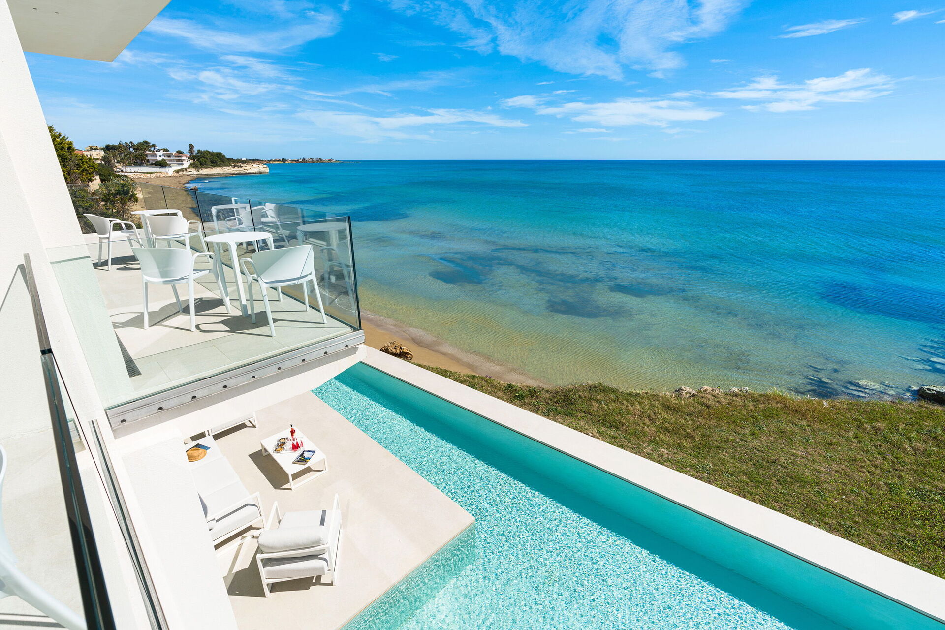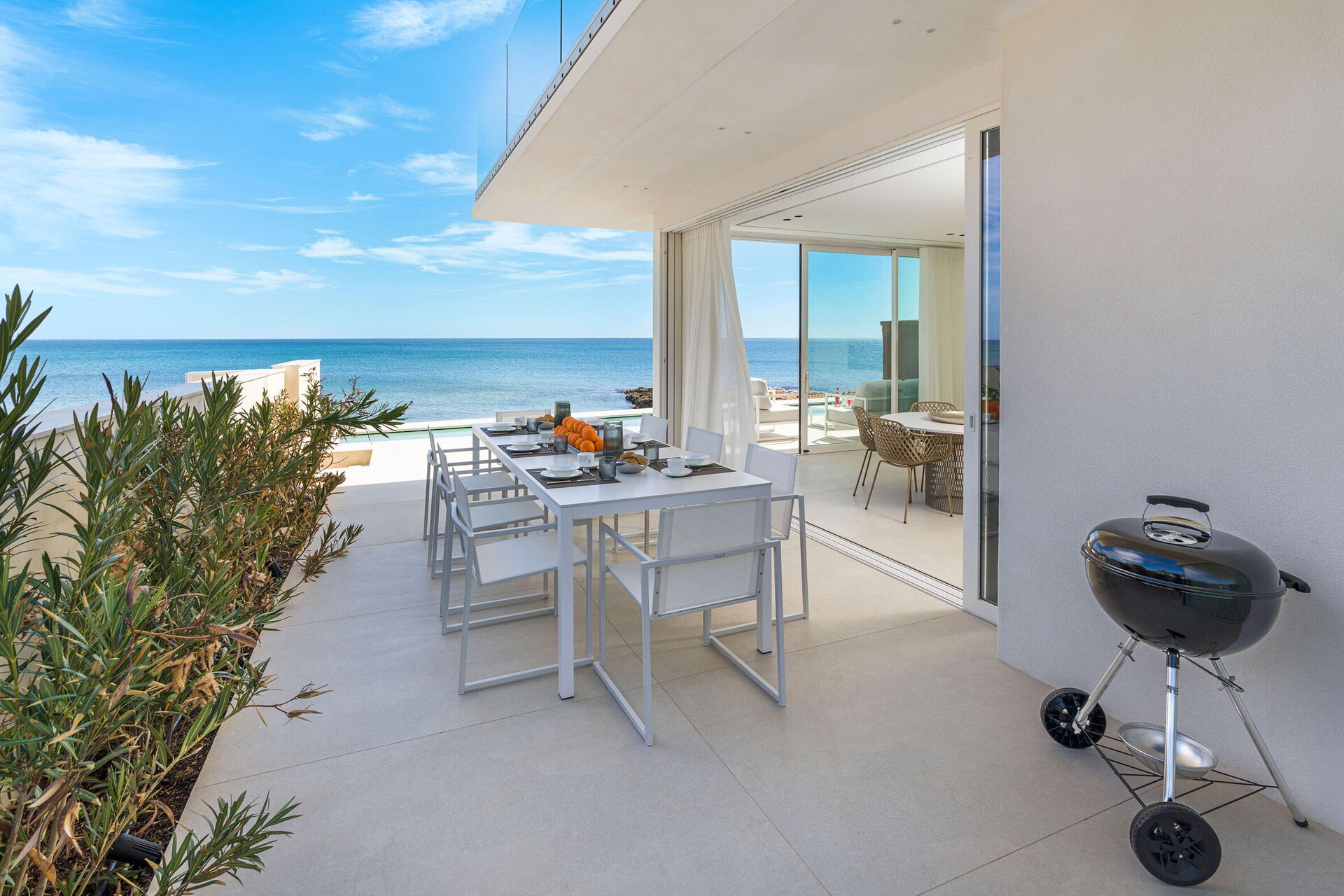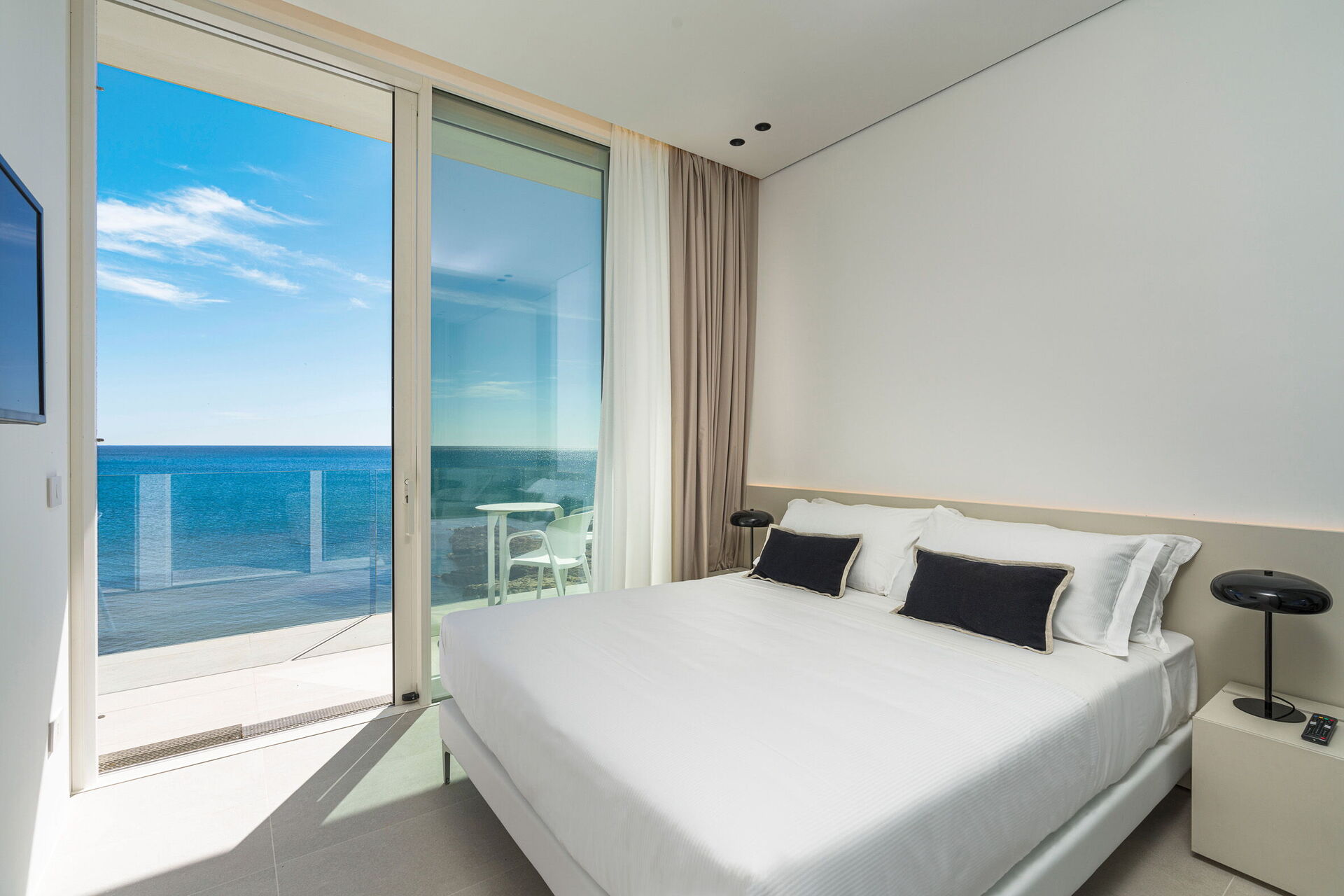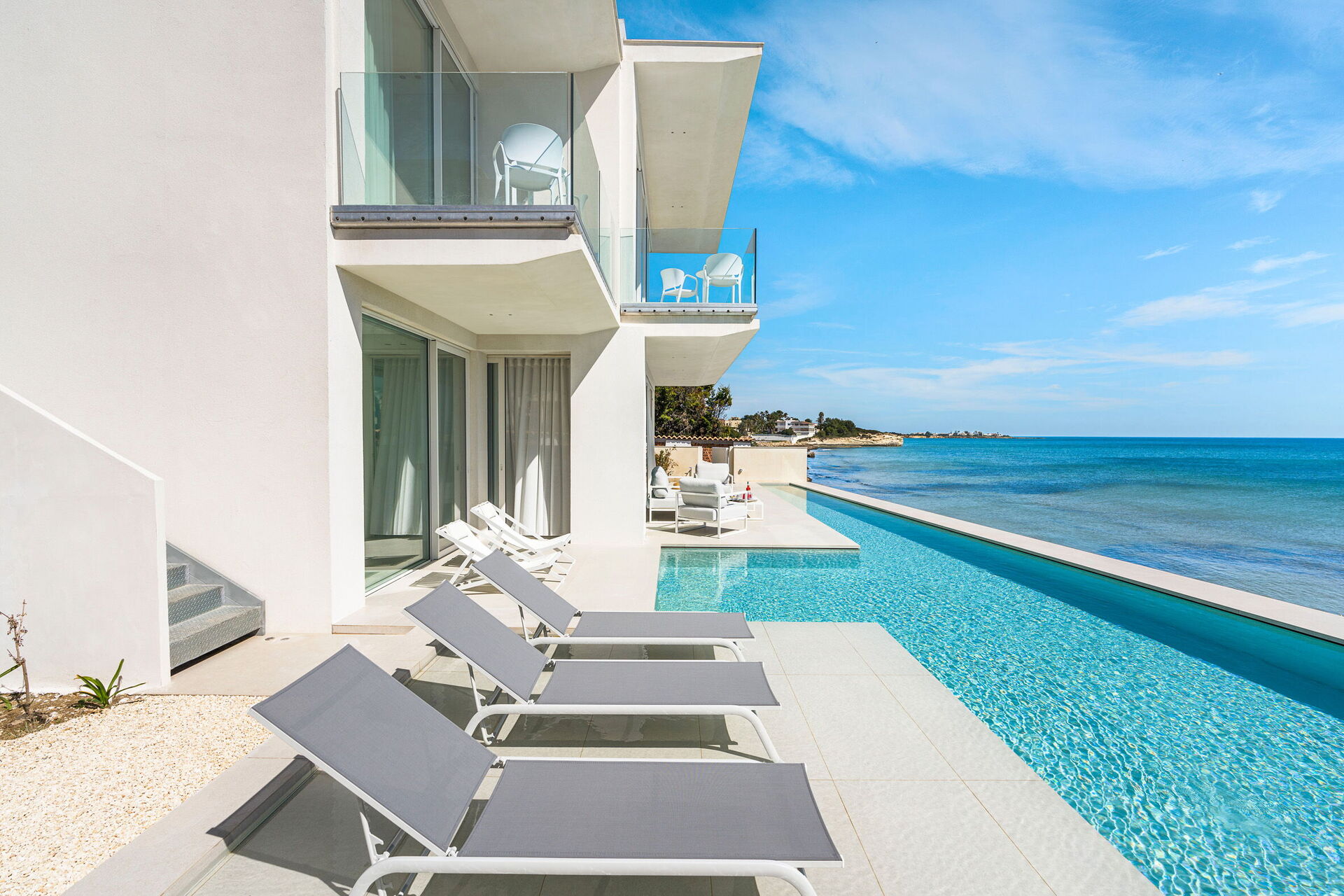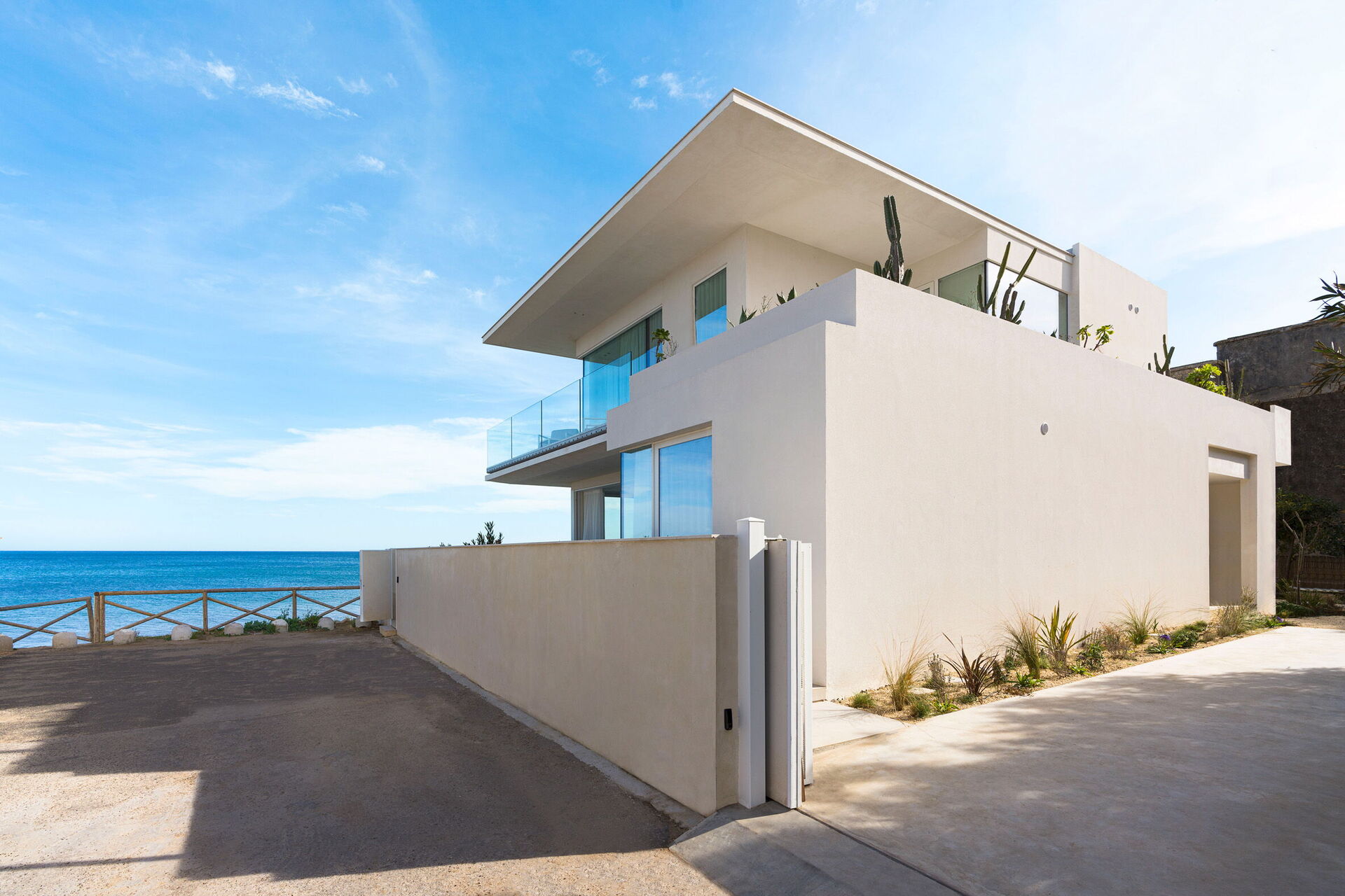 Huset har to etasjer, 4 soverom (alle fire med eget bad og en terrasse vendt mot havet), og kan komfortabelt innkvartere opptil 8 personer. Interiøret er innbydende, og lyst med komfortable moderne møbler og store panoramavinduer med utsikt over havet.