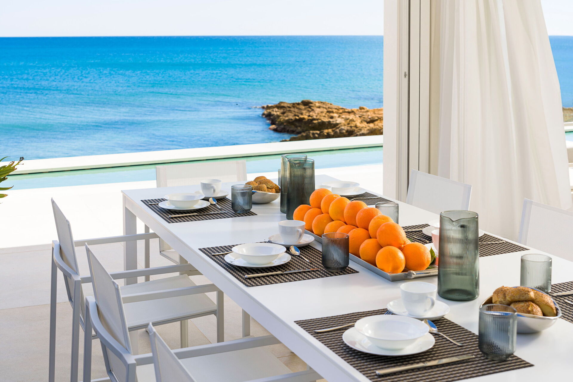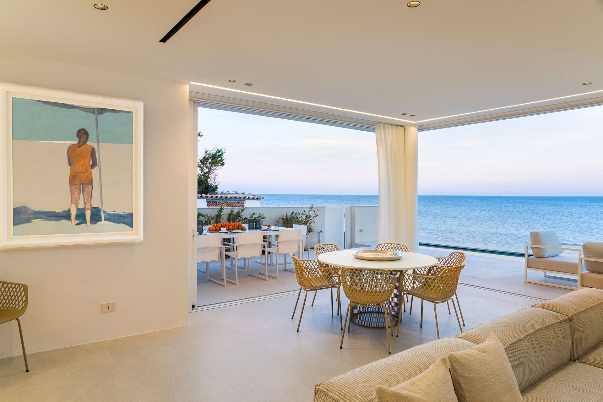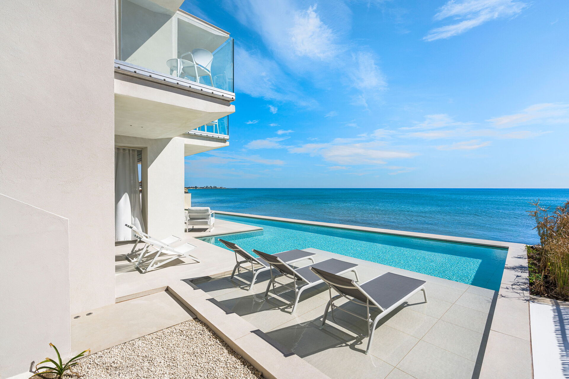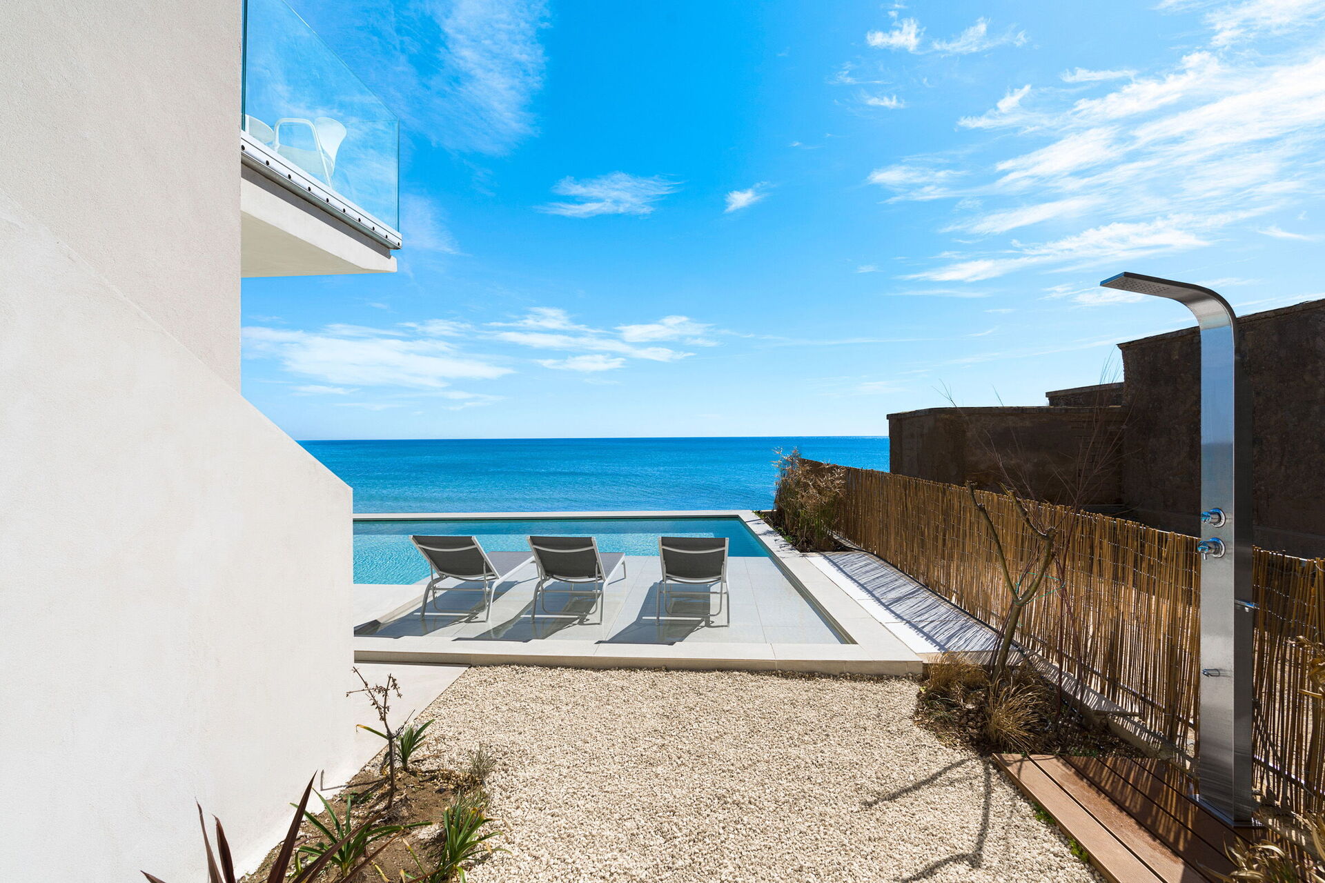 Huset har to etasjer, 4 soverom (alle fire med eget bad og en terrasse vendt mot havet), og kan komfortabelt innkvartere opptil 8 personer. Interiøret er innbydende, og lyst med komfortable moderne møbler og store panoramavinduer med utsikt over havet.