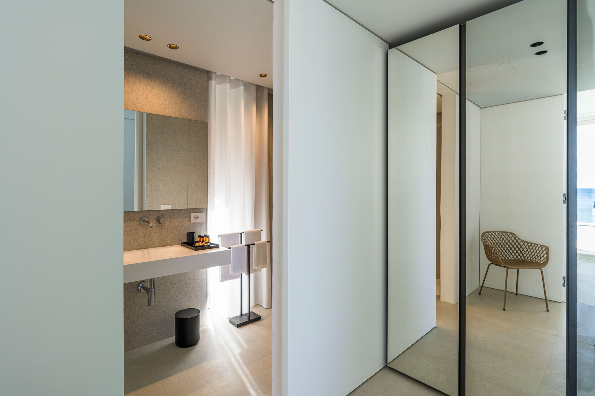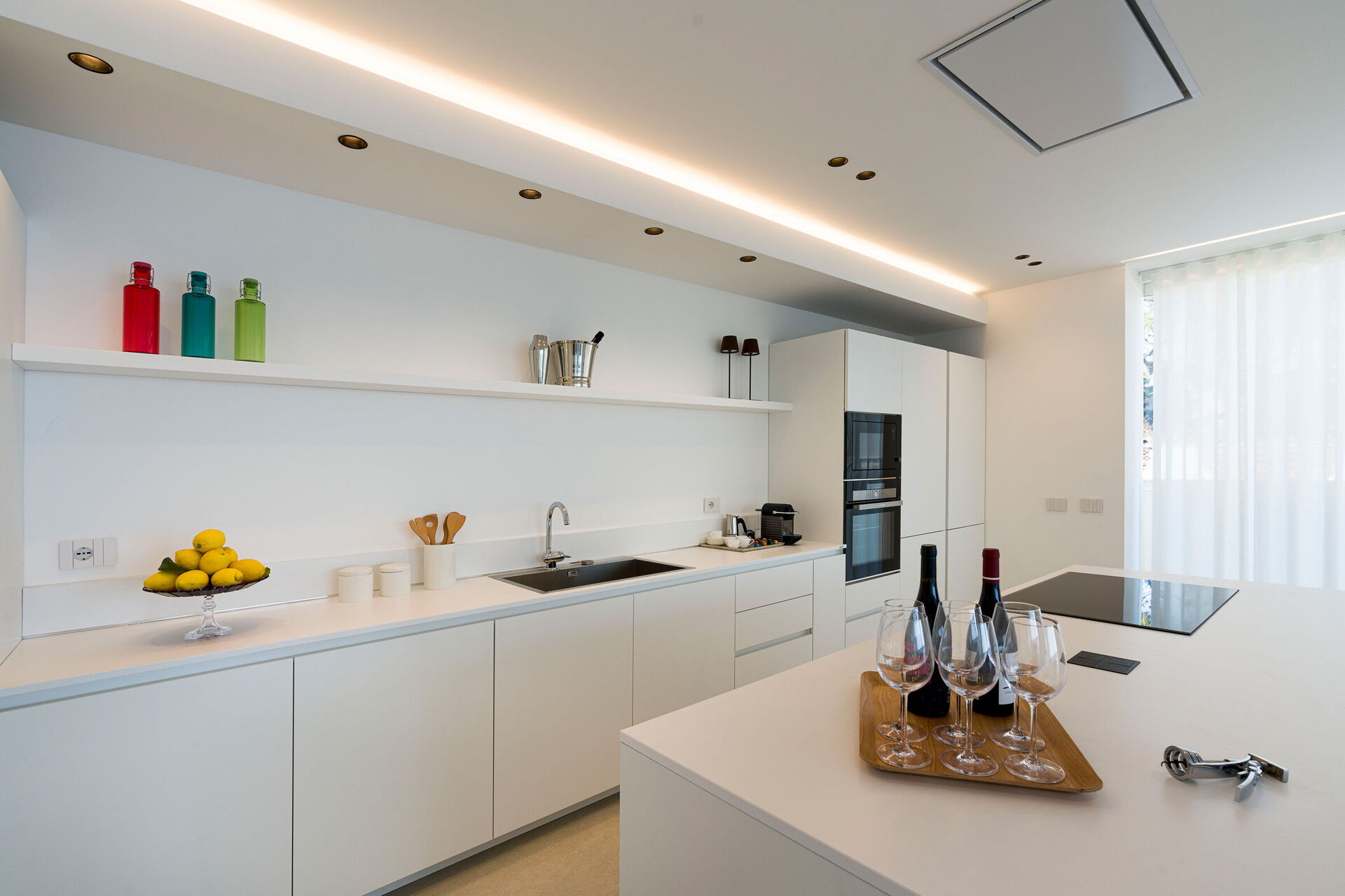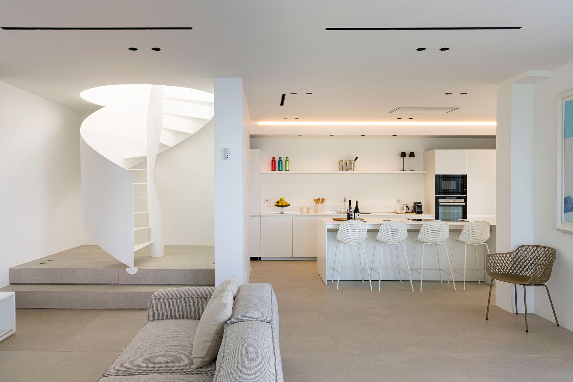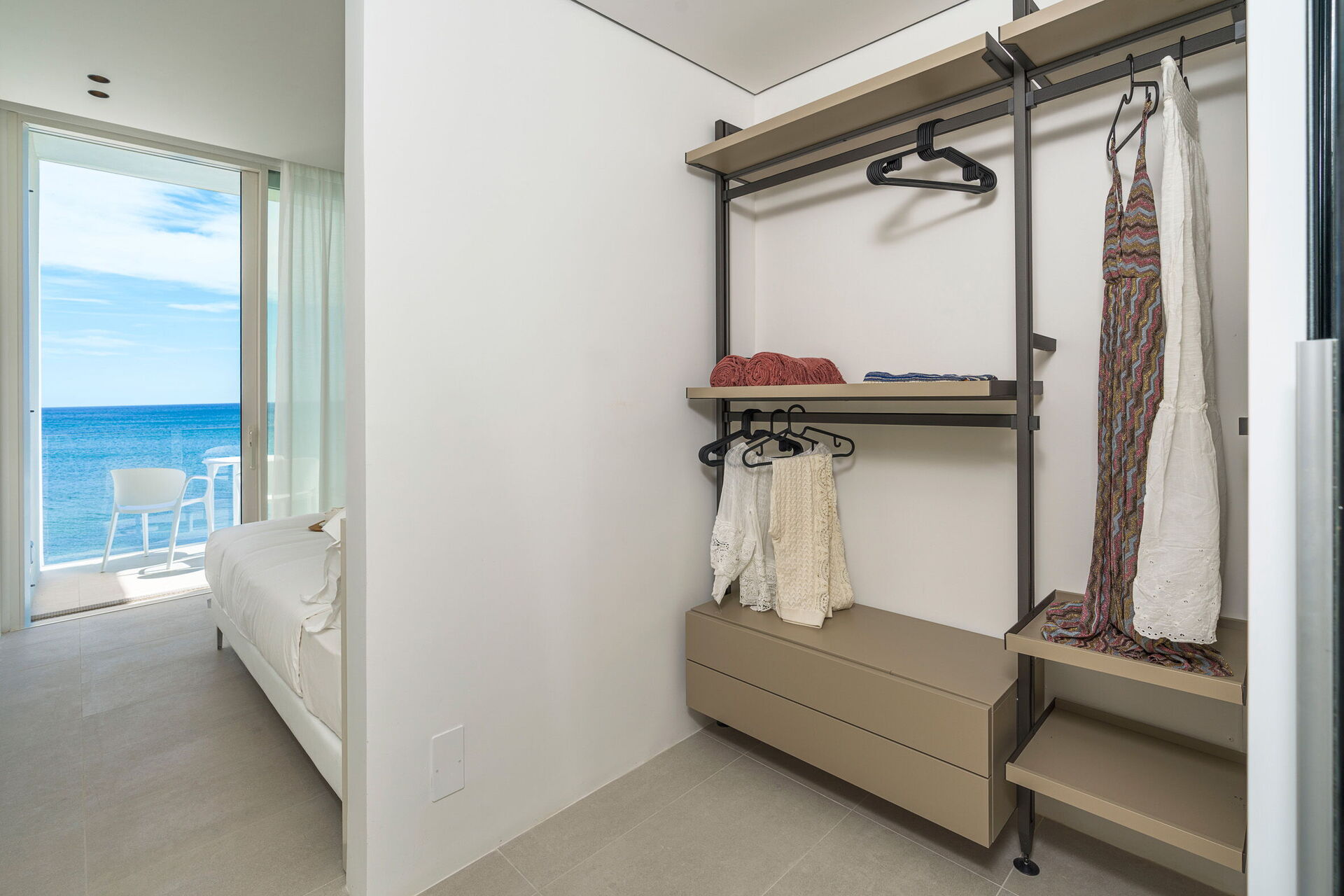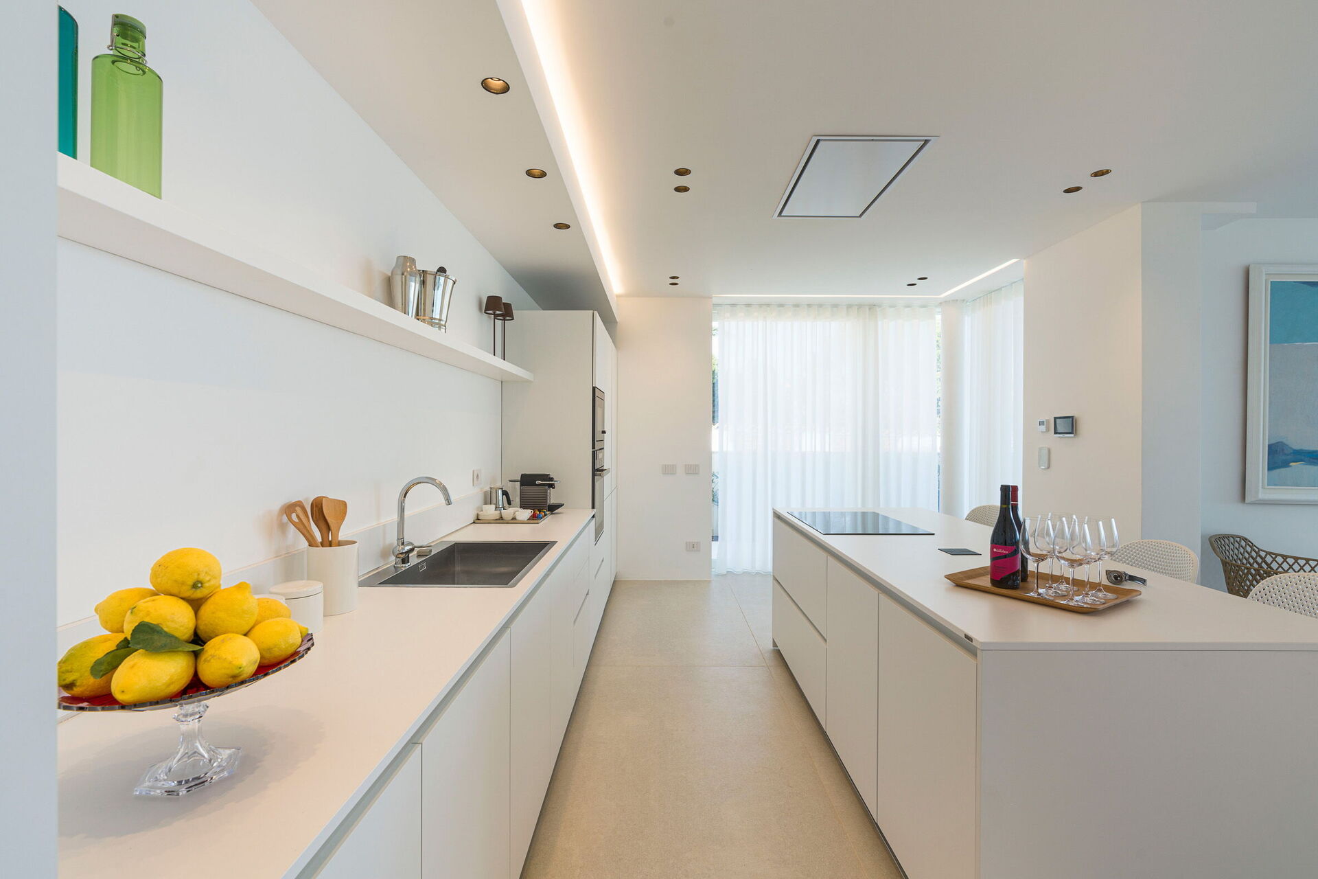 Huset har to etasjer, 4 soverom (alle fire med eget bad og en terrasse vendt mot havet), og kan komfortabelt innkvartere opptil 8 personer. Interiøret er innbydende, og lyst med komfortable moderne møbler og store panoramavinduer med utsikt over havet.