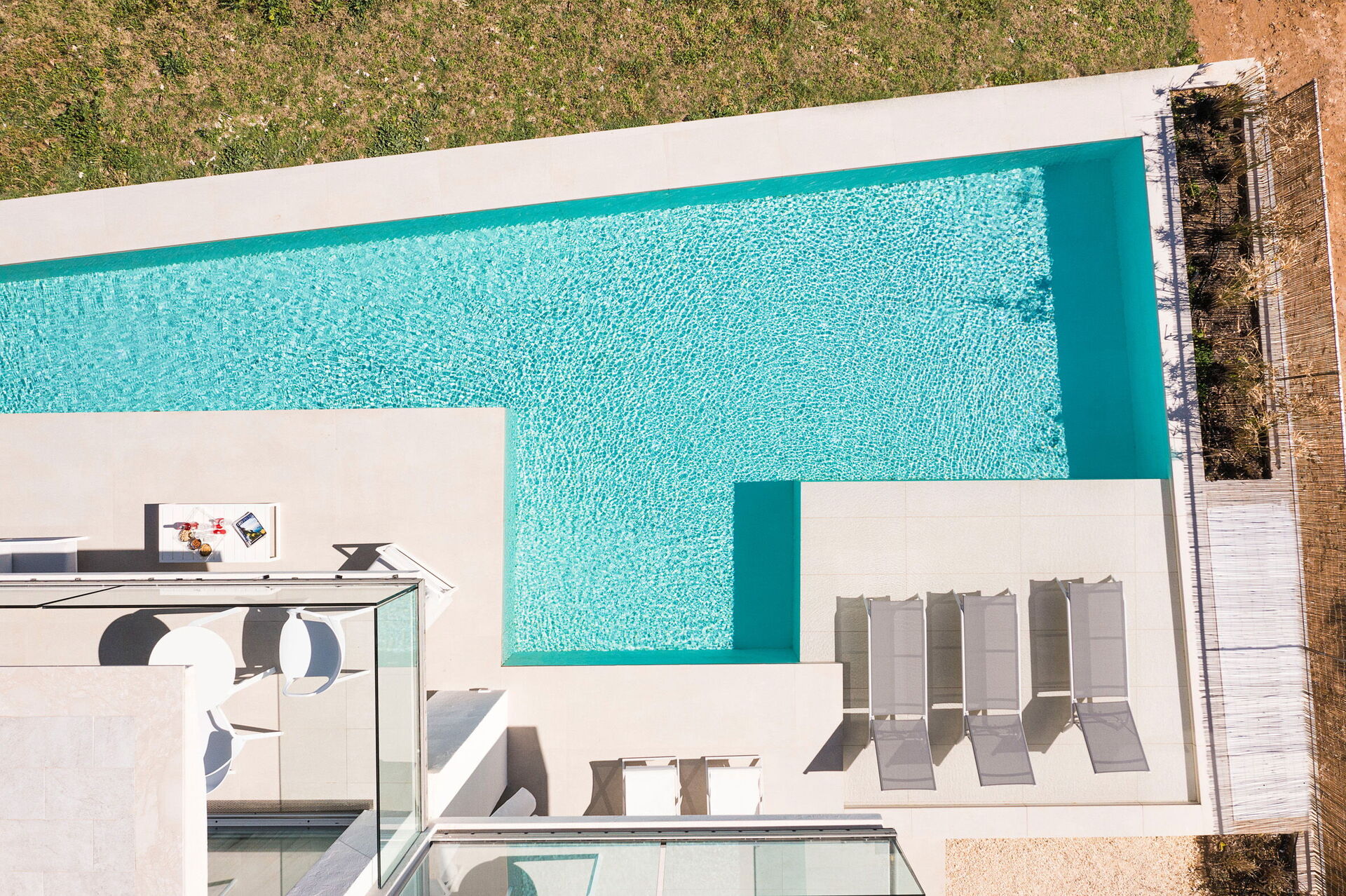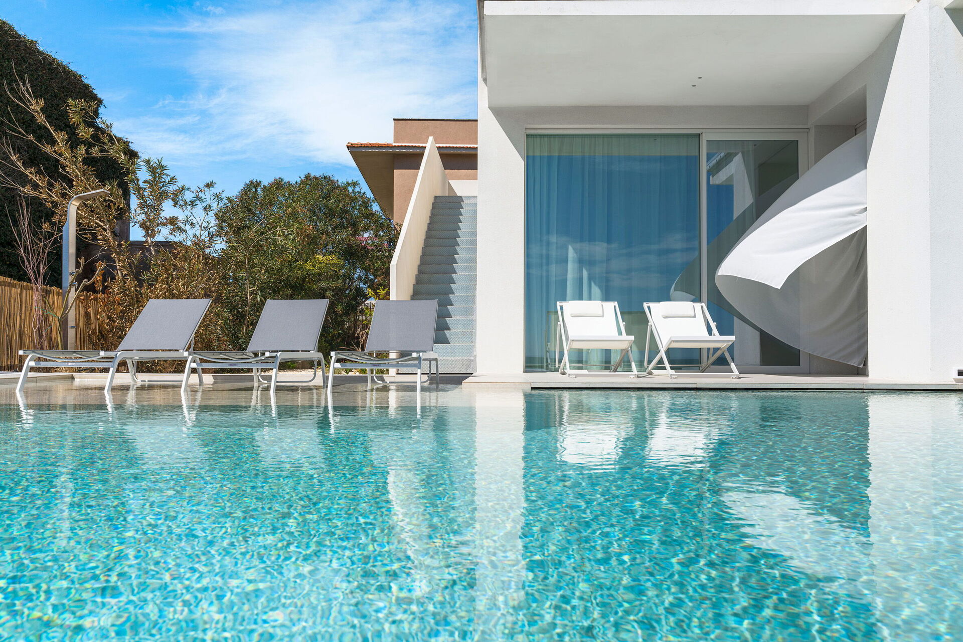 - Privat svømmebasseng med hydromassasjeområde (17 x 3.5 m; dybde: 1.20 m; oppvarmet 24-26°C; saltvann rensesystem)