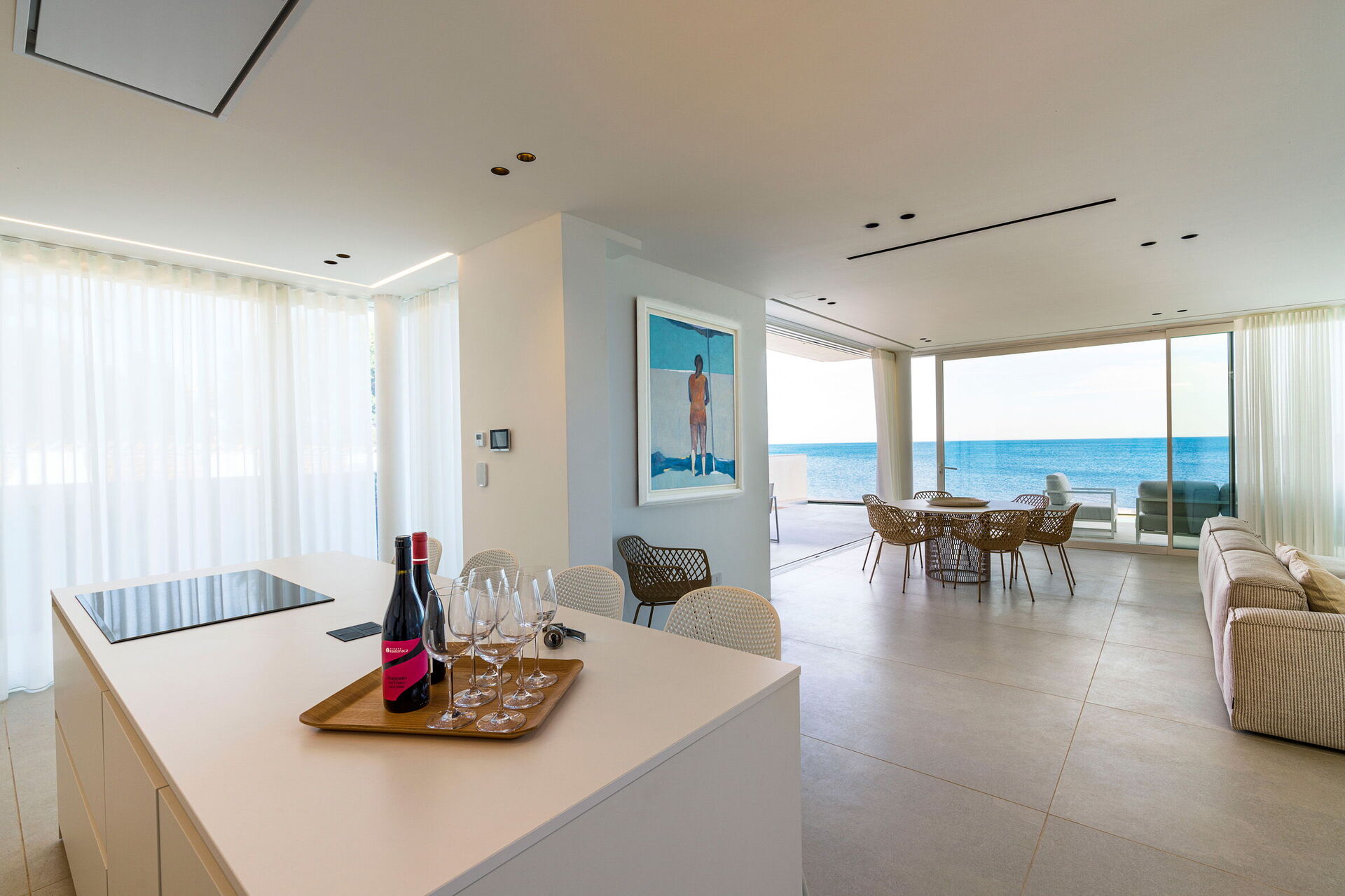 Stue (aircondition) med store vinduer med utsikt over havet, spisestue og kjøkken (stekeplater, stekeovn, kjøleskap, fryser, oppvaskmaskin, mikrobølgeovn, brødrister, espressomaskin, kaffetrakter), 1 dobbeltrom (aircondition) med privat bad med dusj