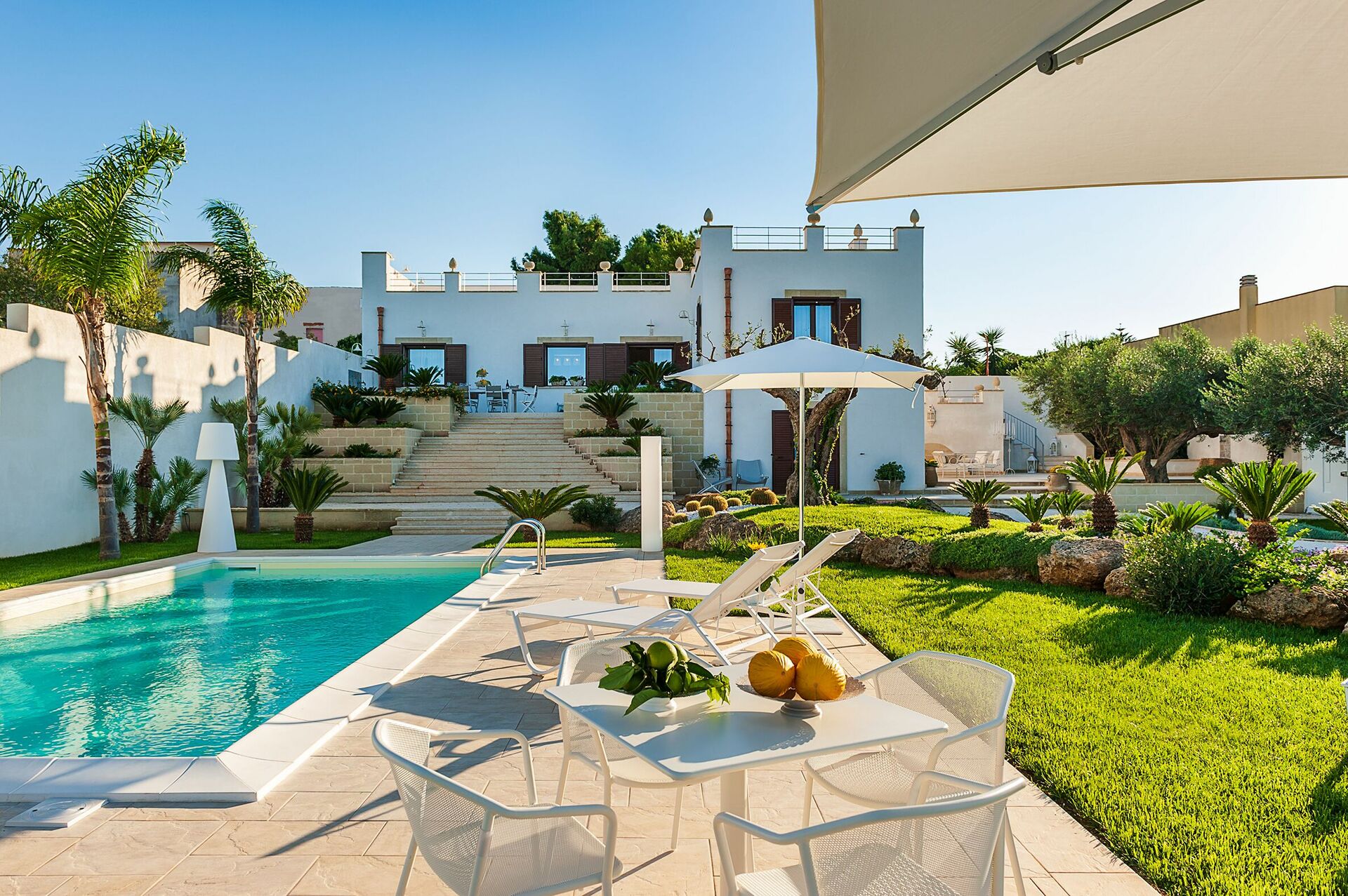 Feriehuset er omgitt av en vakker hage der man finner et svømmebasseng, store terrasser med panoramautsikt og et privat velværerom.