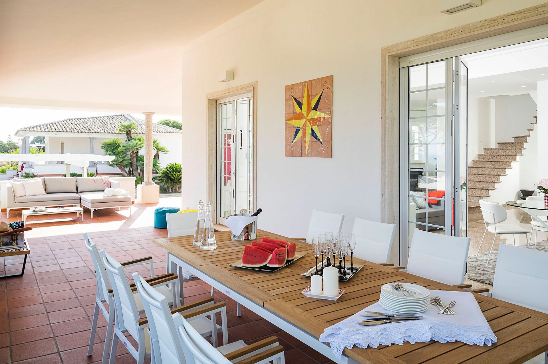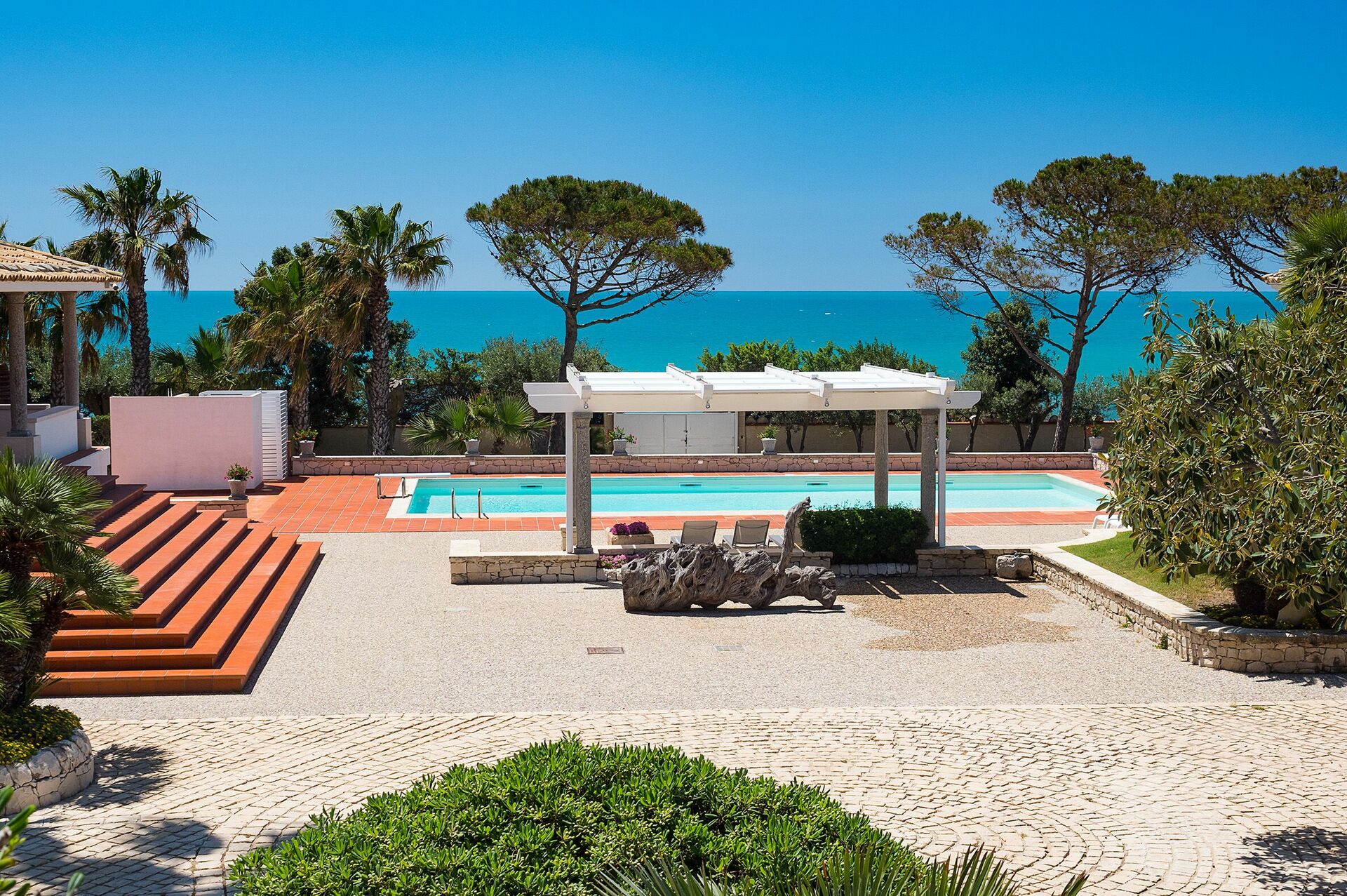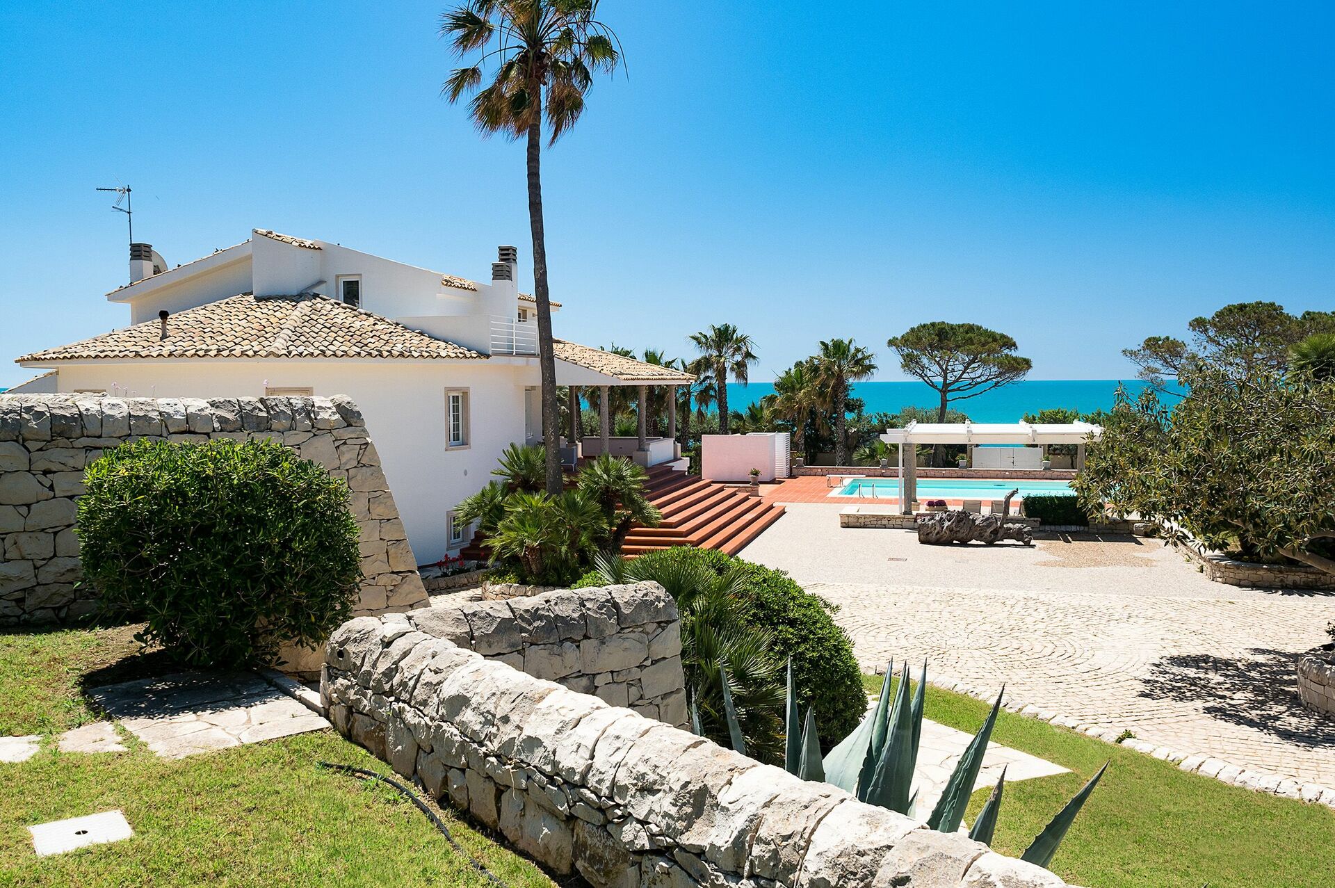 Dette store feriehuset er omgitt av en frodig hage, og store velutstyrte terrasser med en fortryllende havutsikt. I tillegg til de praktfulle uterommene, byr eiendommen på et innbydende interiør i de to enhetene som vender mot det store bassenget.