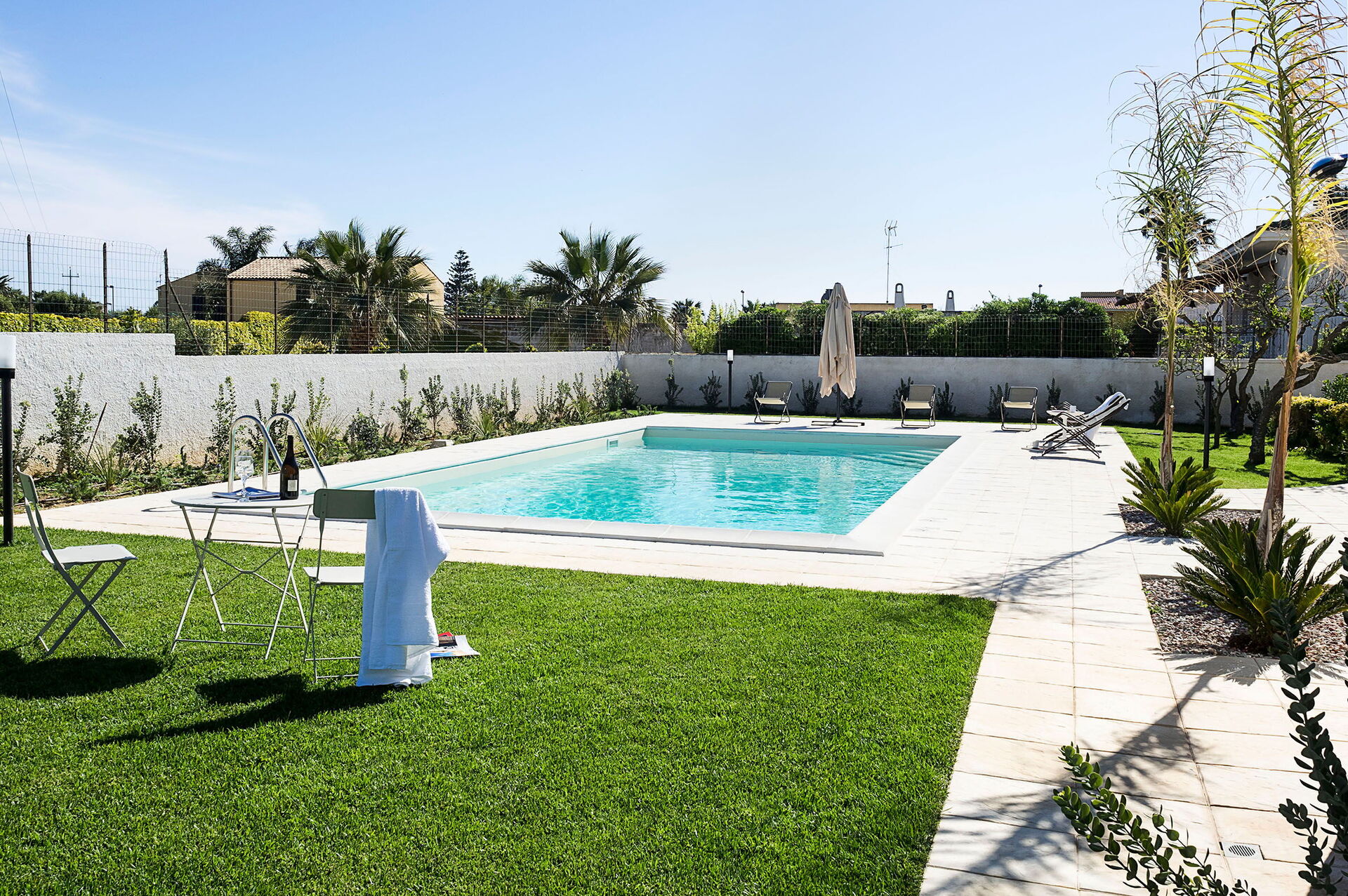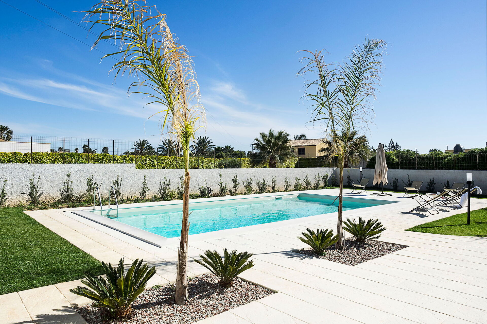 Uteområdene med panoramautsikt har mange fellesarealer hvor gjestene kan kose seg med familie eller venner, eller slappe av ved det saltrensede bassenget (uten klor) eller på solterrassen for å nyte den sicilianske solen.