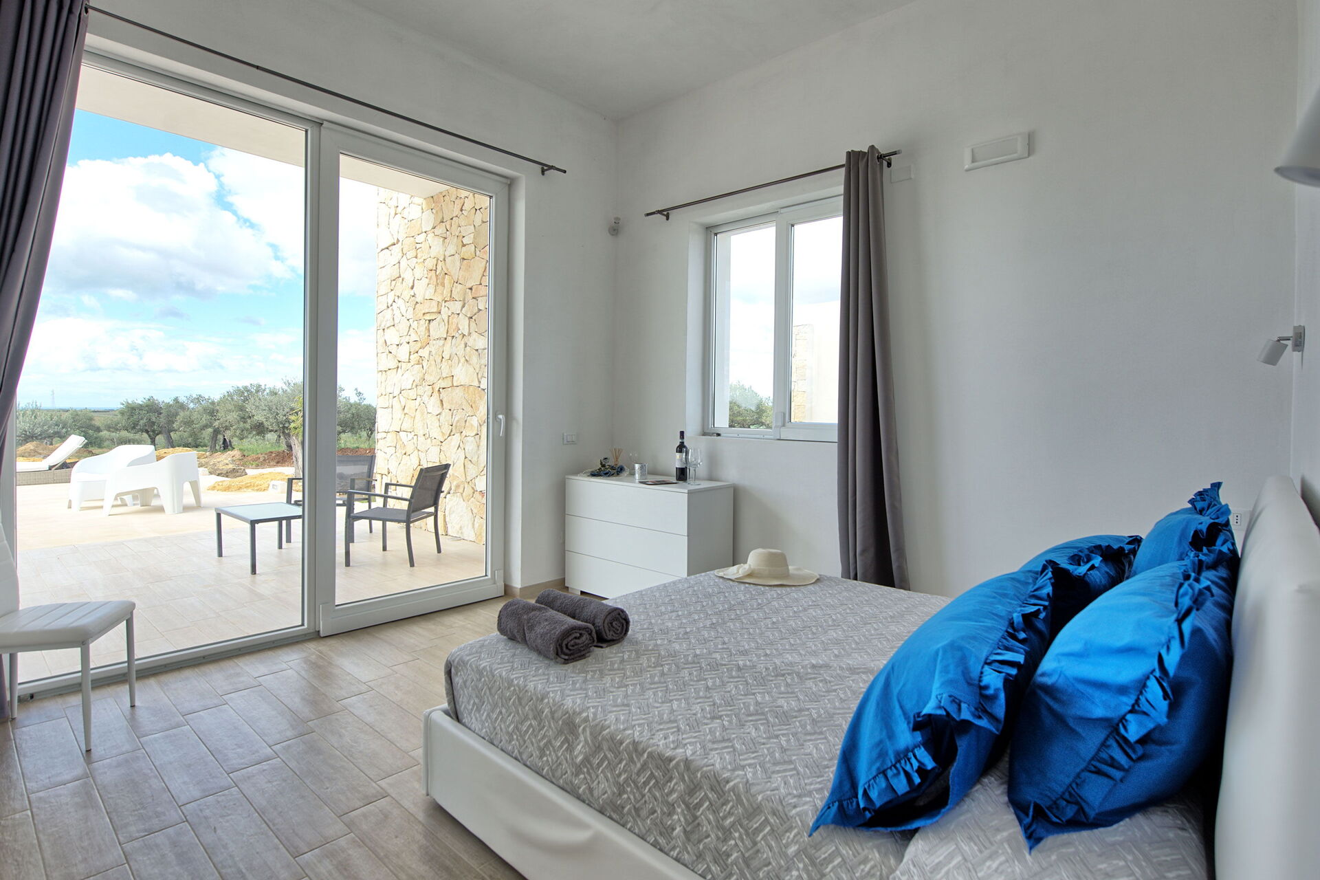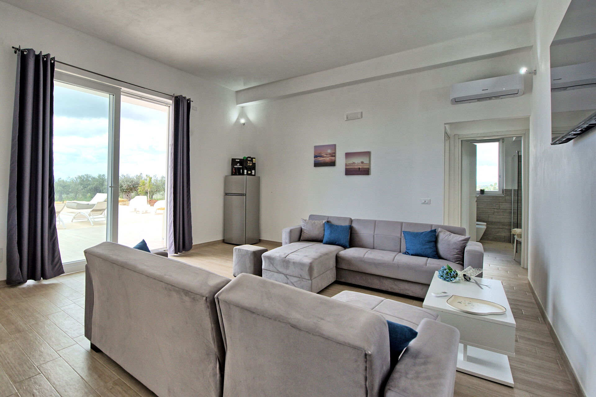 Upon approaching the villa, the border of this property is lined with huge impressive boulders, then you reach a white electric gate, to welcome you into this magnificent, architecturally perfect villa! The online photos are good, but seeing it in person, is visually stunning. It exceeded our expectations. The pool overlooking the countryside -to the ocean-is serene and beautiful. There’s a small garden with fresh vegetables, to be enjoyed by all. It’s in a very private area, quiet location, surrounded by vineyards and olive trees. Plenty of outdoor seating areas to lounge around….