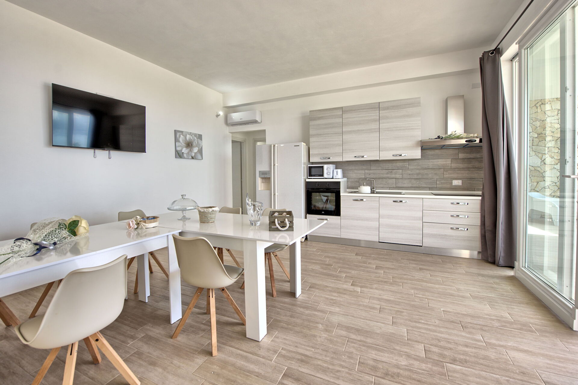 Kjøkken (koketopp, stekeovn, kjøleskap, fryser, oppvaskmaskin, mikrobølgeovn, brødrister, espressomaskin) med spiseplass, 1 dobbeltrom (aircondition) med direkte tilgang til uteområdet, bad med dusj, 1 twinrom (aircondition).
