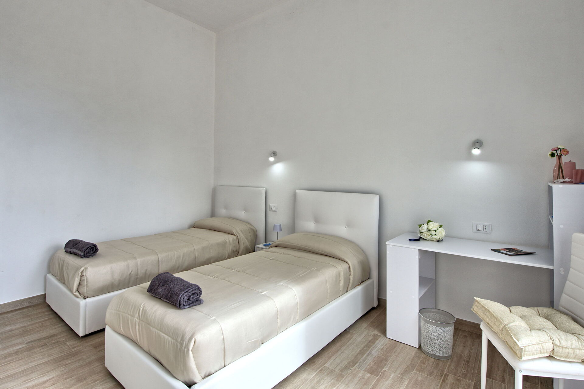 Inngang og stue med kjøkkenhjørne (stekeovn, kjøleskap, espressomaskin), 1 dobbeltrom (aircondition) med direkte utgang til uteområdet, bad med dusj, 1 twinrom (aircondition).