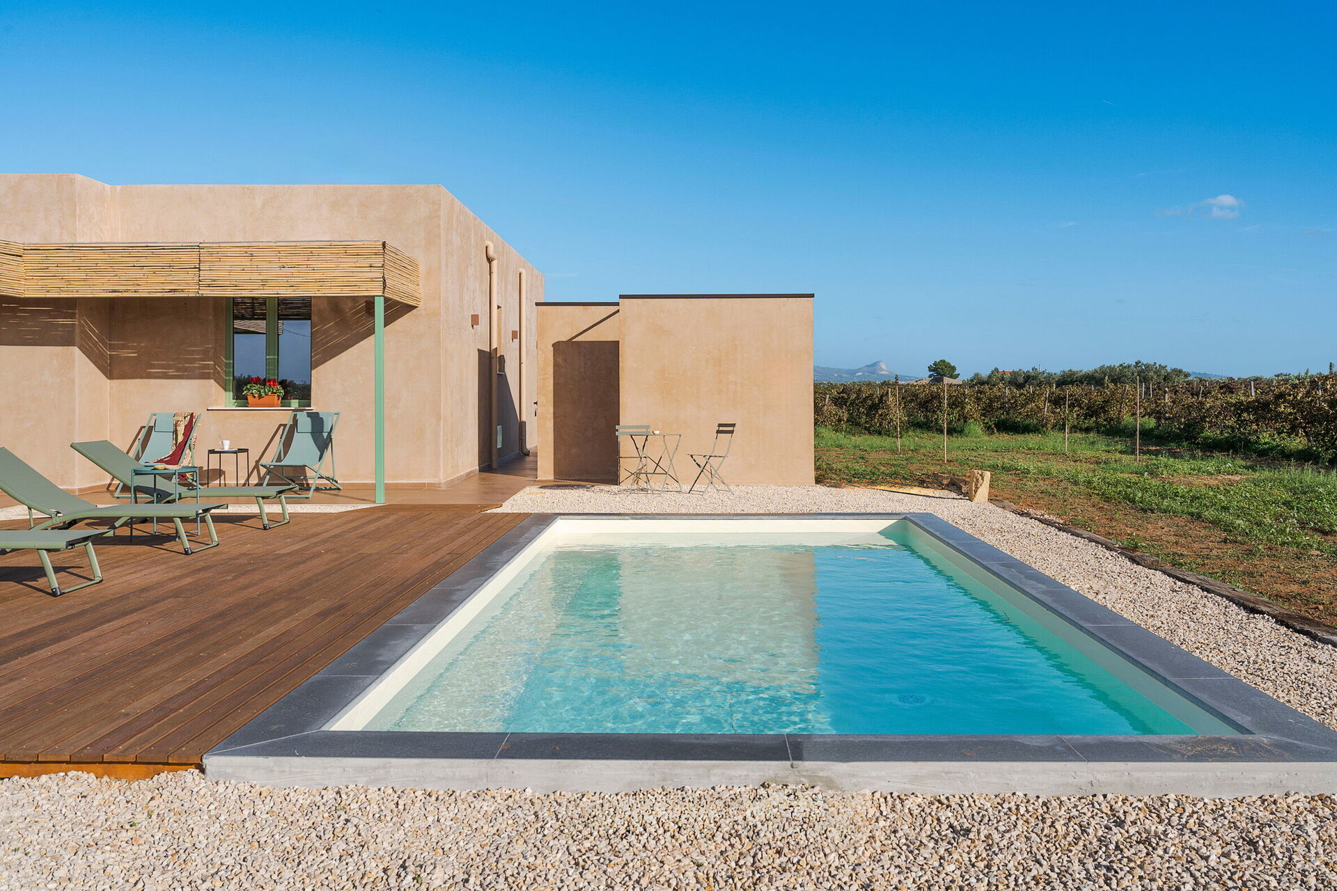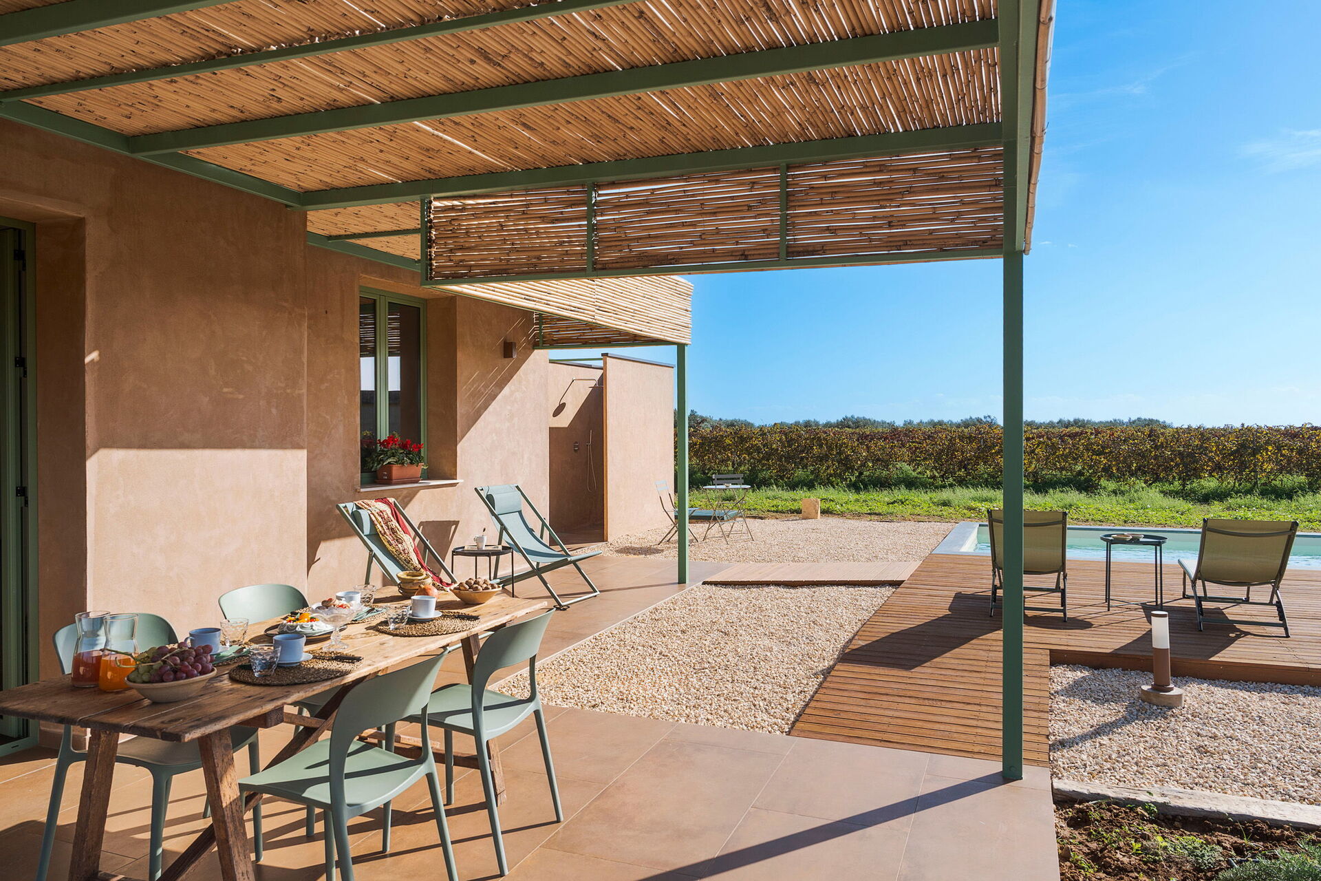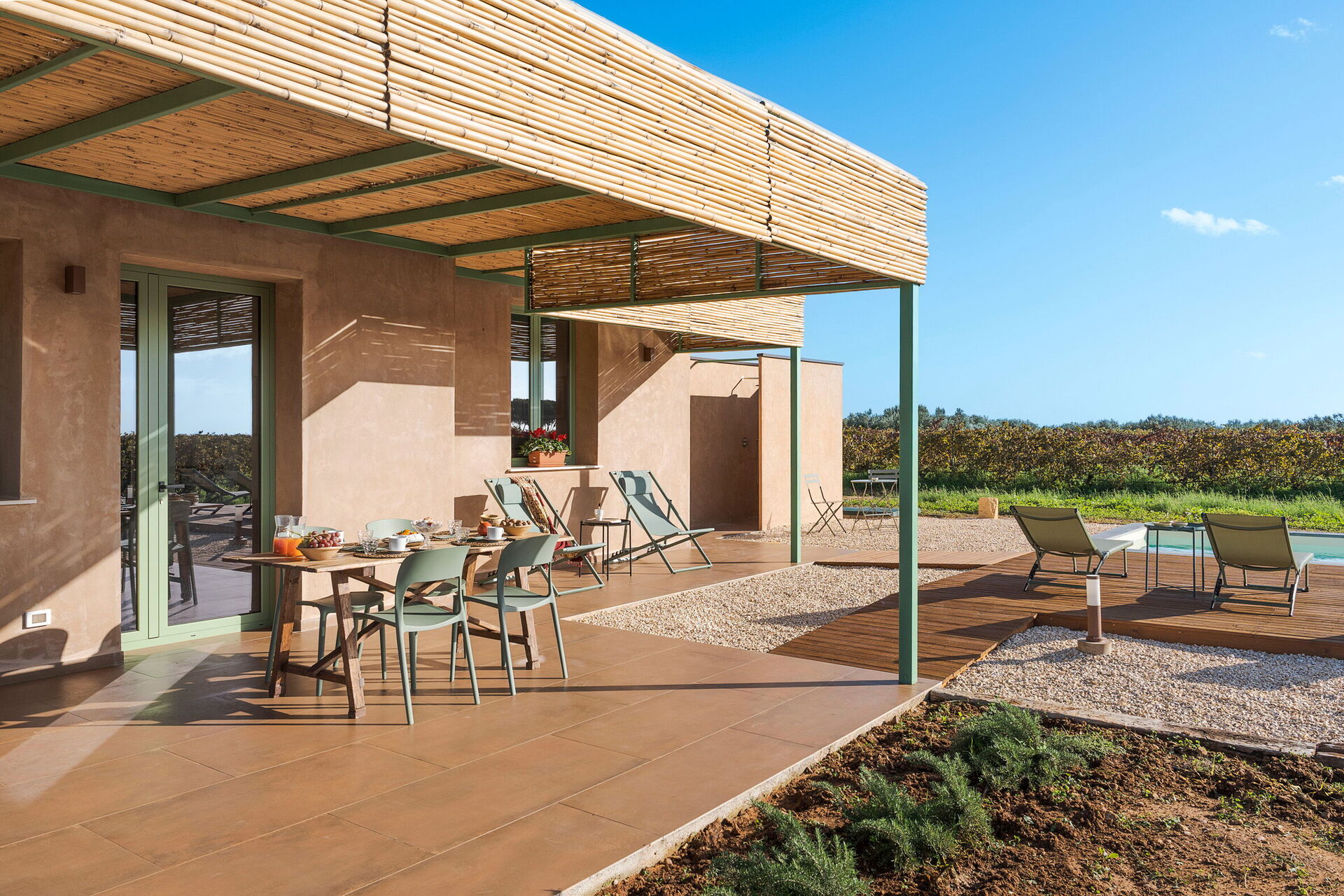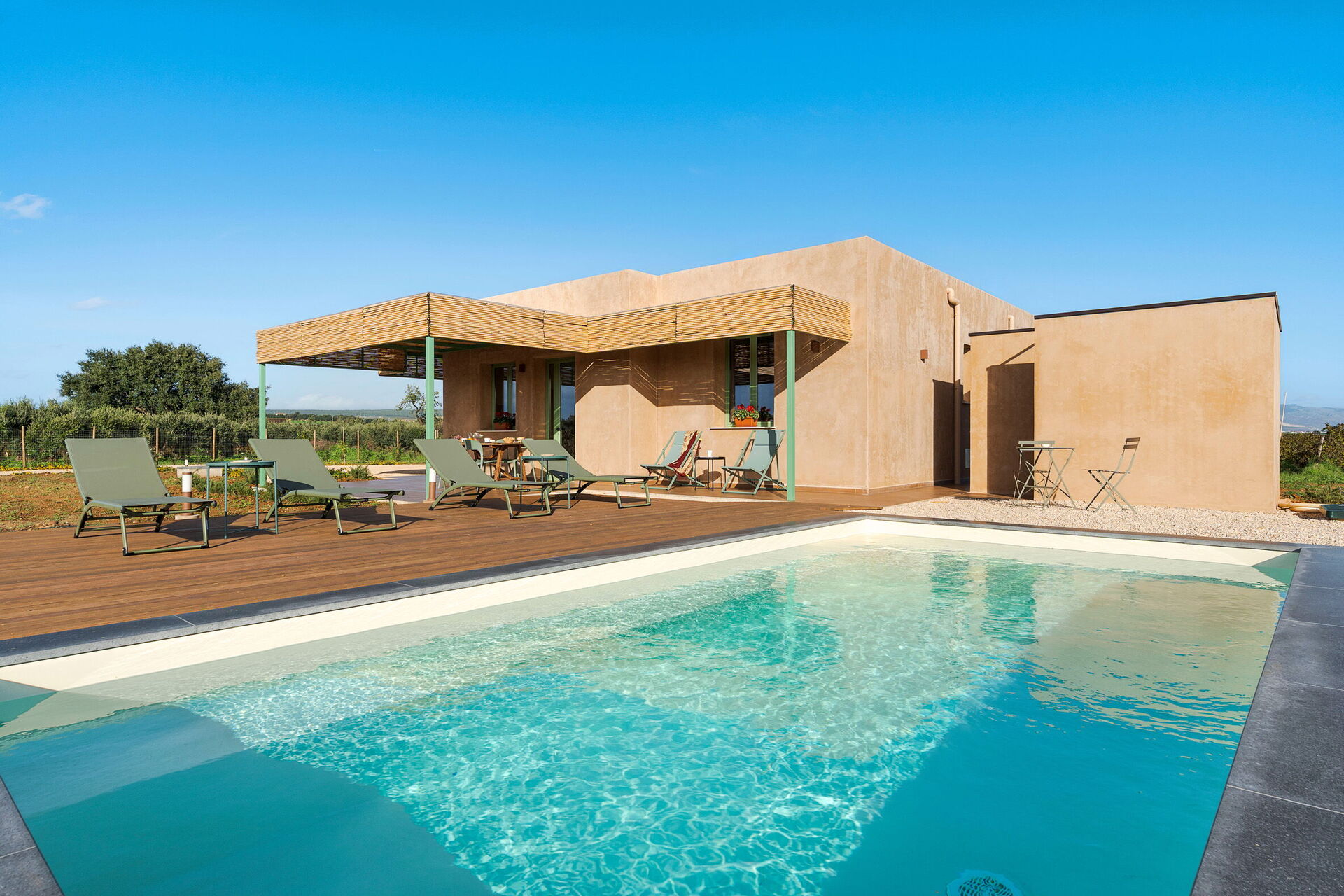 Uteområdene til villaen er designet for å fremheve utendørslivet. Eiendommen har et privat saltvannsbasseng, omgitt av en brolagt solterrasse utstyrt med solsenger. Ved siden av huset er det en stor veranda i skyggen av en pergola, innredet med et spisebord for utendørsmåltider og betjent av et praktisk innebygd grillområde. Fraværet av nabobygninger garanterer stillhet og totalt privatliv på den sicilianske landsbygda.