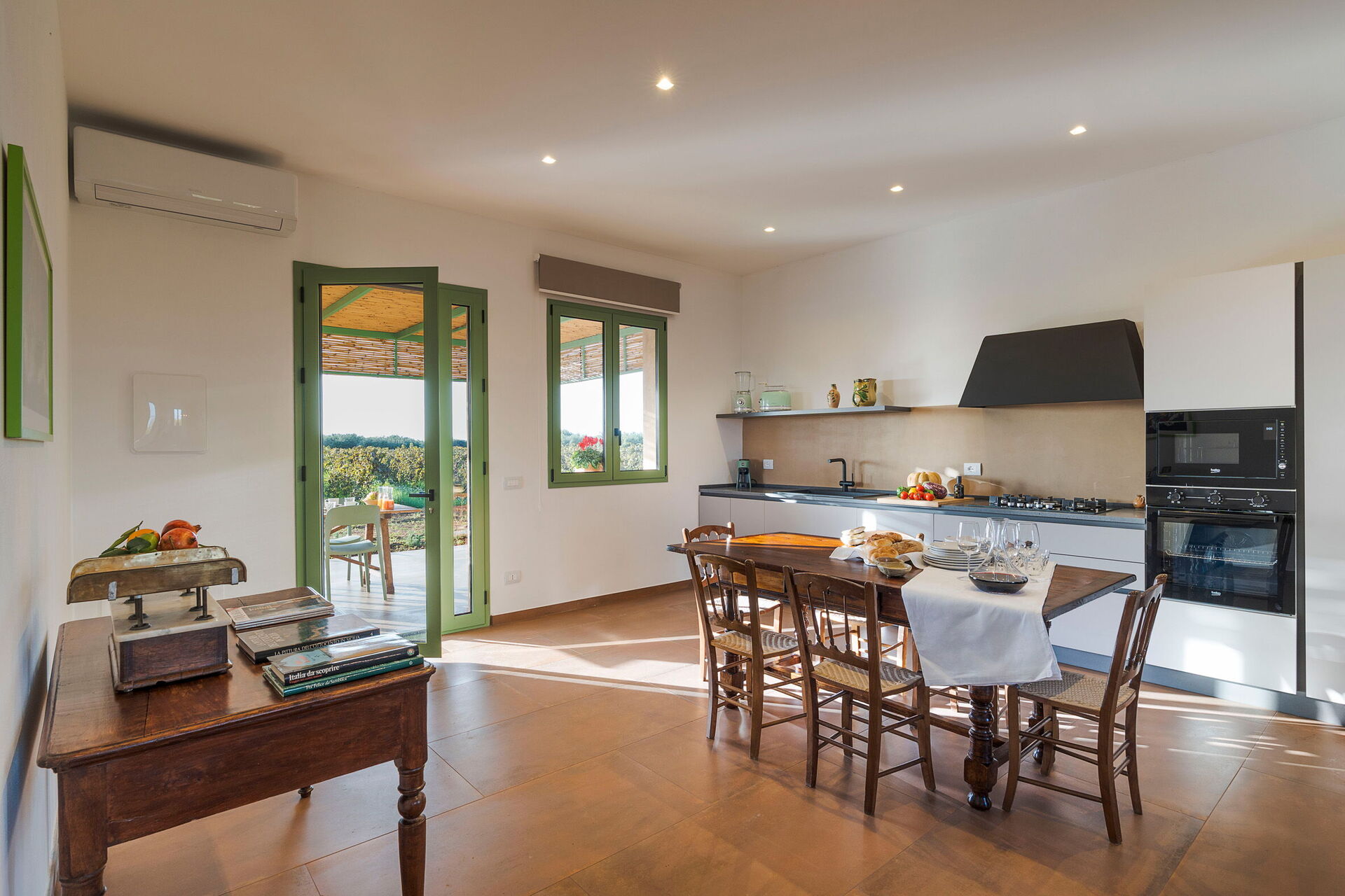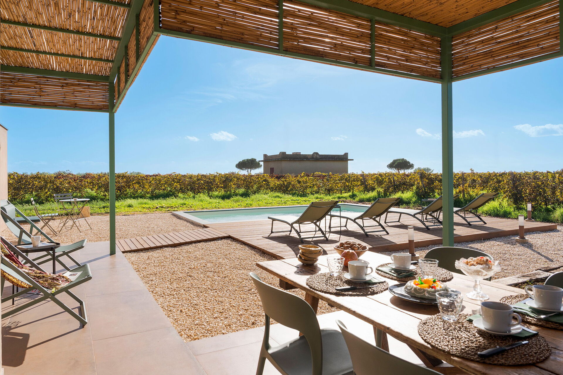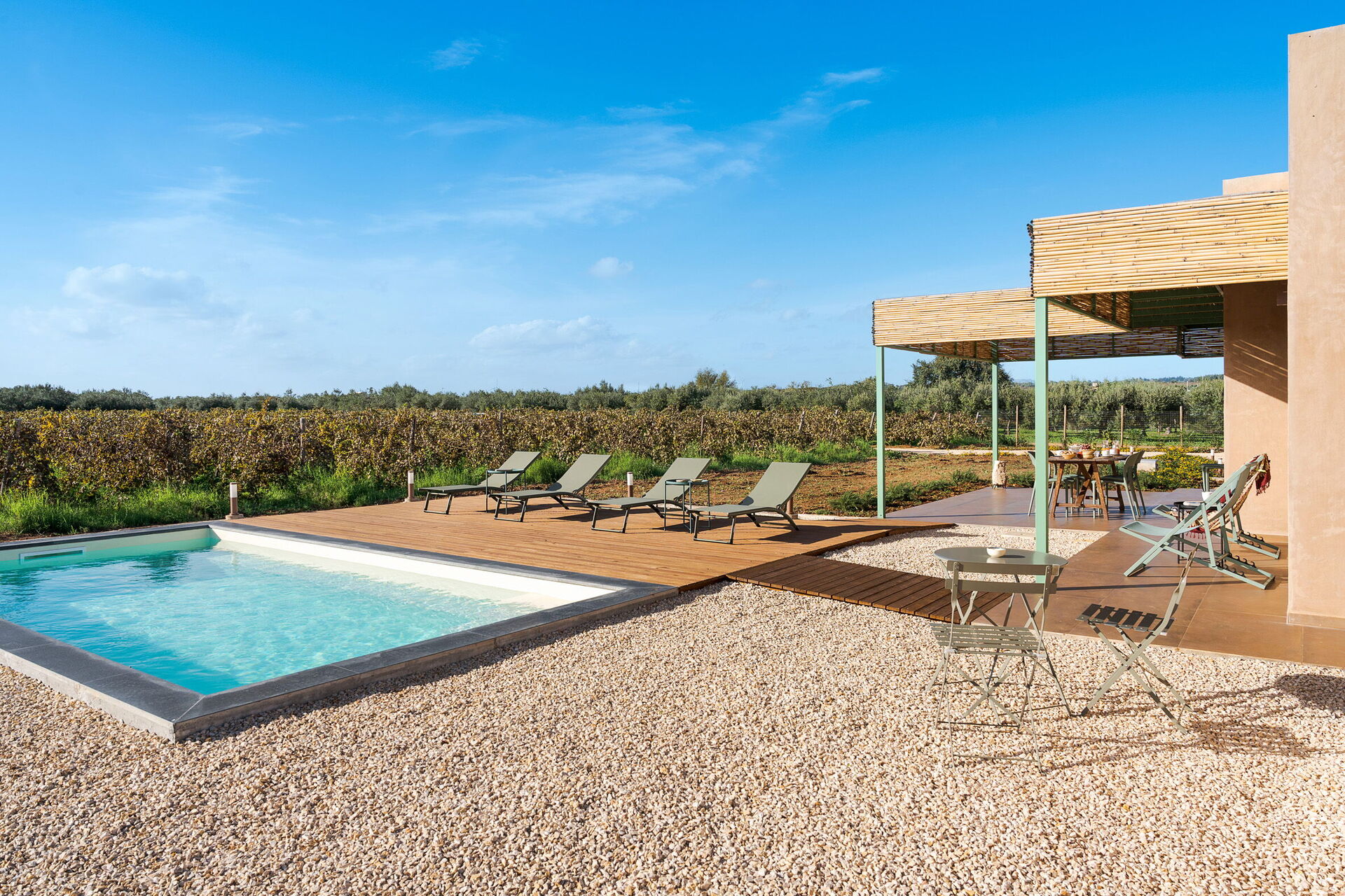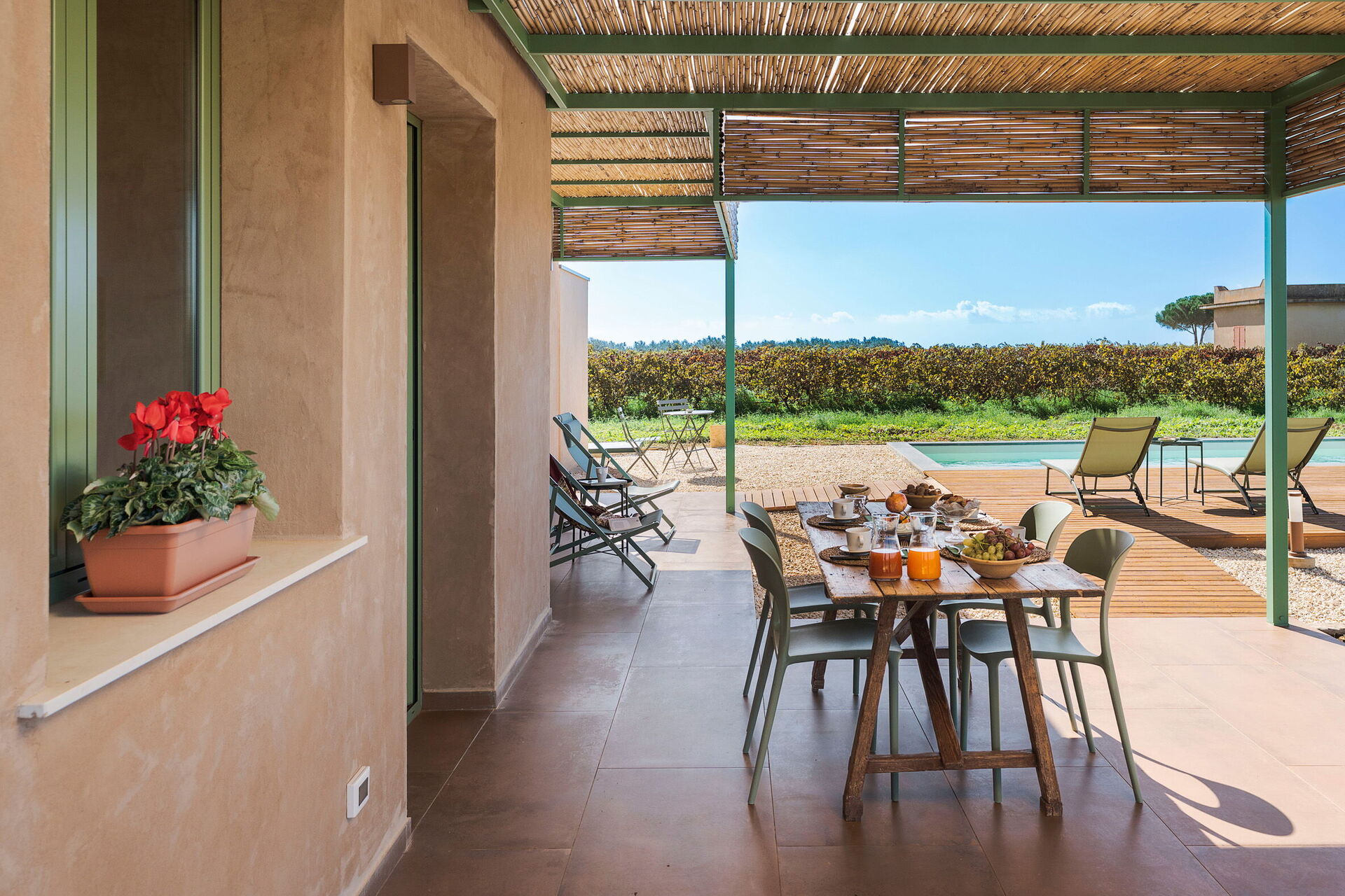 Uteområdene til villaen er designet for å fremheve utendørslivet. Eiendommen har et privat saltvannsbasseng, omgitt av en brolagt solterrasse utstyrt med solsenger. Ved siden av huset er det en stor veranda i skyggen av en pergola, innredet med et spisebord for utendørsmåltider og betjent av et praktisk innebygd grillområde. Fraværet av nabobygninger garanterer stillhet og totalt privatliv på den sicilianske landsbygda.