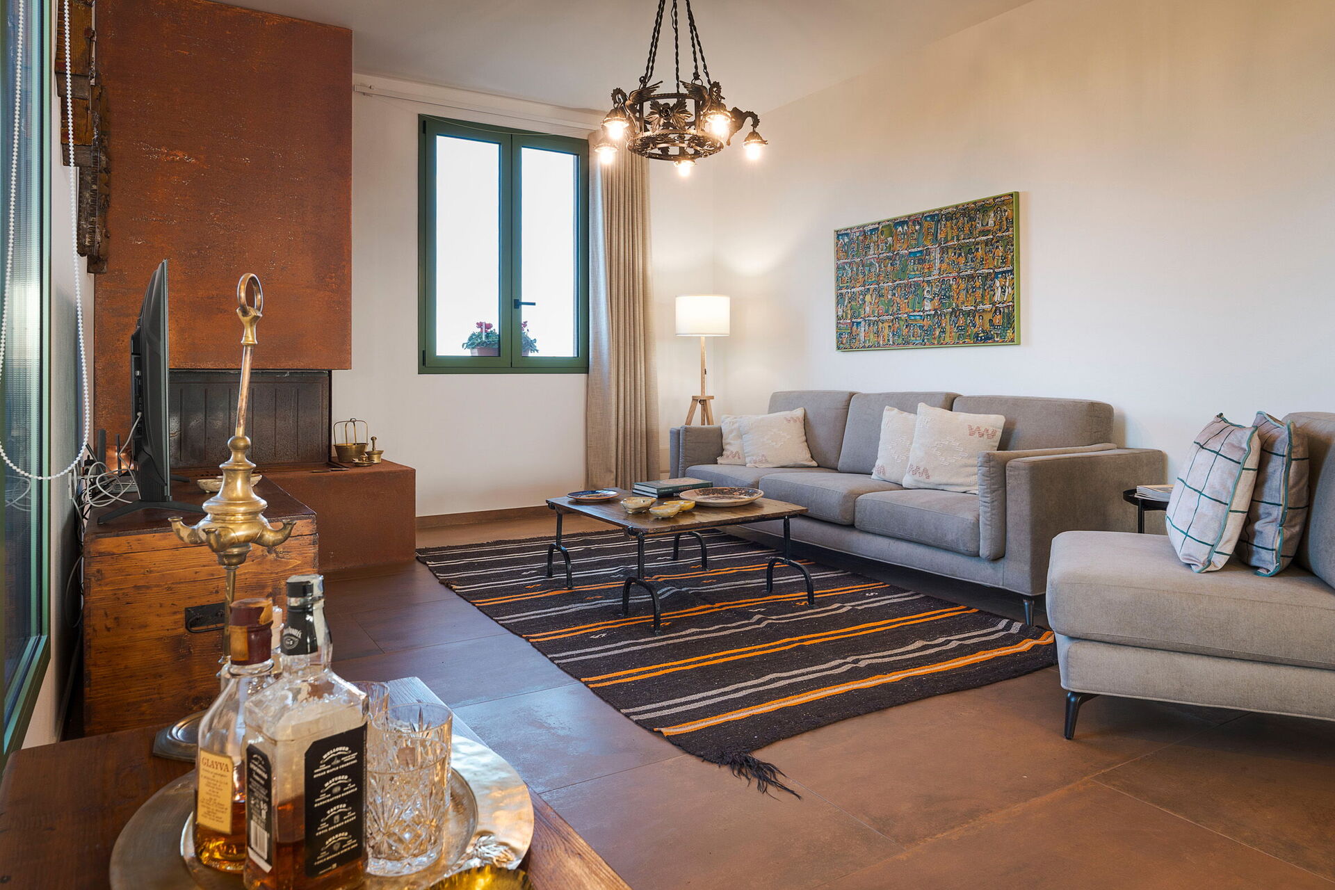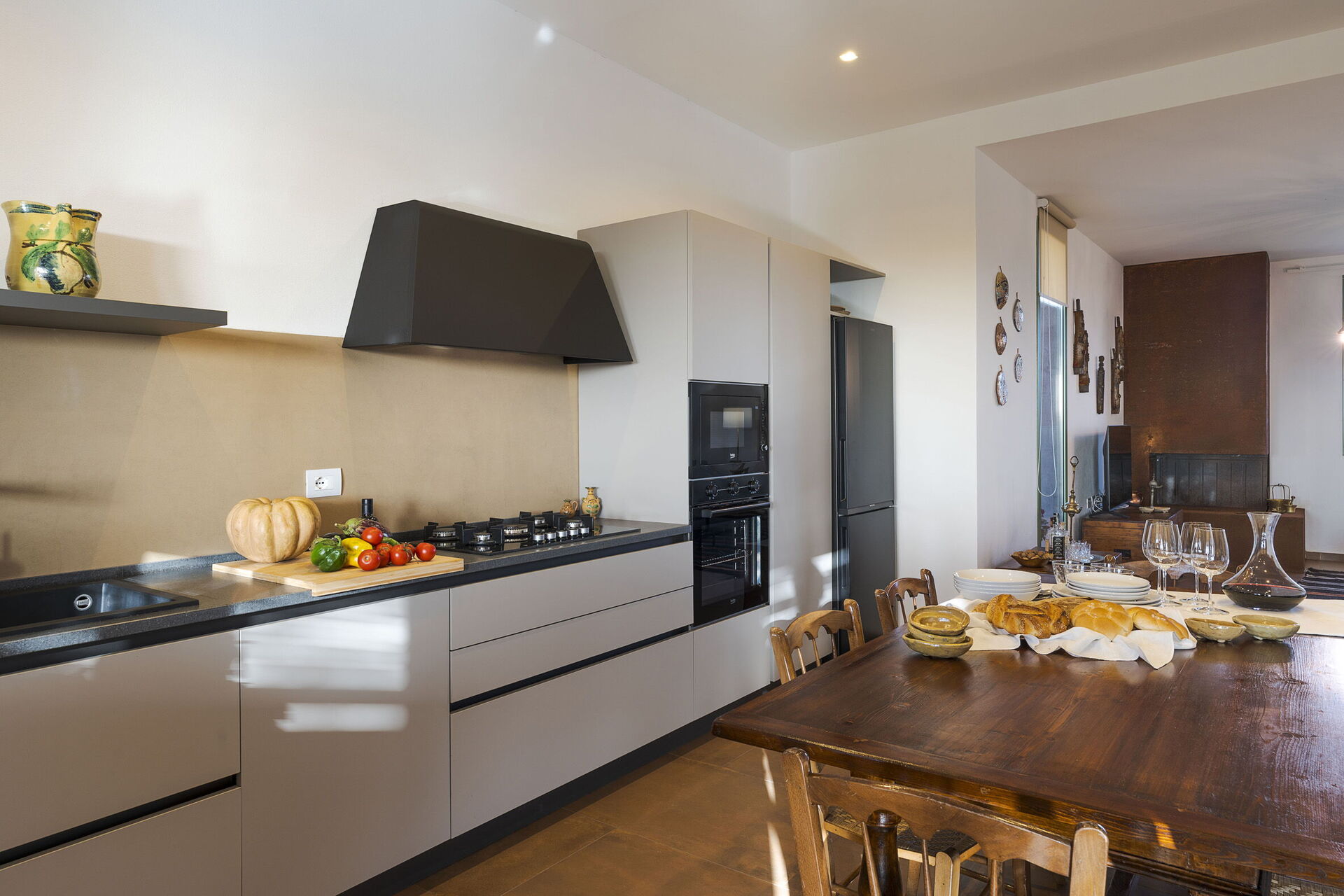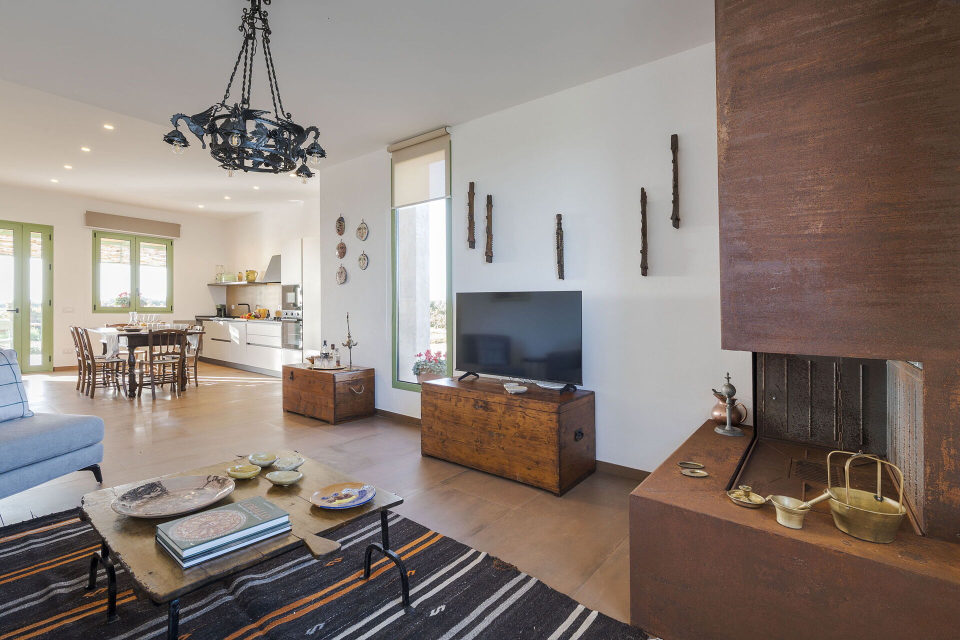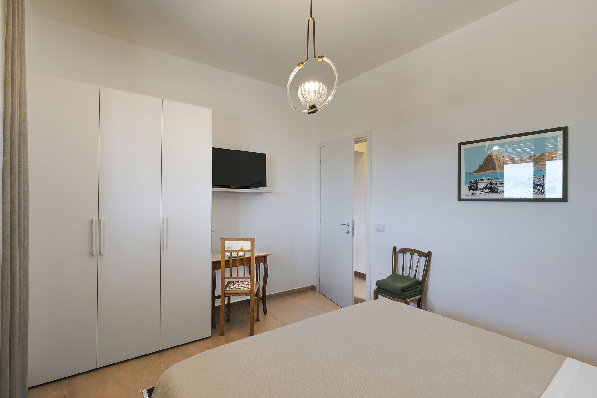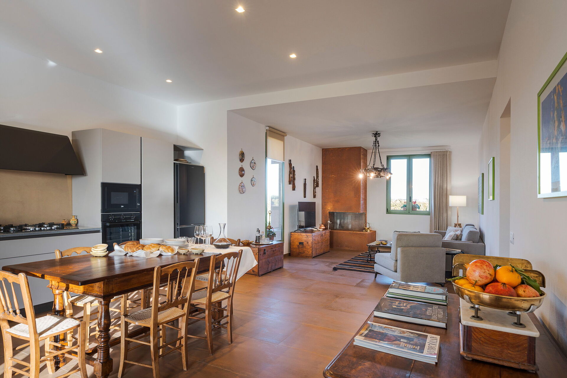 • Første etasje: Inngangen åpner til en lys stue som består av en salong med peis og TV, og en spiseplass med kjøkkenkrok. Det moderne kjøkkenet er fullt utstyrt med komfyrtopp, stekeovn, kjøleskap, fryser, oppvaskmaskin, mikrobølgeovn, brødrister, espressomaskin og kaffetrakter. Soveområdet består av et hovedsoverom med en king-size seng (180 x 200 cm), et andre dobbeltrom med en standard seng (160 x 200 cm), og et komplett bad med dusj.