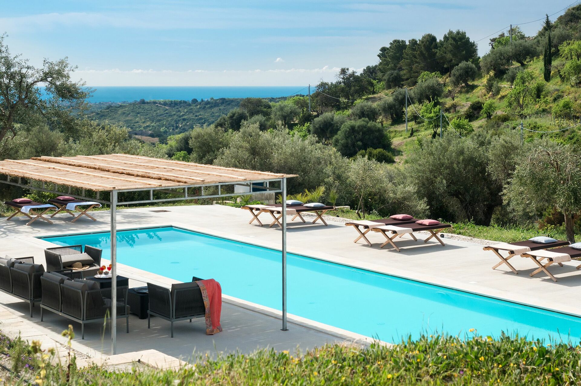 En velholdt hage tilbyr flere avslappende terrasser og et stort svømmebasseng til gjestenes disposisjon.