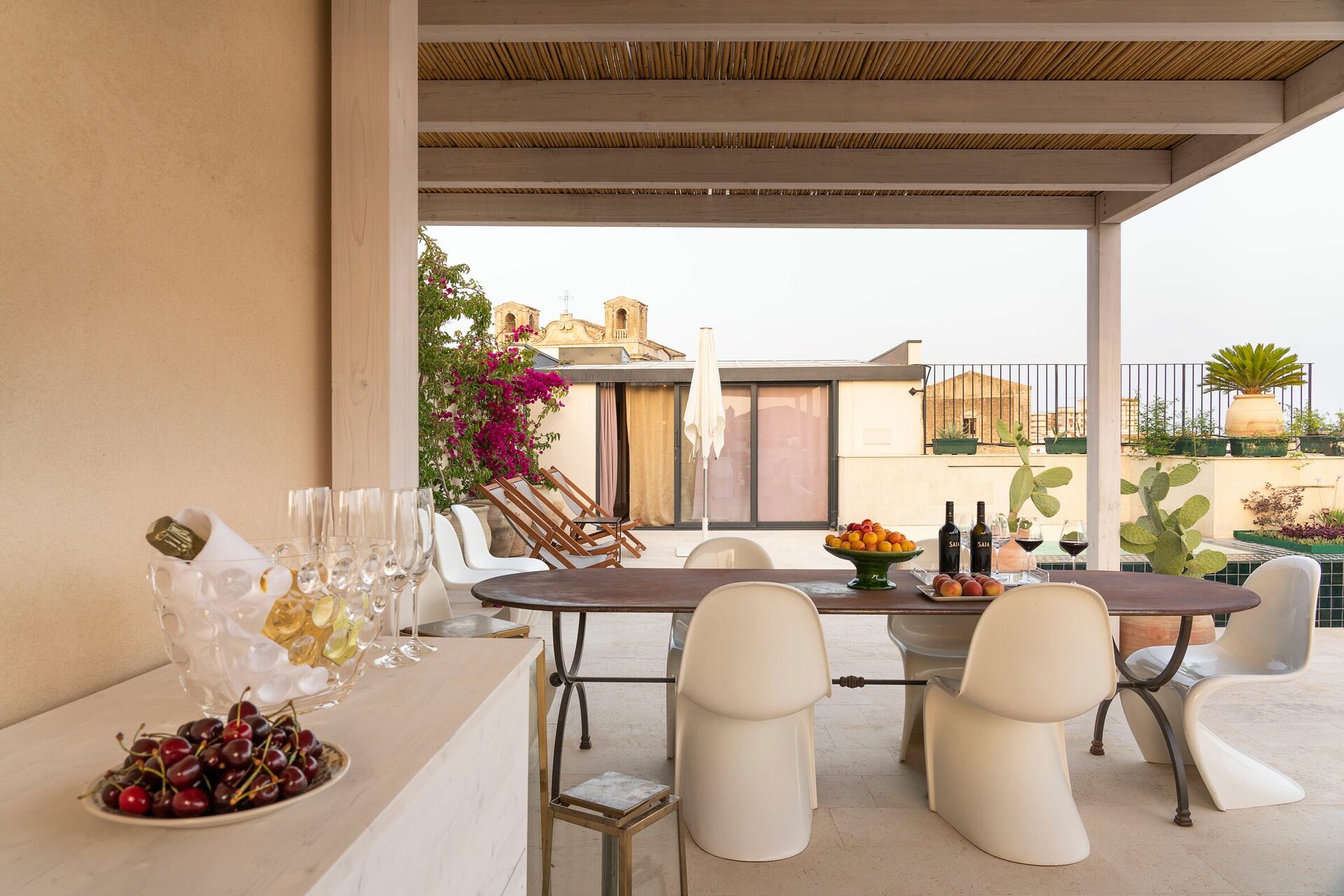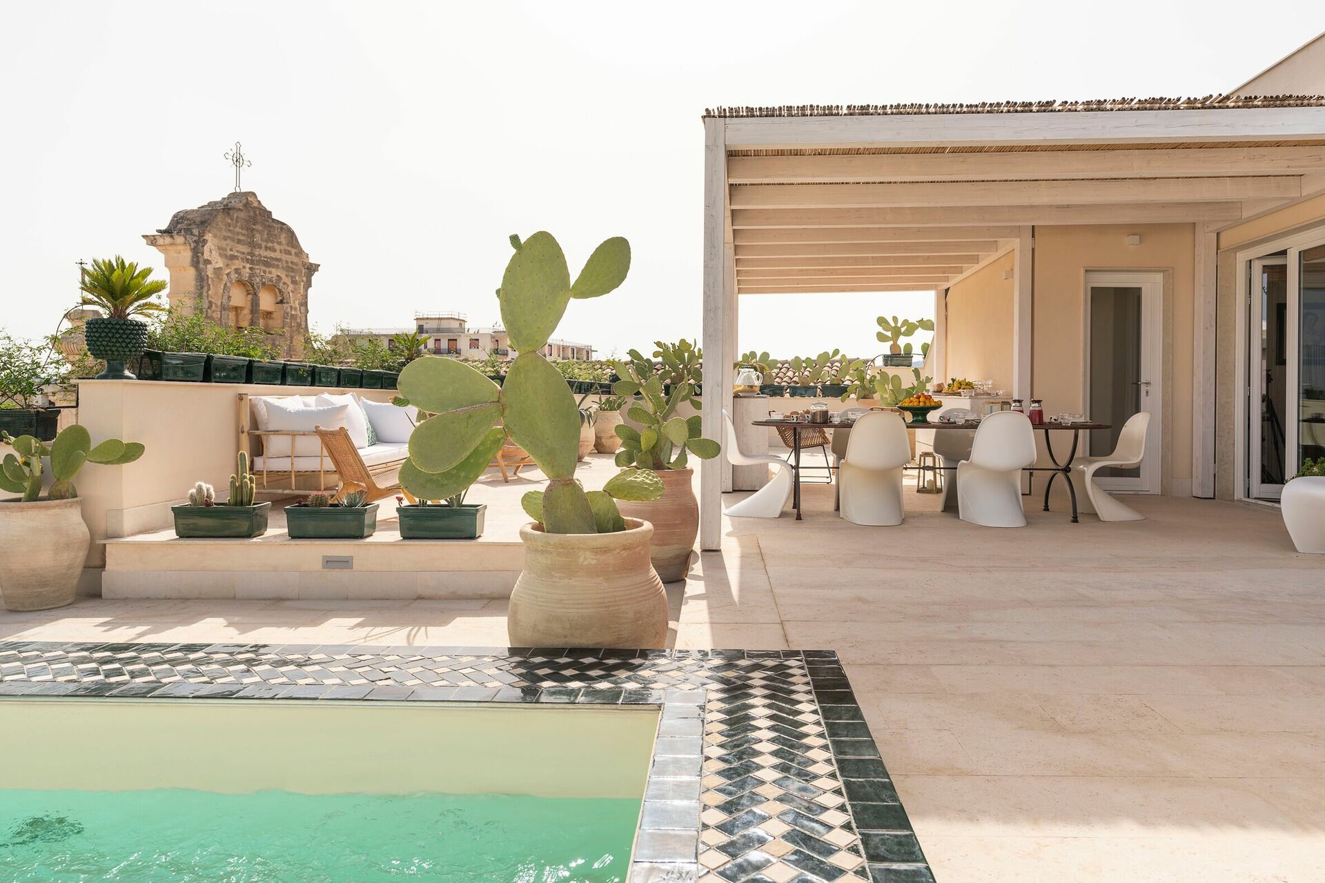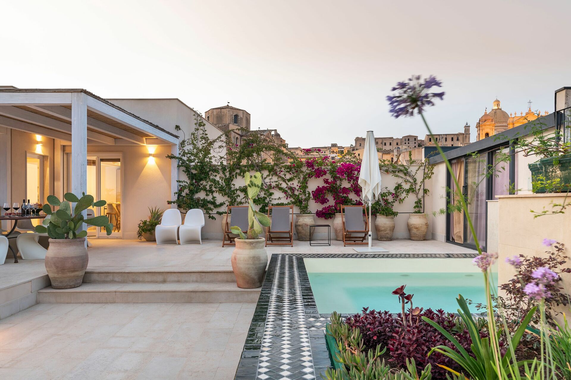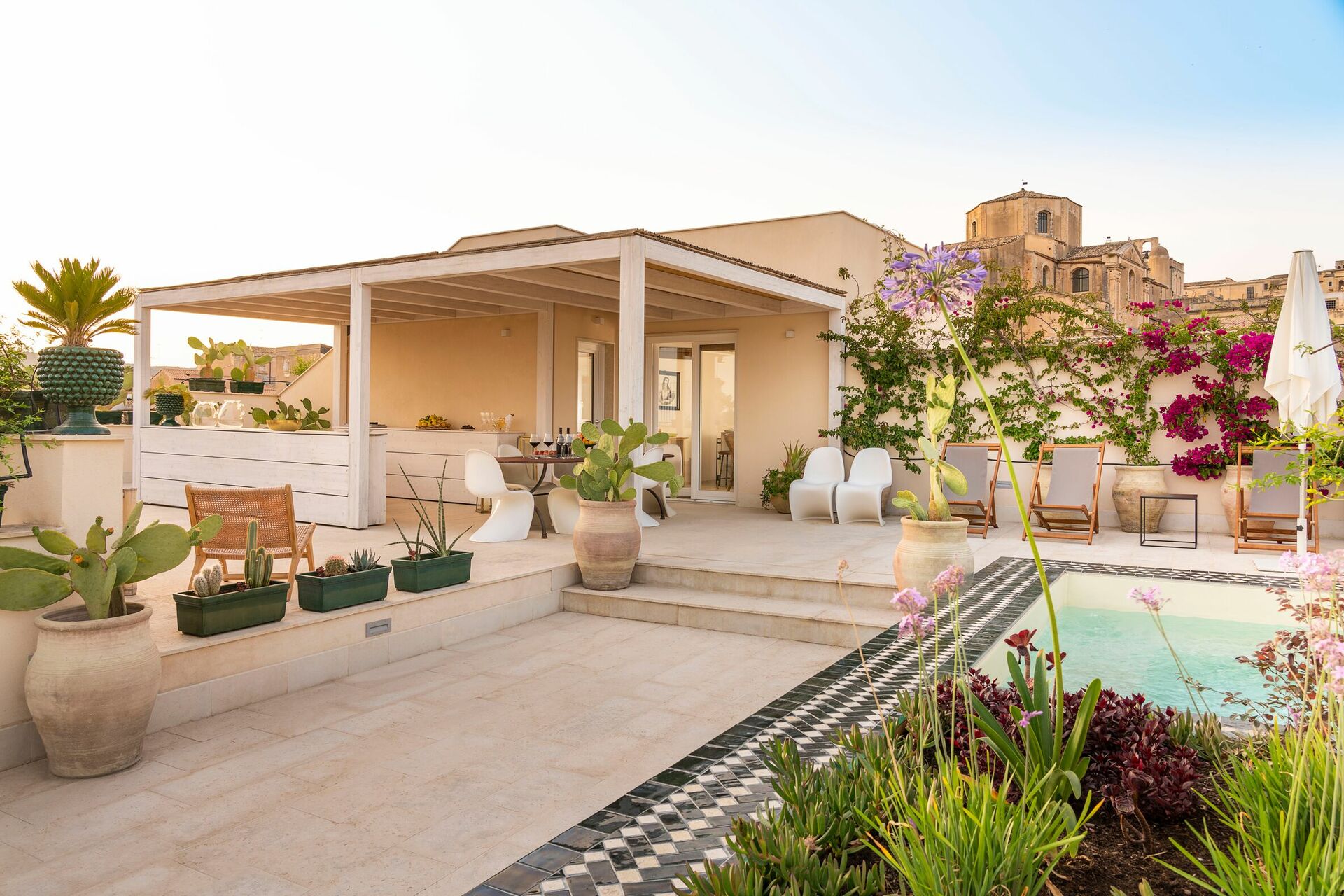 Denne eksklusive ferieleiligheten på Sicilia ligger i tredje og fjerde etasje i en prestisjefylt bygning med heis, og byr på en stor terrasse med et minibasseng og fantastisk utsikt over hustakene i gamlebyen.