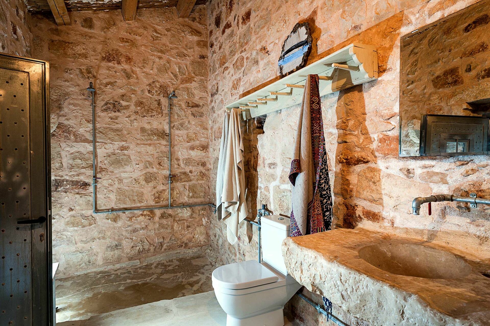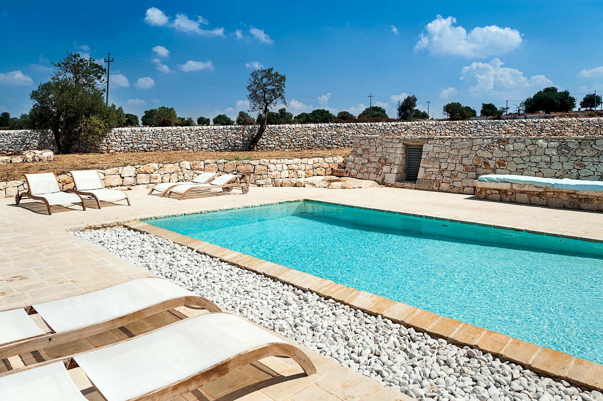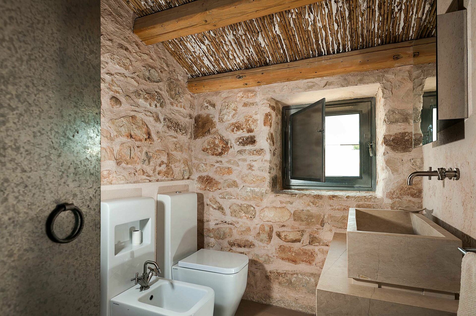 Huset er omgitt av tradisjonelle steingjerder, og byr på et vakkert basseng; store, solfylte terrasser; og en sjarmerende indre gårdsplass. Interiøret har designelementer og bruk av materialer som naturstein, stål og tre, i perfekt harmoni med byggestilen.