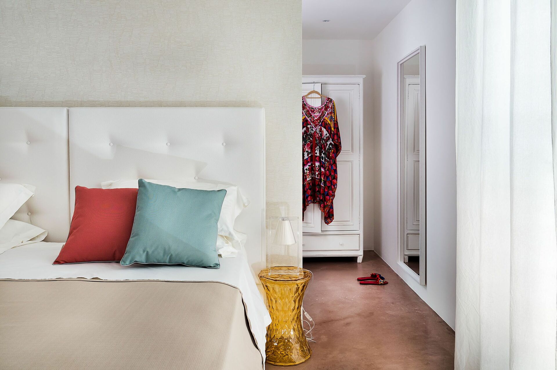 Første etasje: stue med spiseplass, kjøkken (stekeovn, fryser, oppvaskmaskin, kaffemaskin, mikrobølgeovn), soverom med king size-seng (180 x 210 m) med privat bad med dusj, soverom med dobbeltseng med eget bad med dusj, soverom med dobbeltseng, 1 bad med dusj