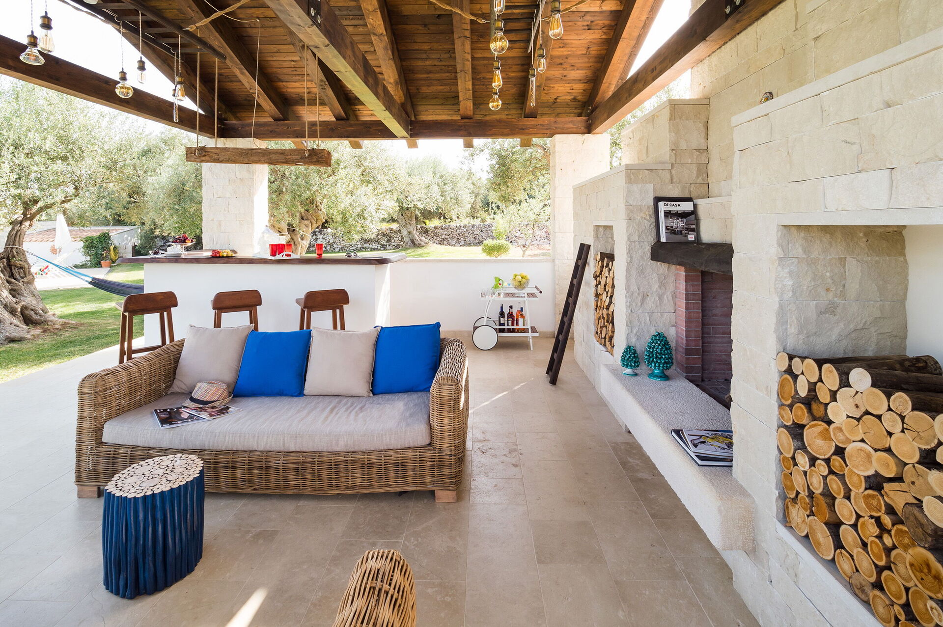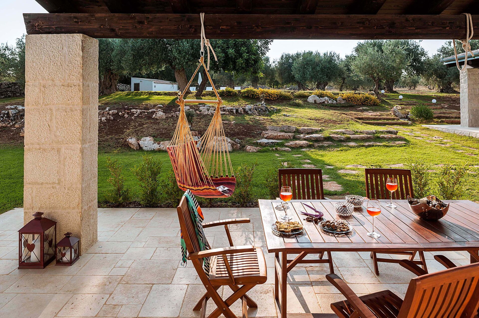 I hagen er det god plass og et åpent lysthus, godt med sitteplasser og barhjørne. Den idylliske terrassen er under tak og klar til utendørs måltider.