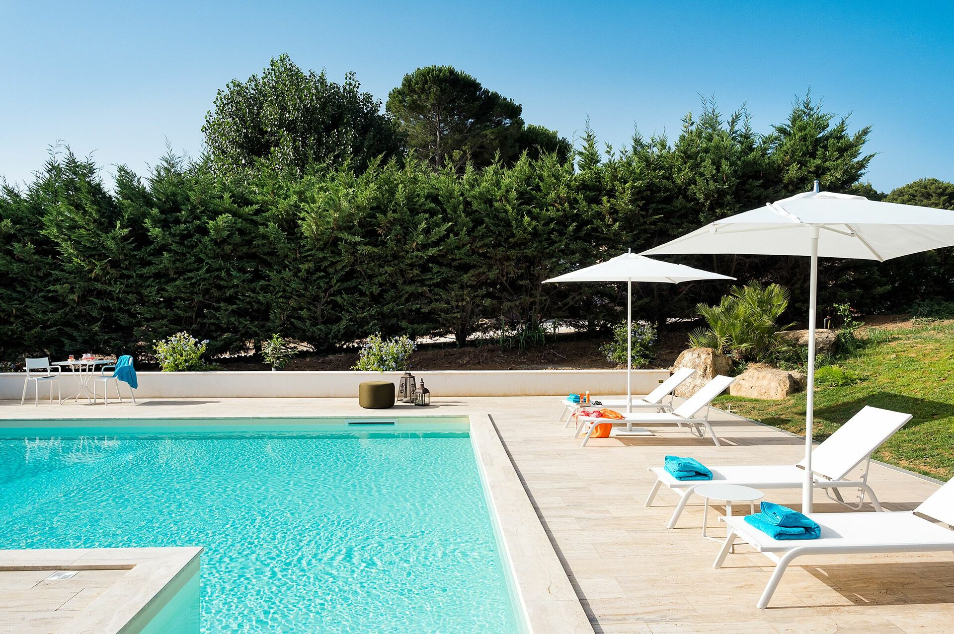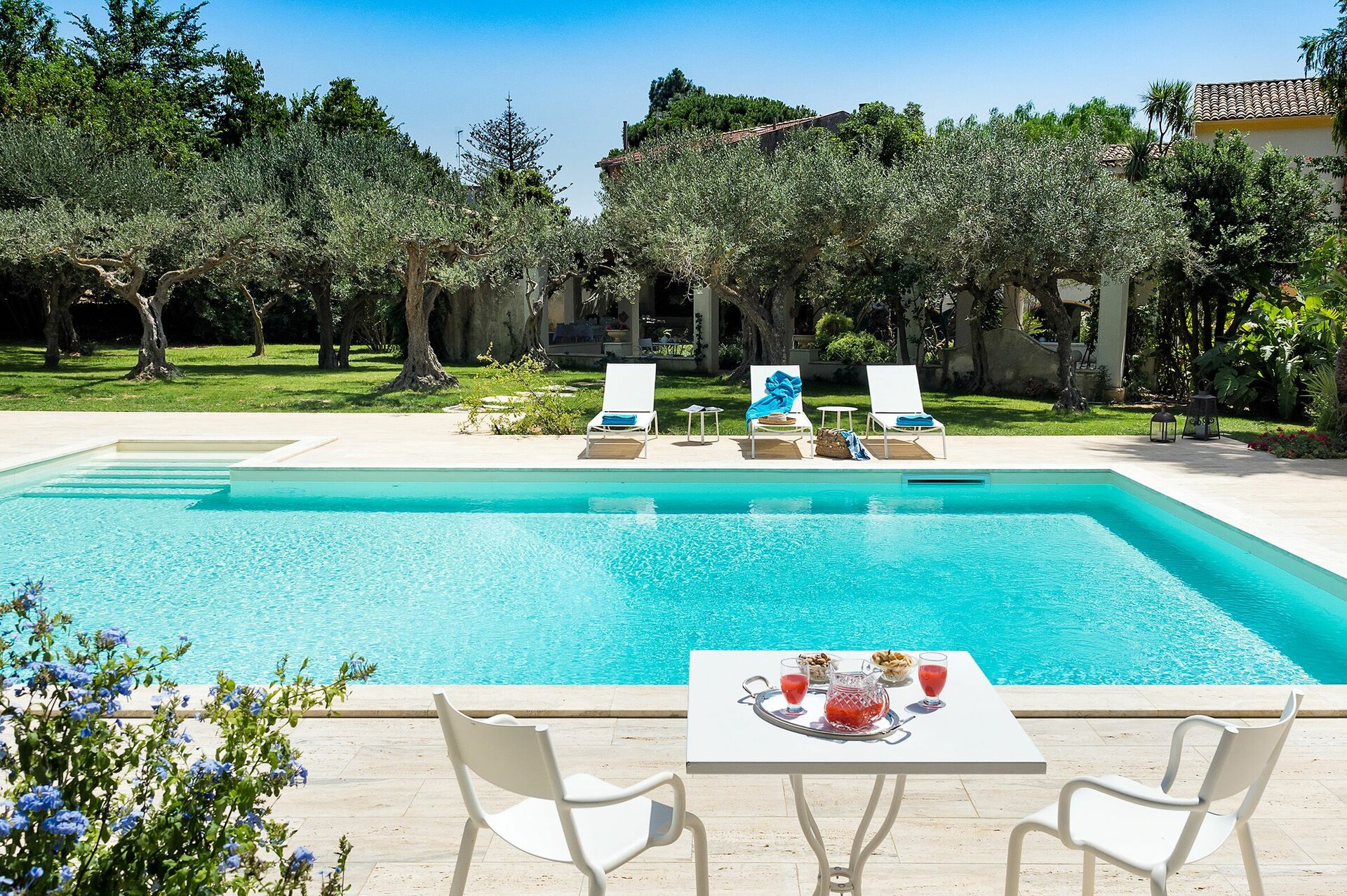 Villaen er omgitt av en velstelt middelhavshage med et fantastisk basseng. I hagen er det også et stort uteområde, ideellt for å nyte utendørsmåltider i avslappende omgivelser.