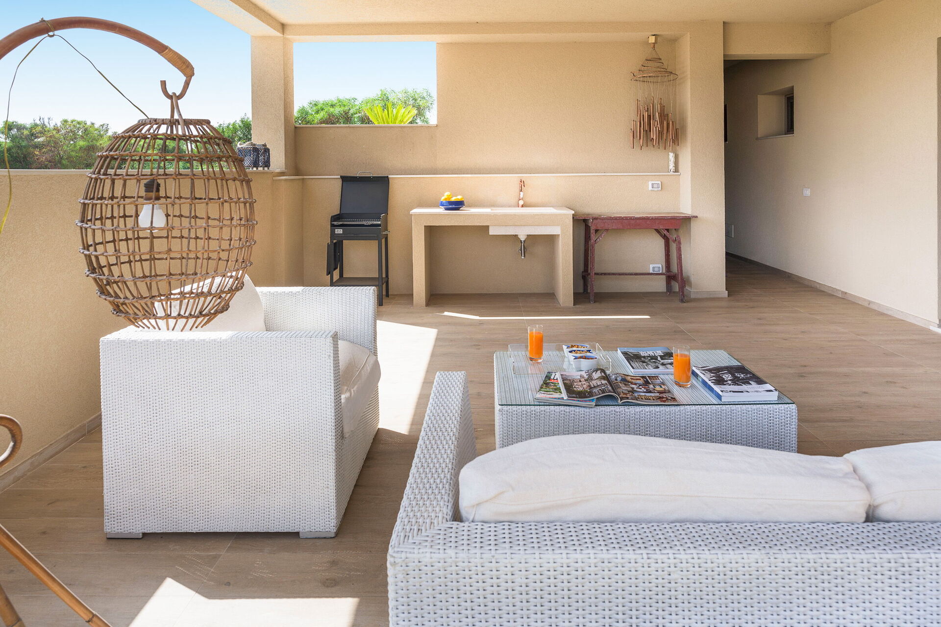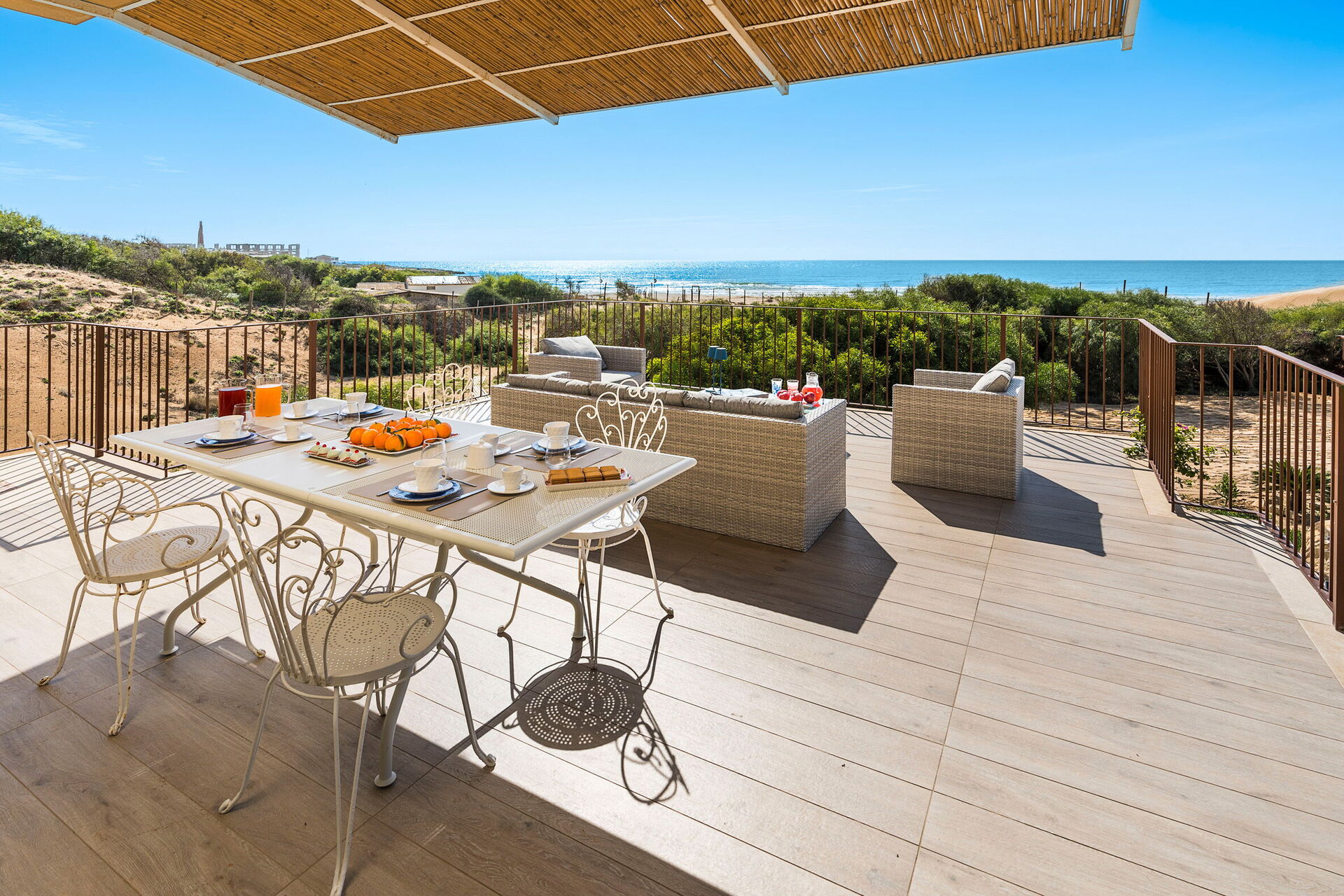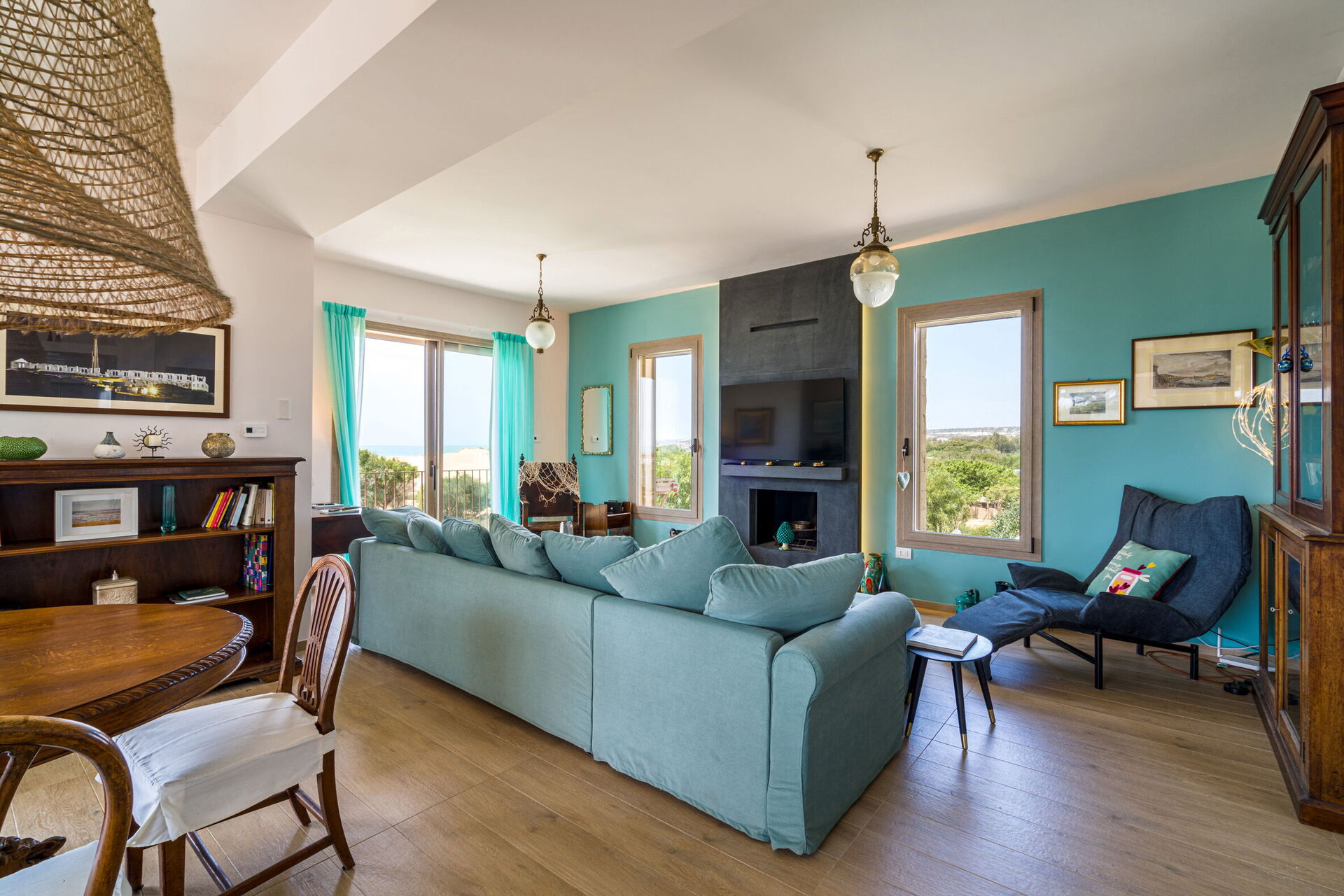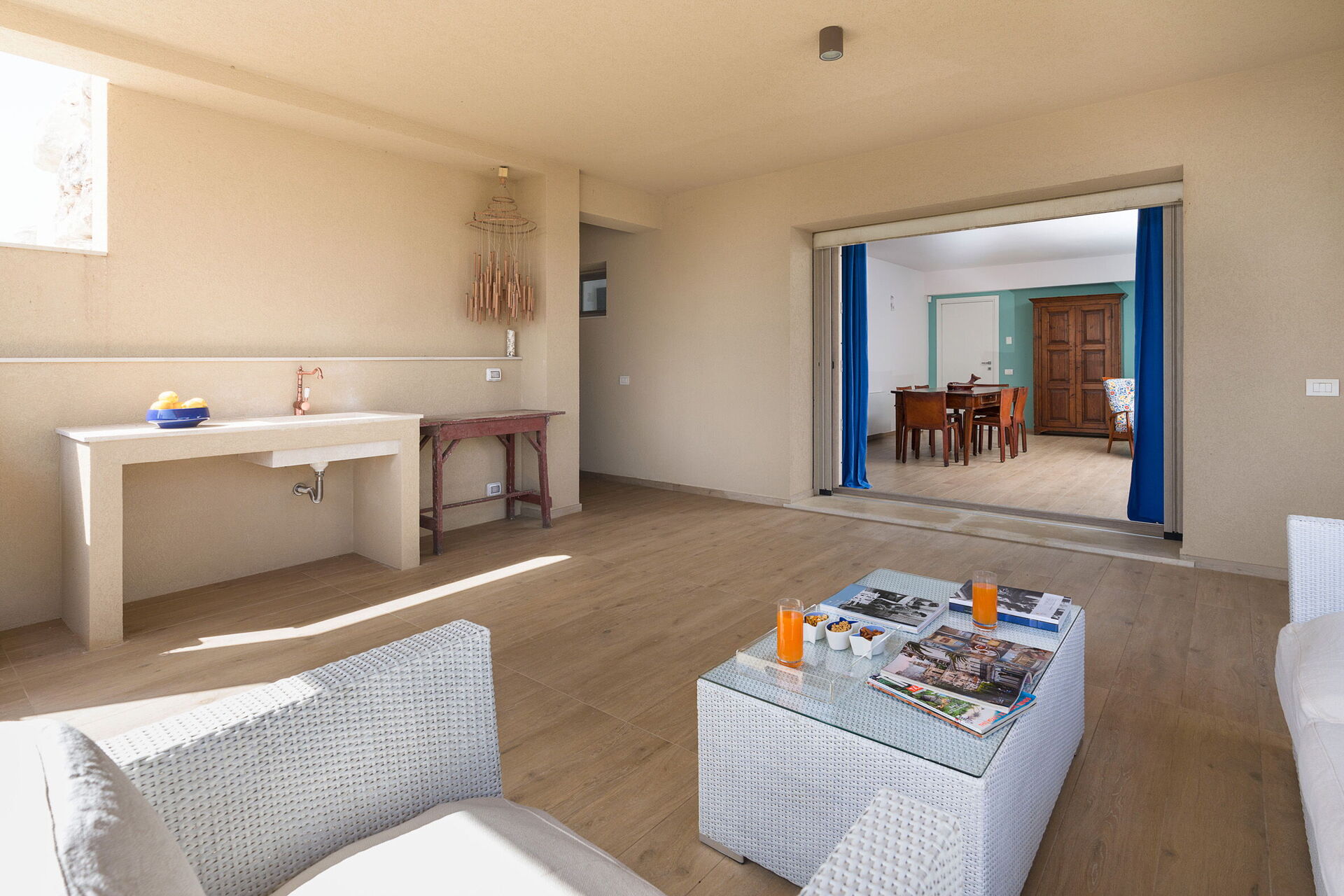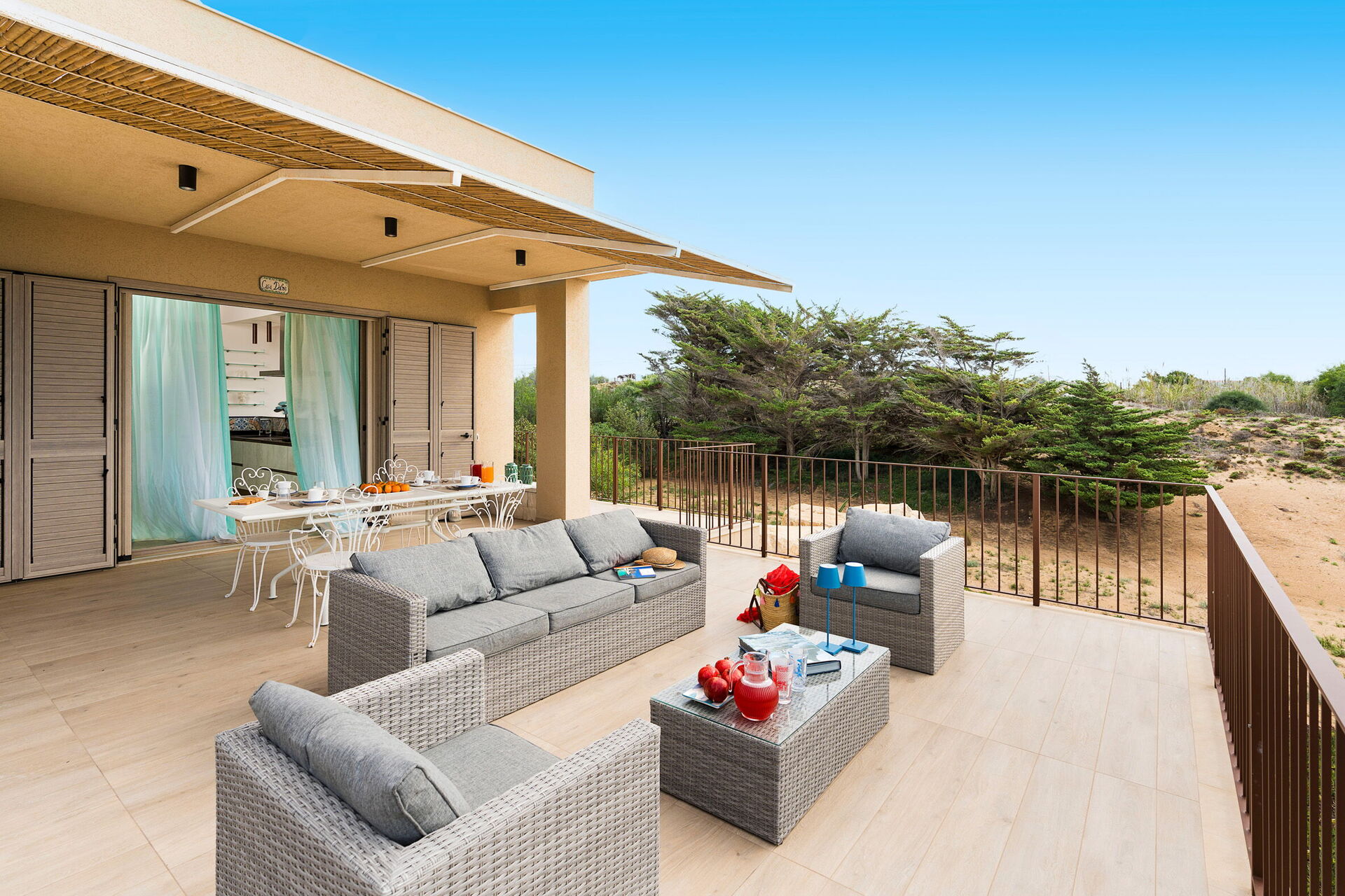 Den store terrassen med utsikt over havet er møblert for å kunne spise ute; her kan du slappe av og nyte en fantastisk panoramautsikt over landsbyen Sampieri og havet.
