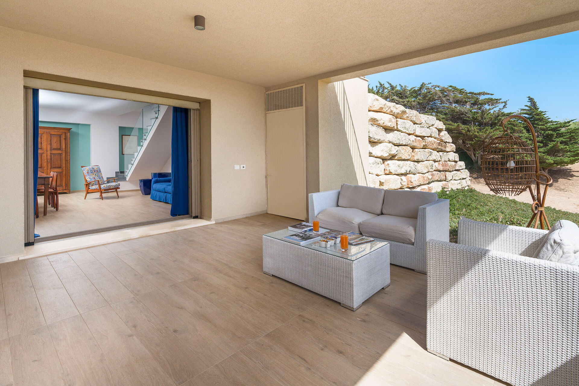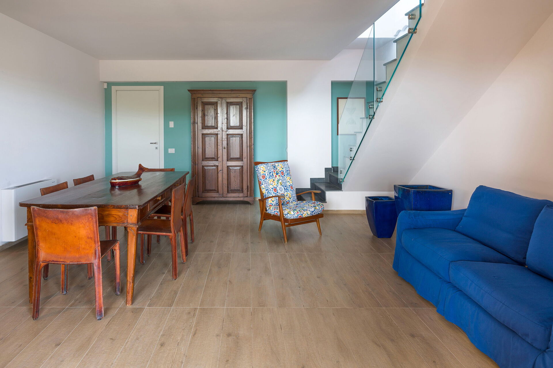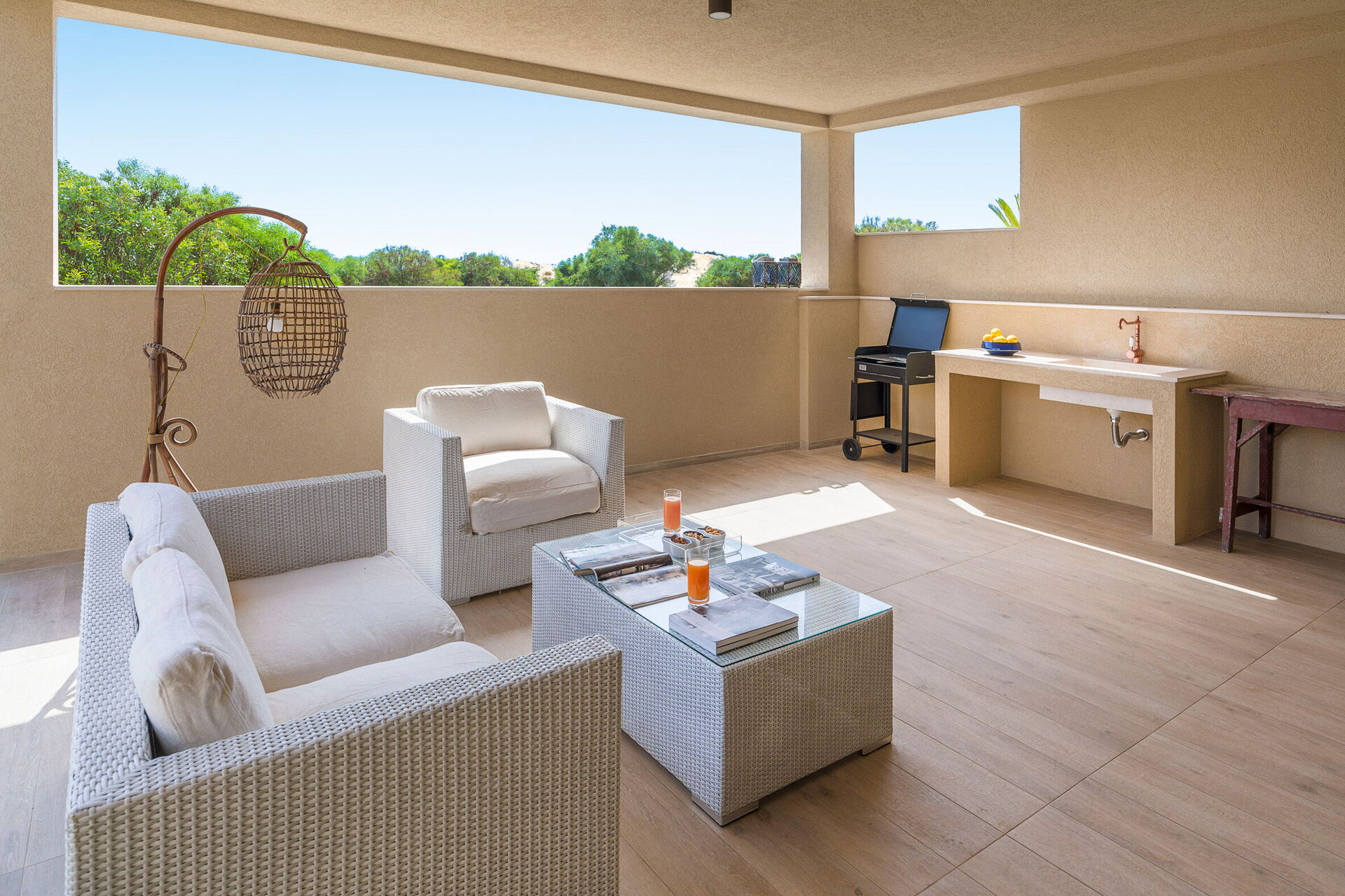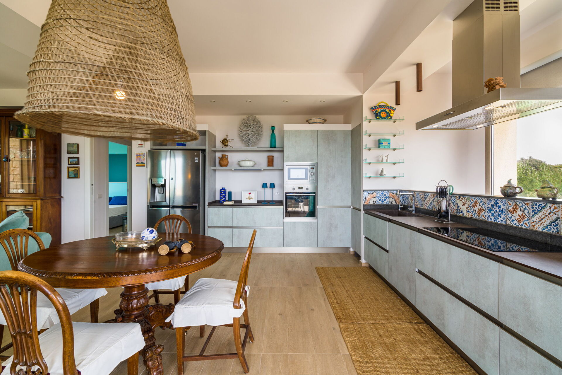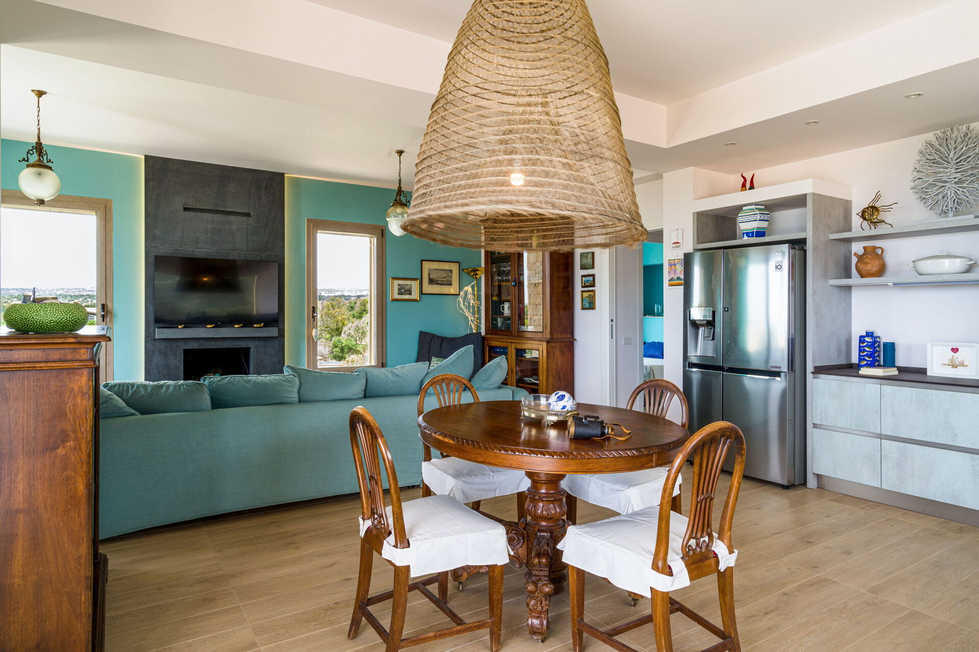 Den store terrassen med utsikt over havet er møblert for å kunne spise ute; her kan du slappe av og nyte en fantastisk panoramautsikt over landsbyen Sampieri og havet.