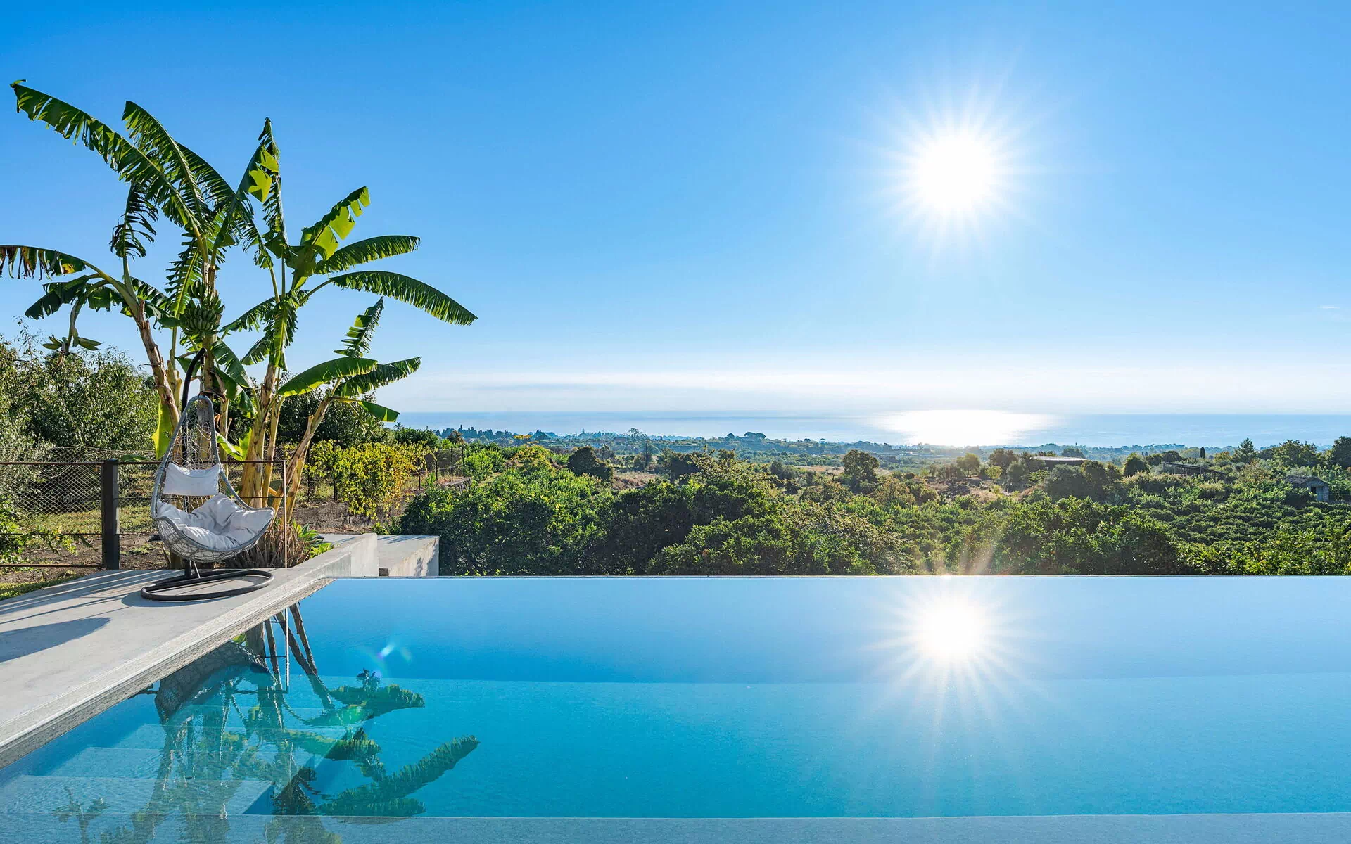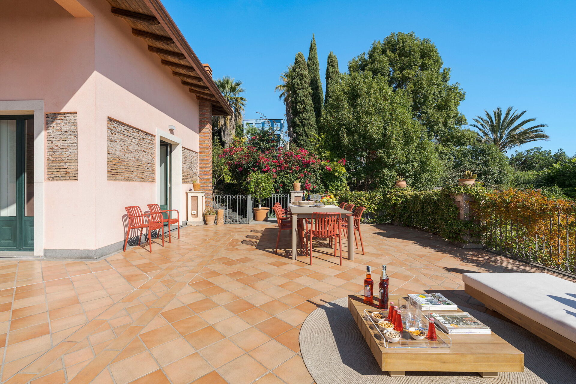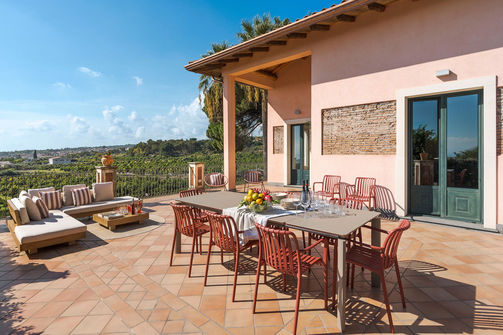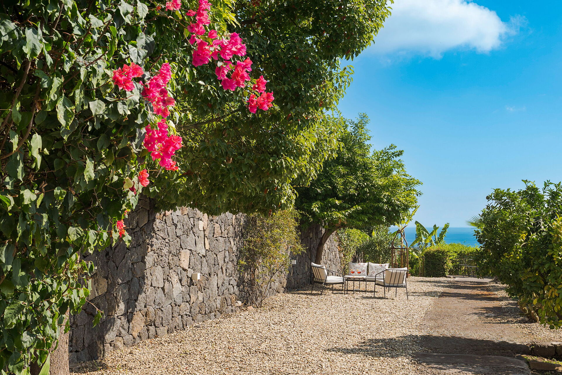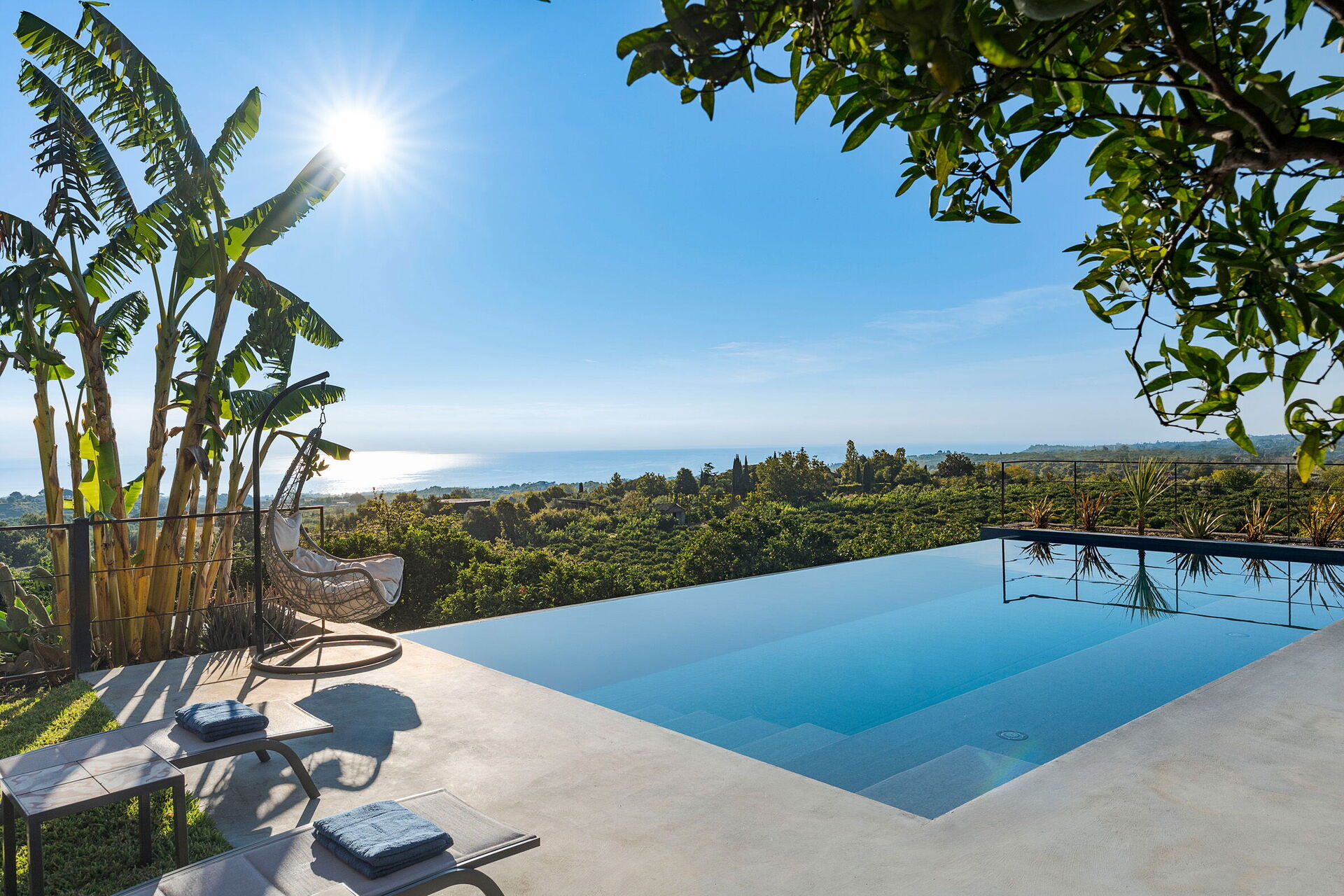 Denne praktfulle villaen vender ut mot en frodig og velstelt hage med aromatiske planter og palmer. I hagen finner man et pent saltvanns-infinitybasseng med panoramautsikt, samt store møblerte terrasser hvor gjestene kan tilbringe uforglemmelige øyeblikk under solen på Sicilia.