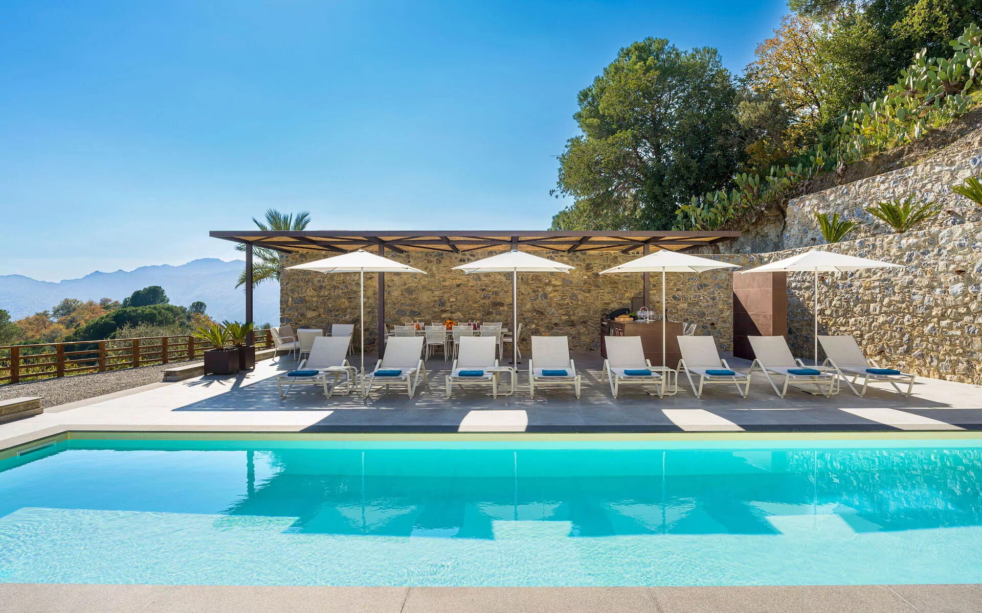 Utsikten fra svømmebassenget og de store terrassene er nydelig! Svømmebassenget har saltvanns rensesystem og bassengdekket er godt utstyrt med solsenger og parasoller.