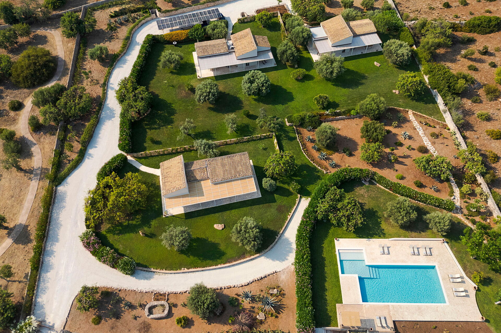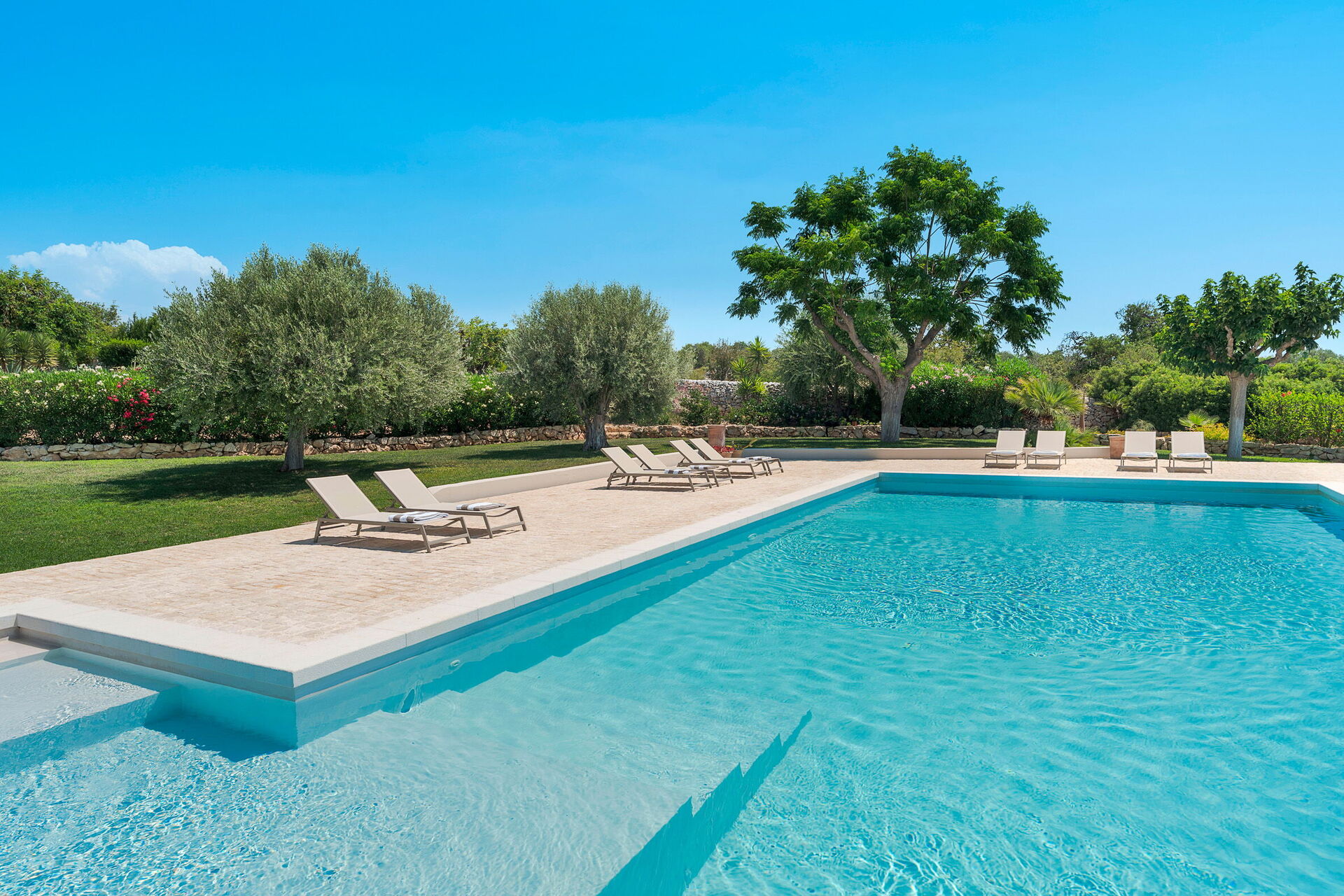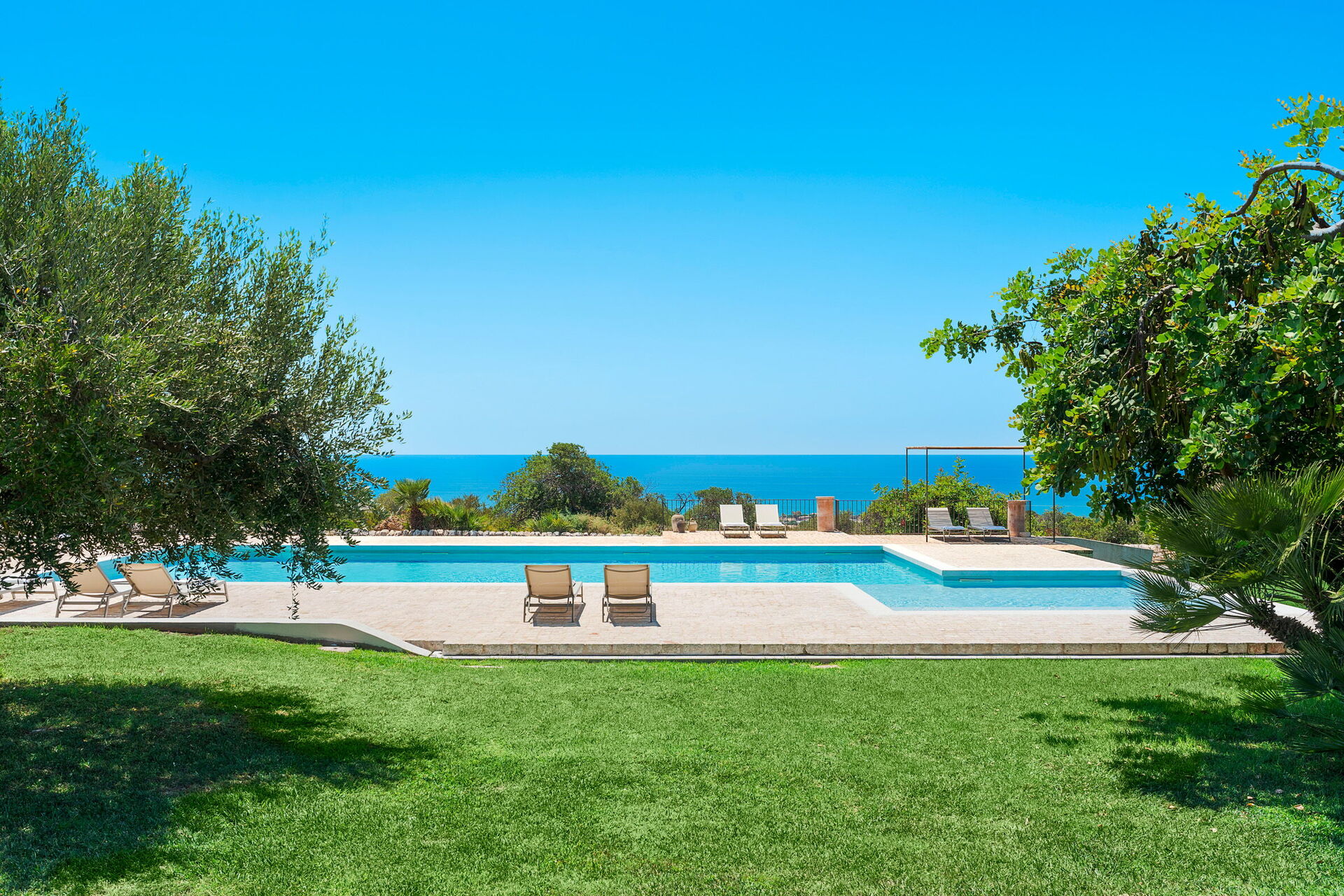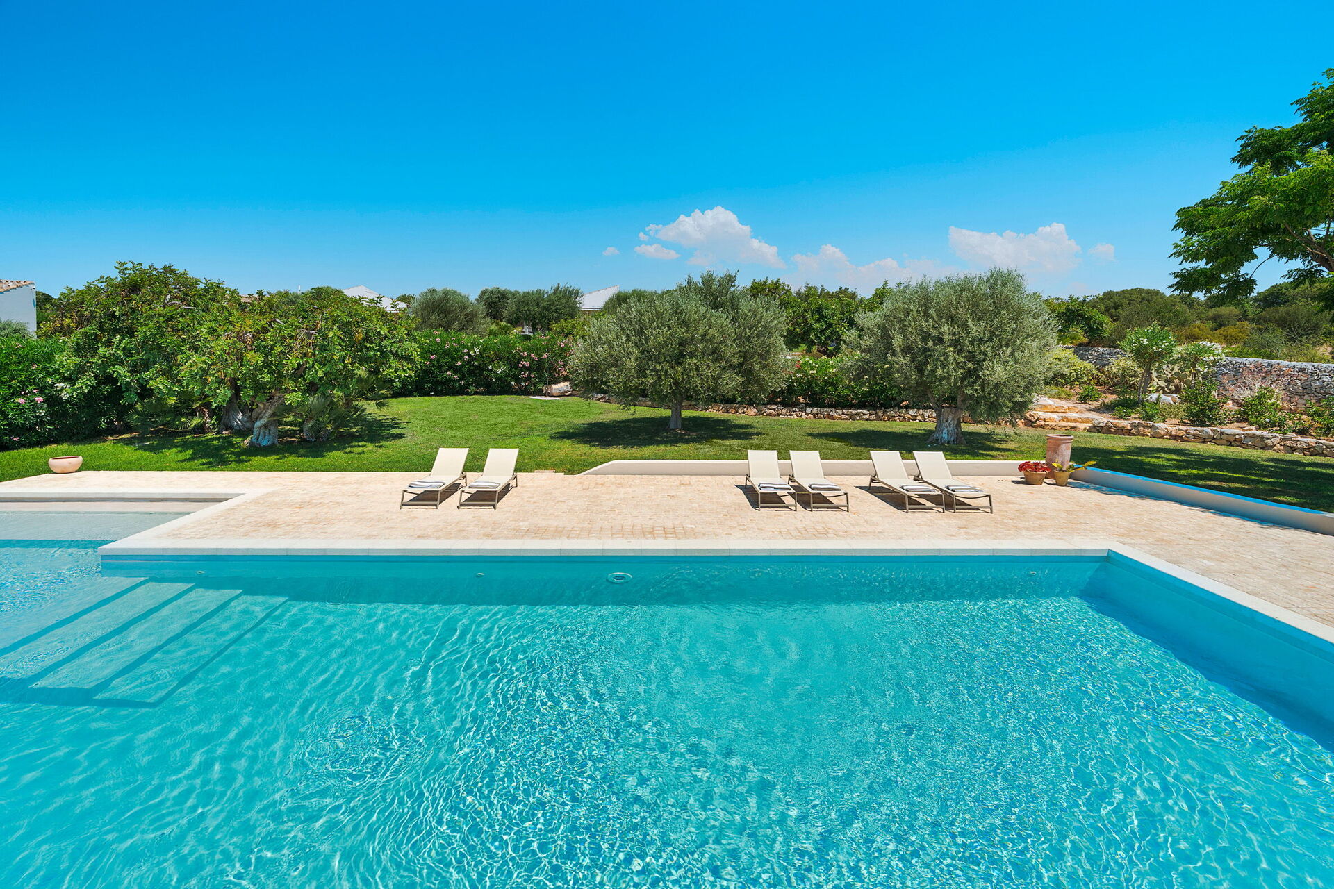 I utkanten av hagen, med sin plen og gamle johannesbrød- og oliventrær, ligger svømmebassenget hvor man kan kjøle seg av på den varmeste tidene av dagen.