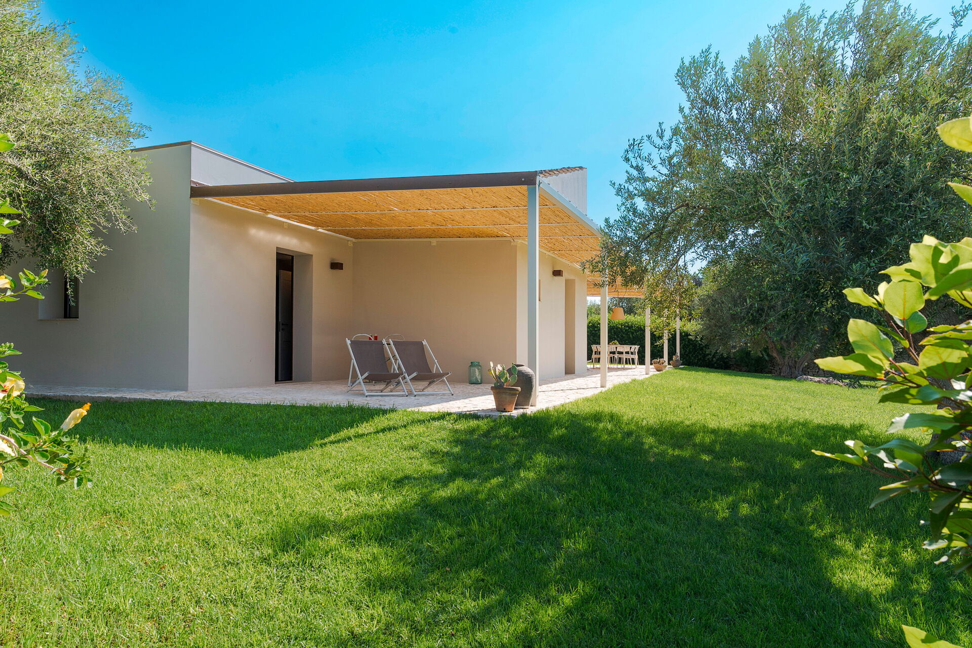 Terrasse med pergola, hage, felles basseng