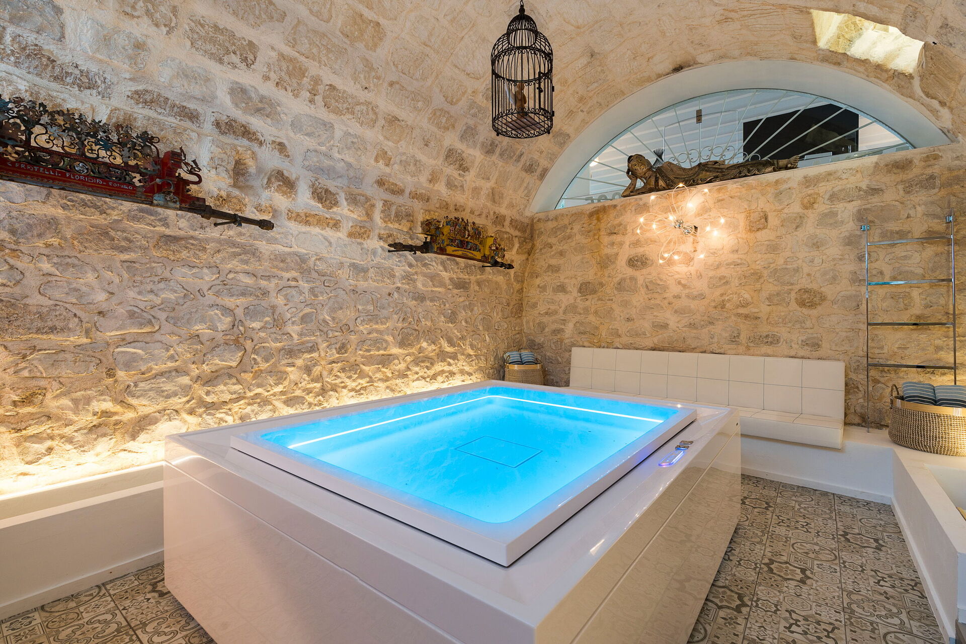Lavere nivå: velværeområde med badstue og boblebad.