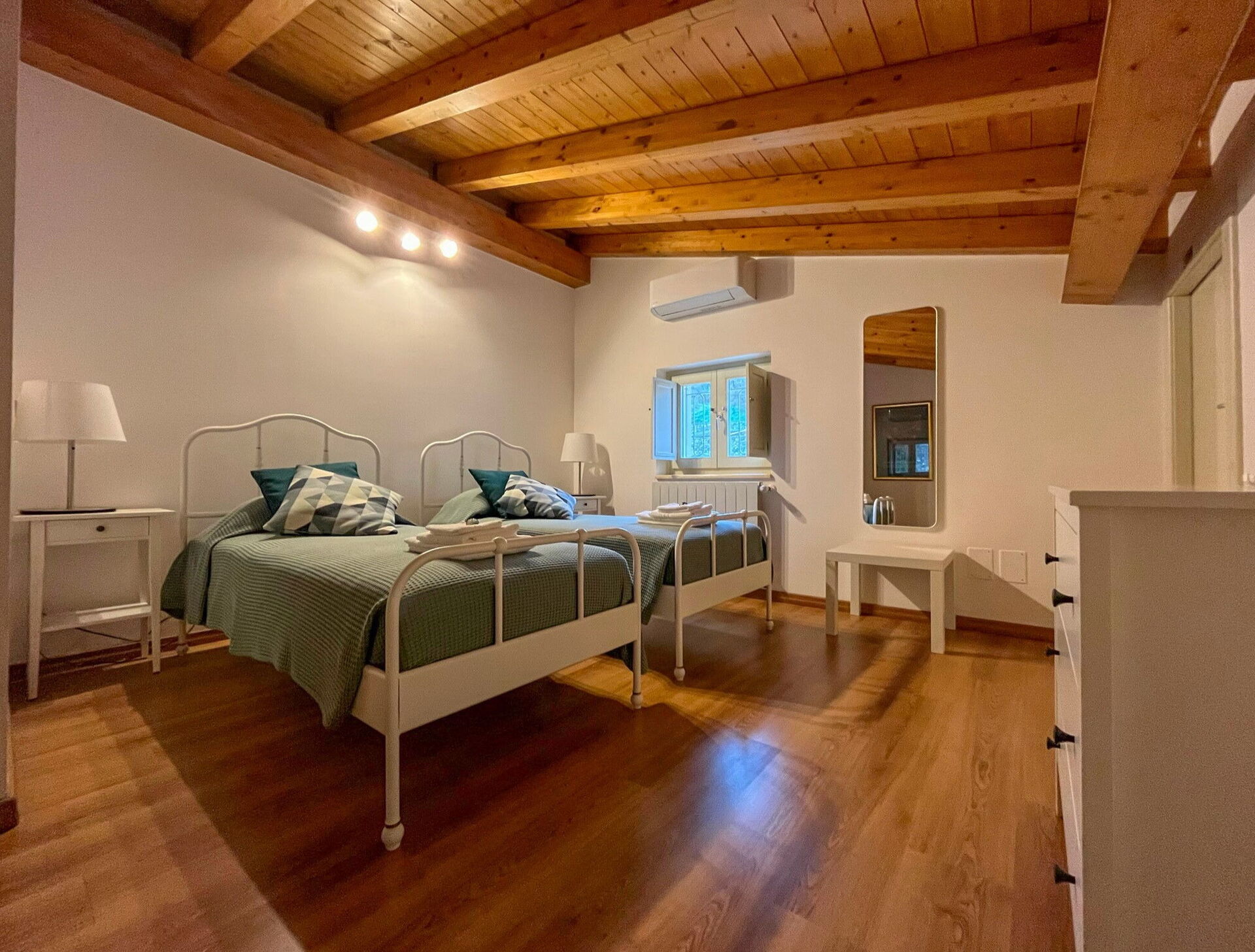 Andre etasje: liten stue-kontor (på en messanin), dobbeltrom, rom med 2 enkeltsenger, bad med badekar.