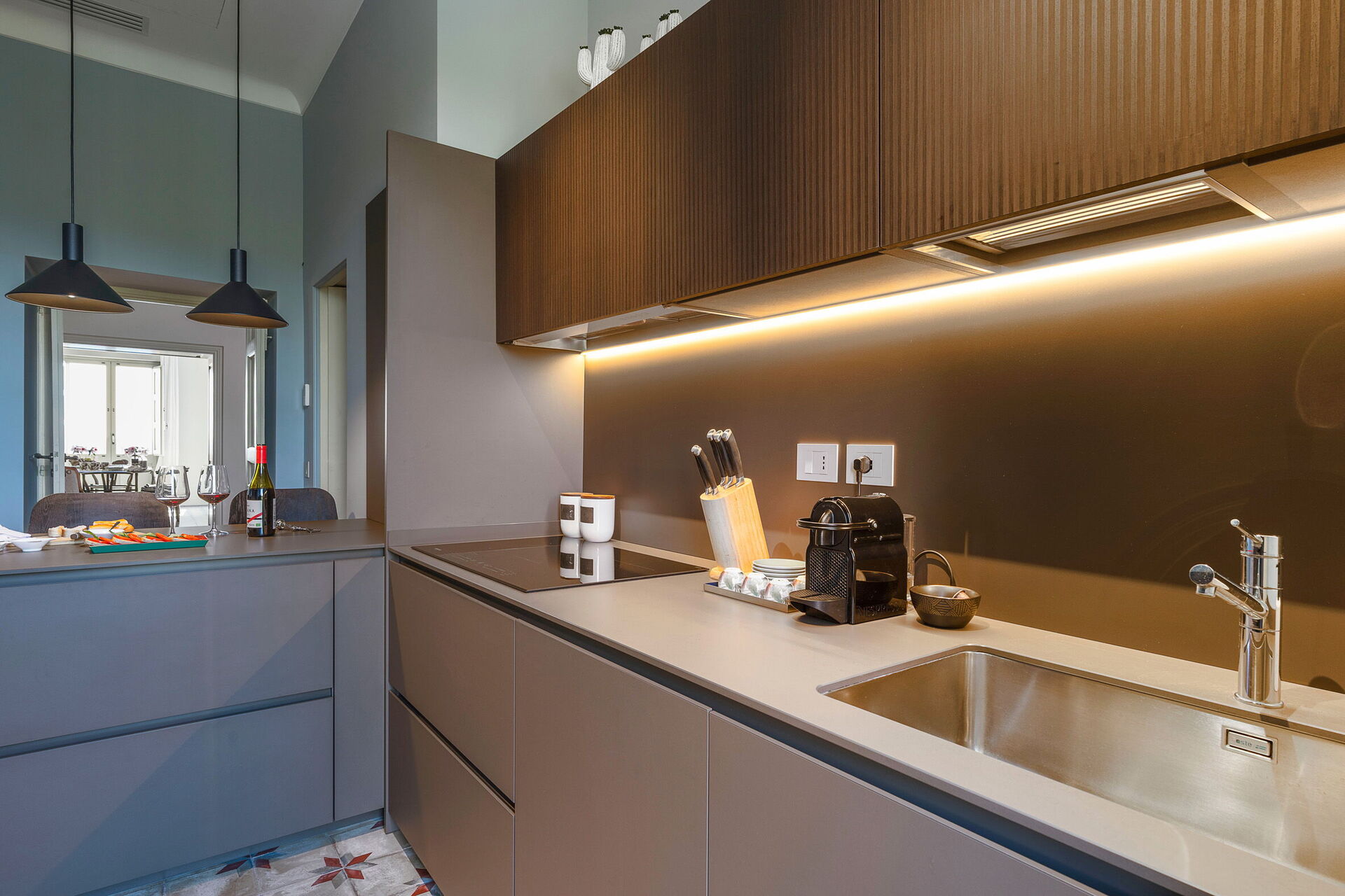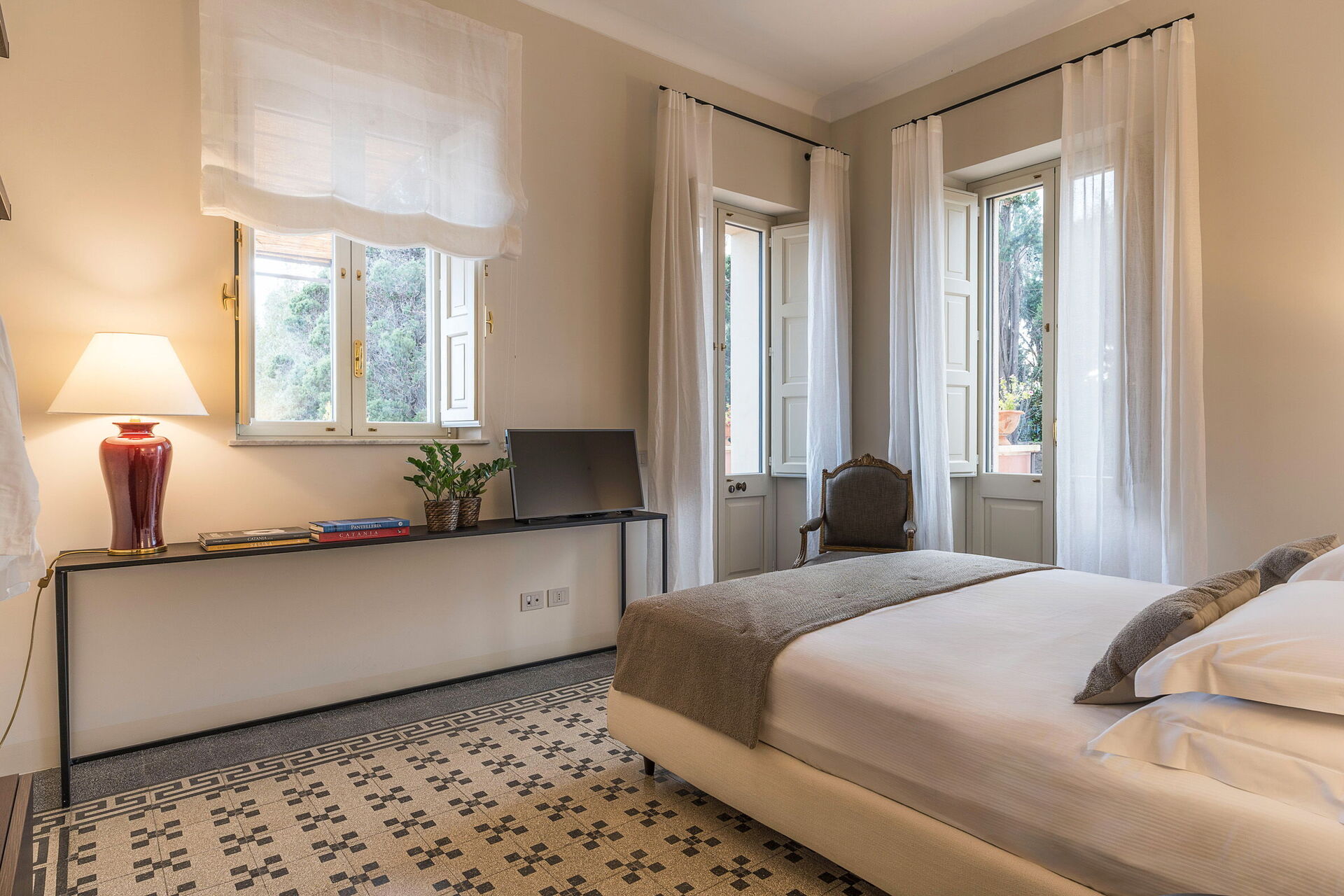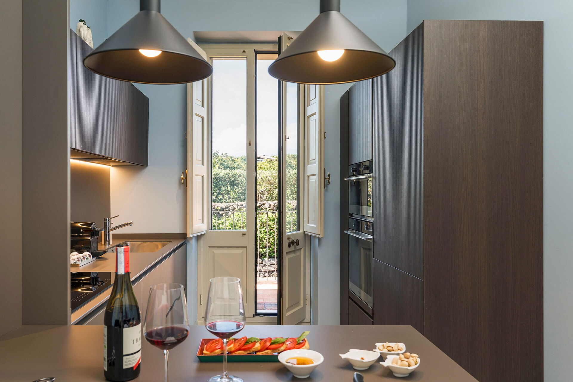 The villa has been skillfully renovated to preserve the original features of what was once the old palmento for wine making, and the main house: exposed wooden beam ceilings, terracotta floors, and lava stone basole.