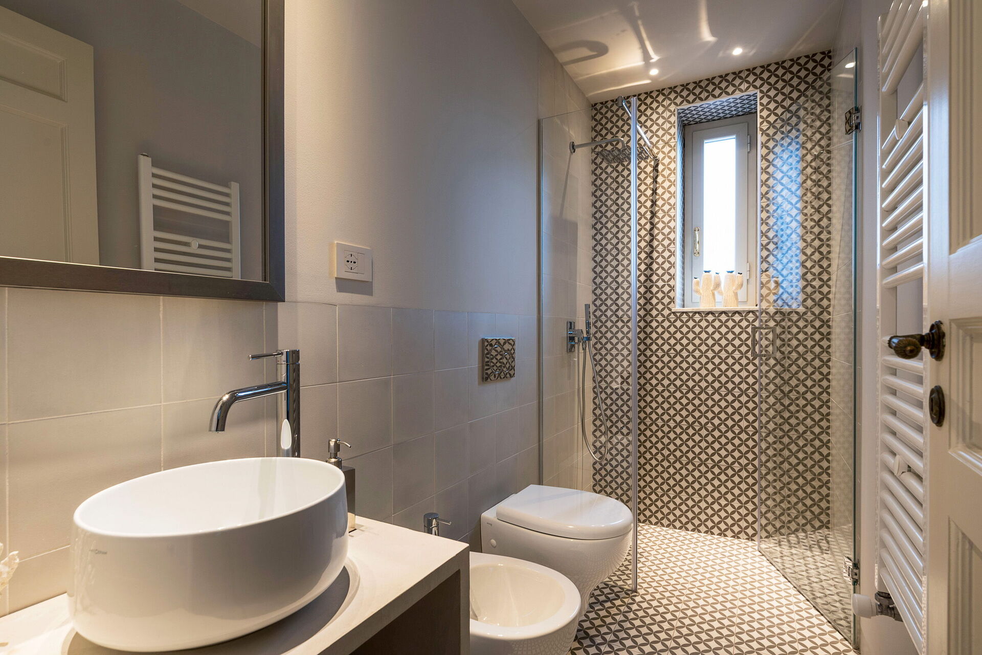 First floor: living room with fireplace, dining room, kitchen (oven, freezer, refrigerator, dishwasher, induction cooktop, microwave, toaster, espresso coffee maker, American coffee maker), bathroom with curbless shower (ideal for people with reduced mobility and/or disabilities), 2 double bedrooms (king size bed dimensions: 180 x 200 cm) each with a private bathroom with shower, double bedroom (bed dimensions: 160 x 200 cm) with a private bathroom with shower.