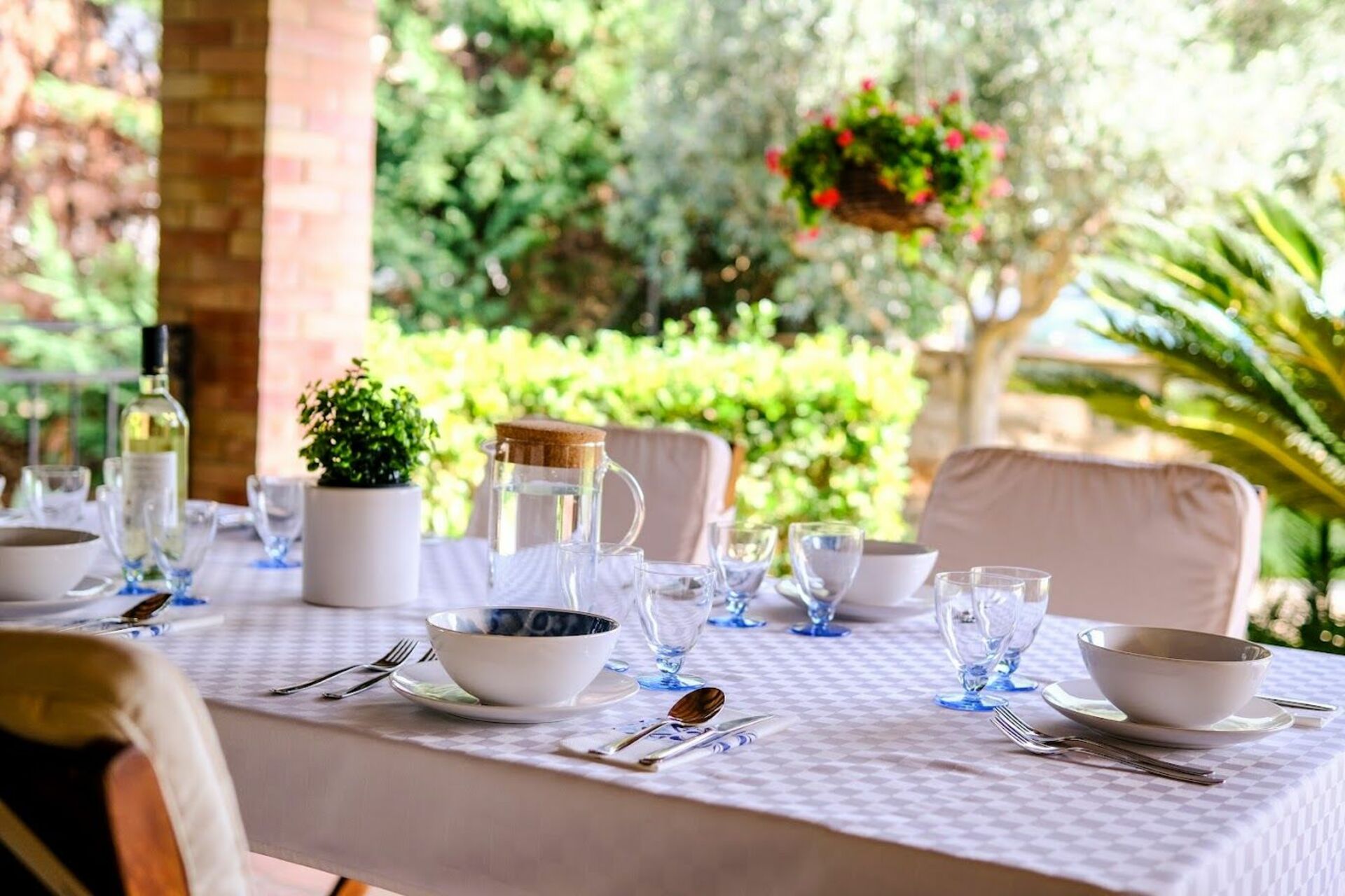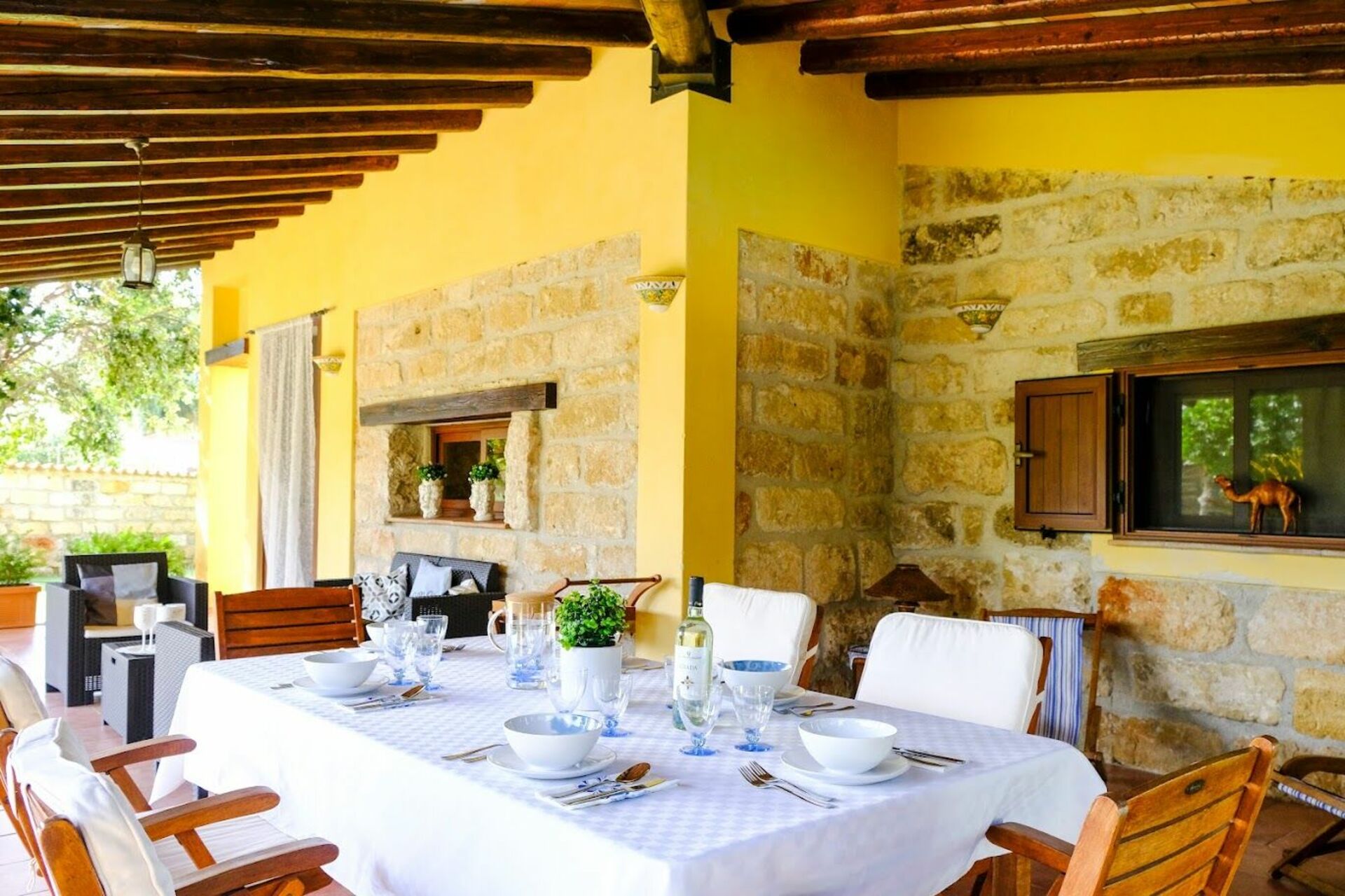Rundt huset finner du en romslig møblert veranda med utsyn til hagen og bassenget.
