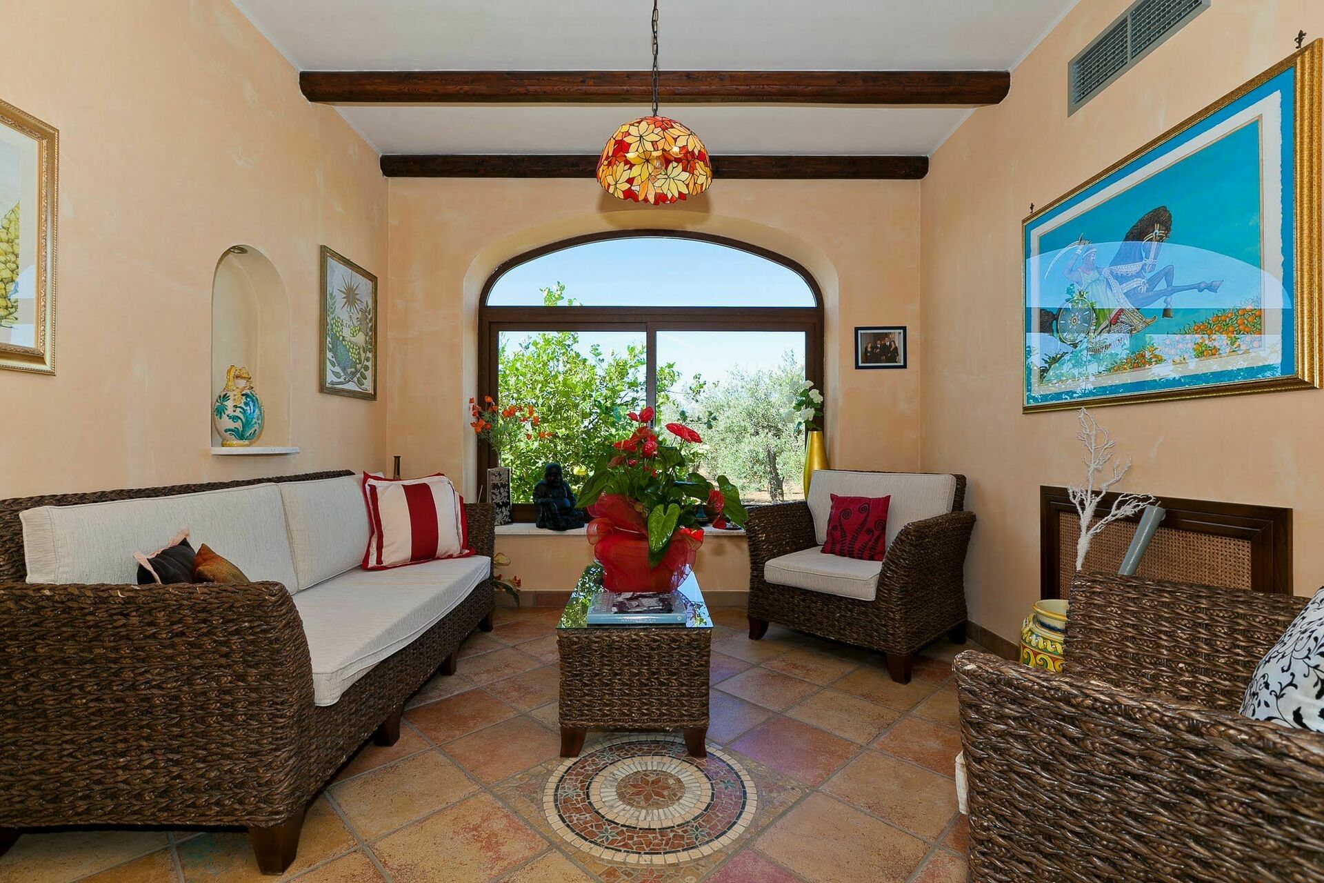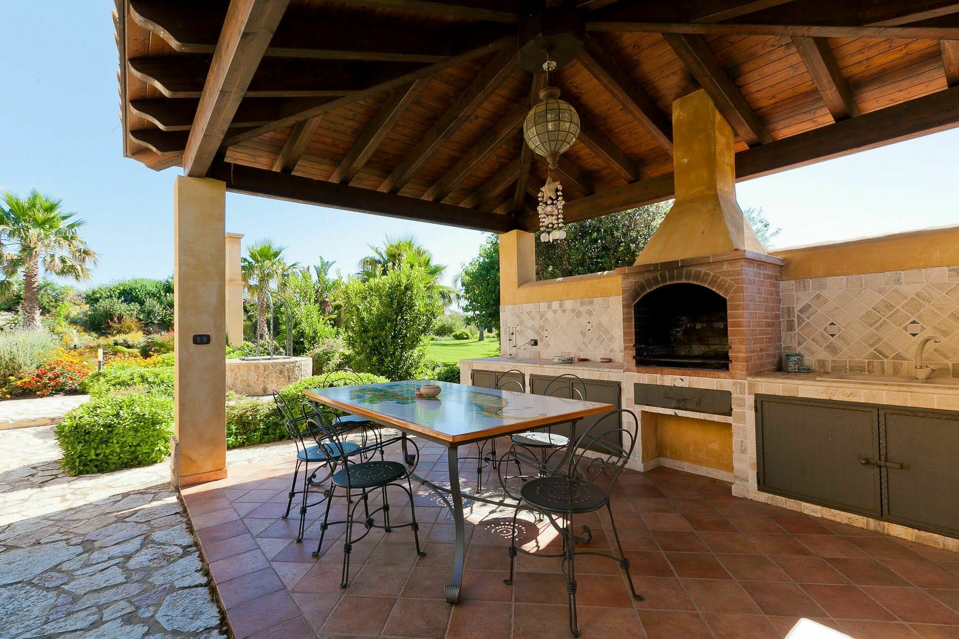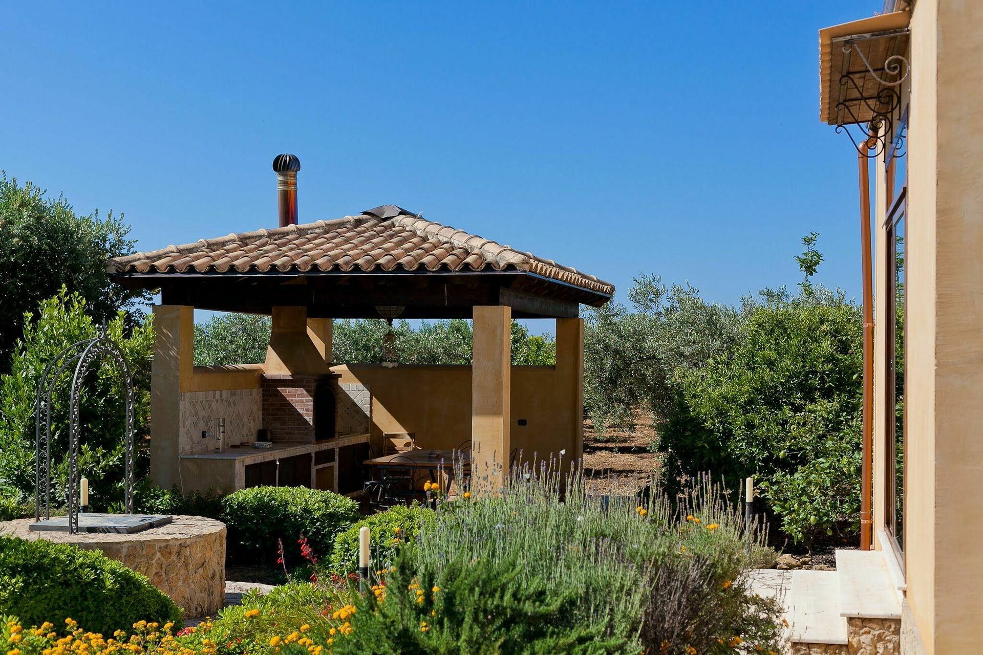 I hagen er det også en uteplass med utekjøkken, grill og et fint siciliansk majolica bord hvor man kan nyte deilige utendørs middager. Huset er en del av en større eiendom på 14.000 kvadratmeter land med dyrket med olivenlunder, vingårder og frukttrær.