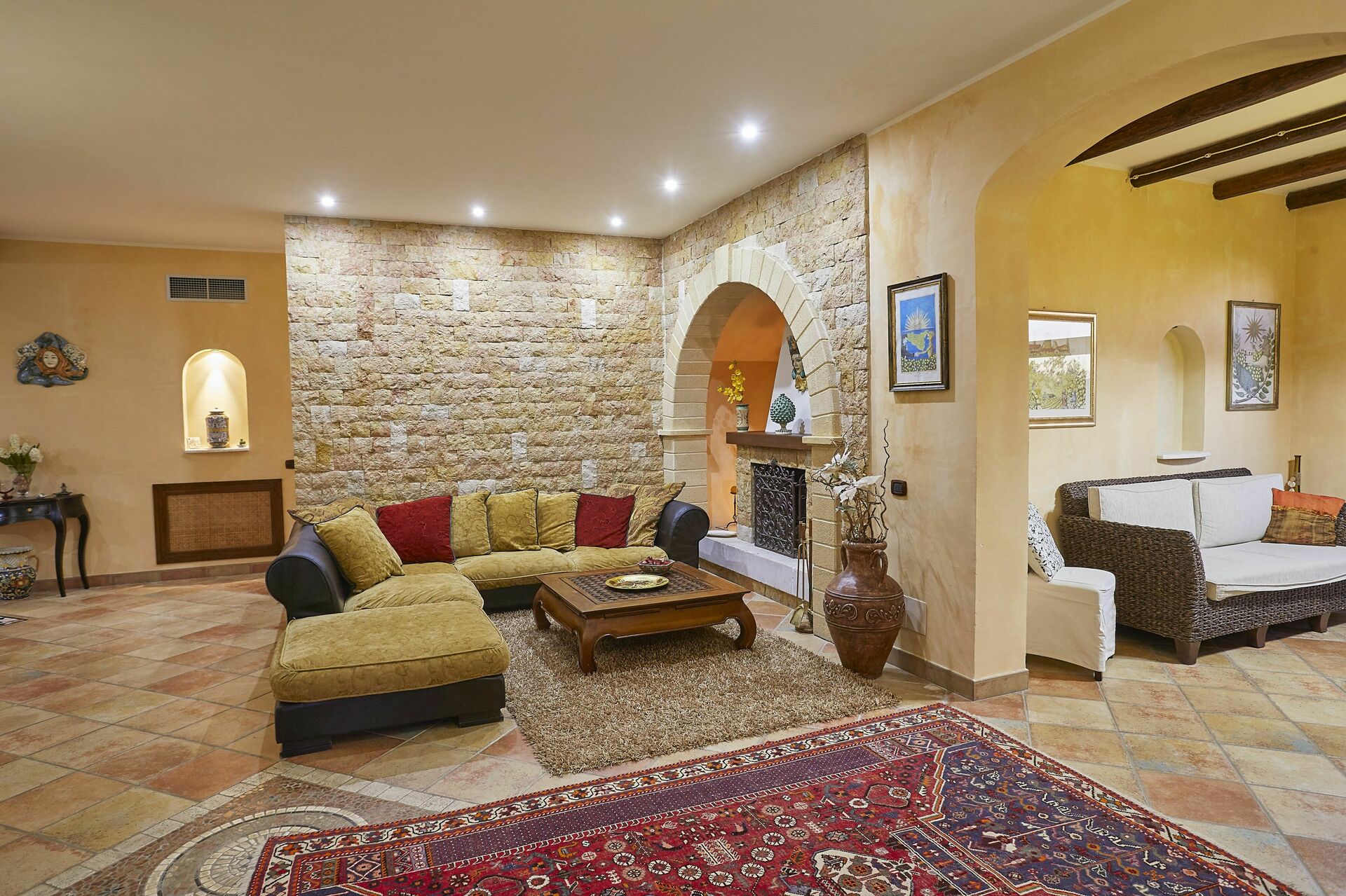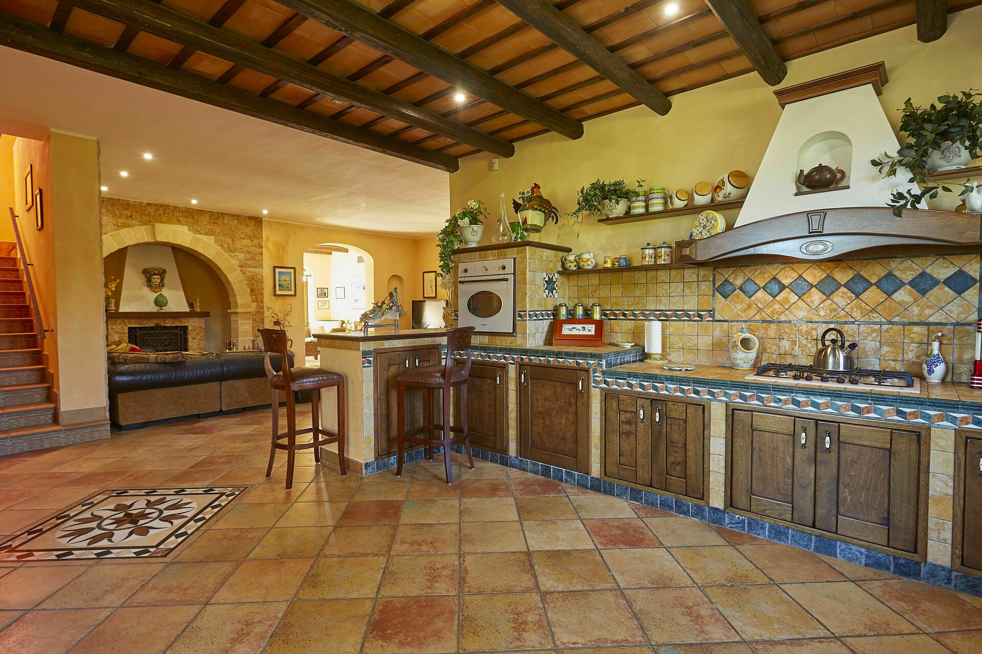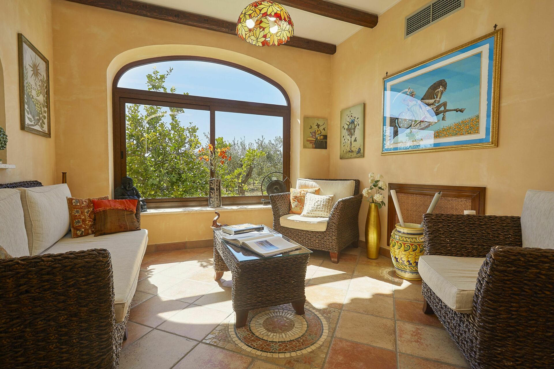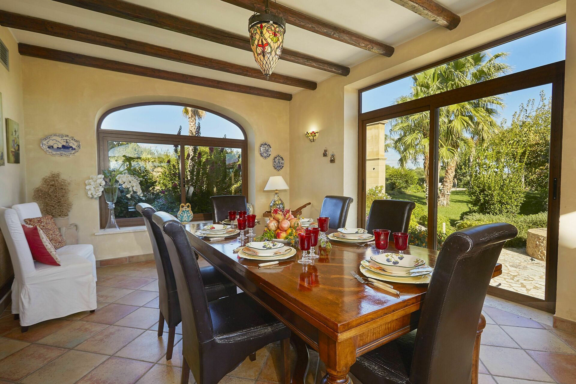 I hagen er det også en uteplass med utekjøkken, grill og et fint siciliansk majolica bord hvor man kan nyte deilige utendørs middager. Huset er en del av en større eiendom på 14.000 kvadratmeter land med dyrket med olivenlunder, vingårder og frukttrær.