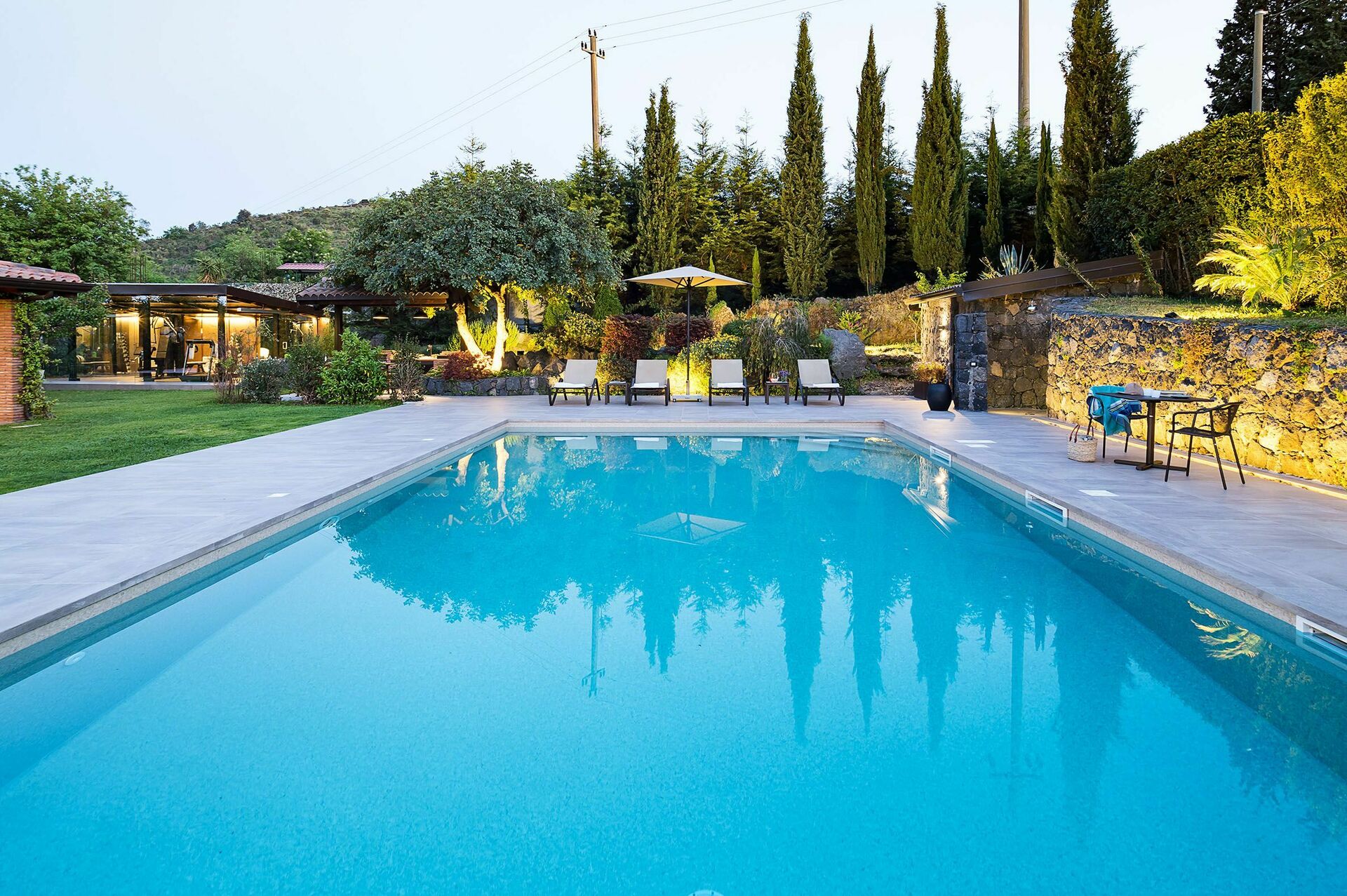 Luksuriøst feriehus med privat basseng i nærheten av Trecastagni, en landsby i åssiden opp mot Etna, 20 km fra Catania på Sicilia.