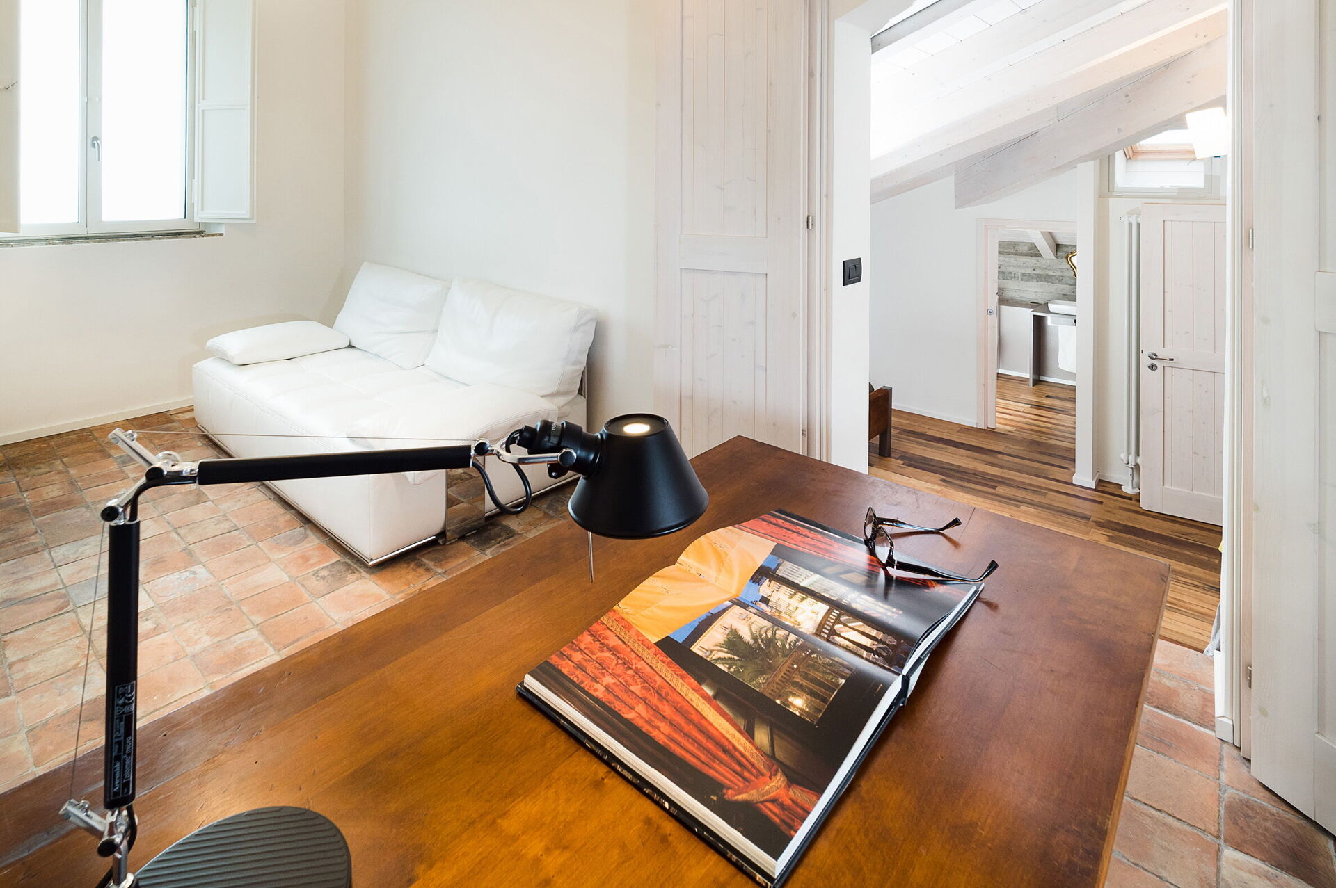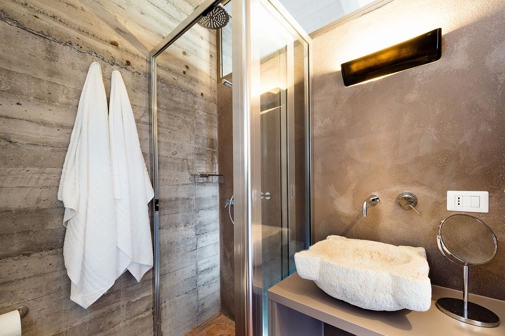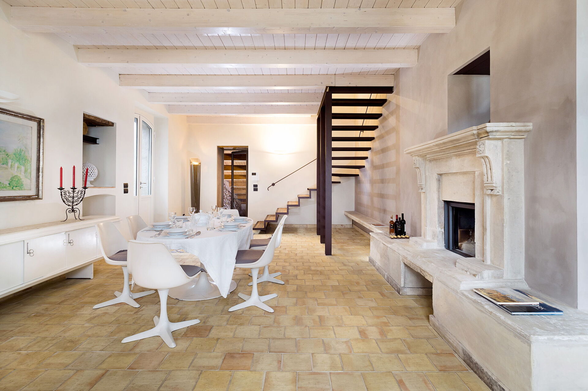 Disse stilige interiøret kombinerer det moderne funksjonelle med tradisjonelle elementer, som originale steinvegger. I første etasje i herregården er det oppholdsrom med stue, spisestue, kjøkken og bad. I andre etasje er det tre soverom med eget bad og i underetasjen, i det tidligere vinpresserommet, er velværeområdet. De to anneksene har henholdsvis en suite med dobbeltseng på loftet (Casetta) og et dobbelt soverom (Dependance), begge med eget bad.