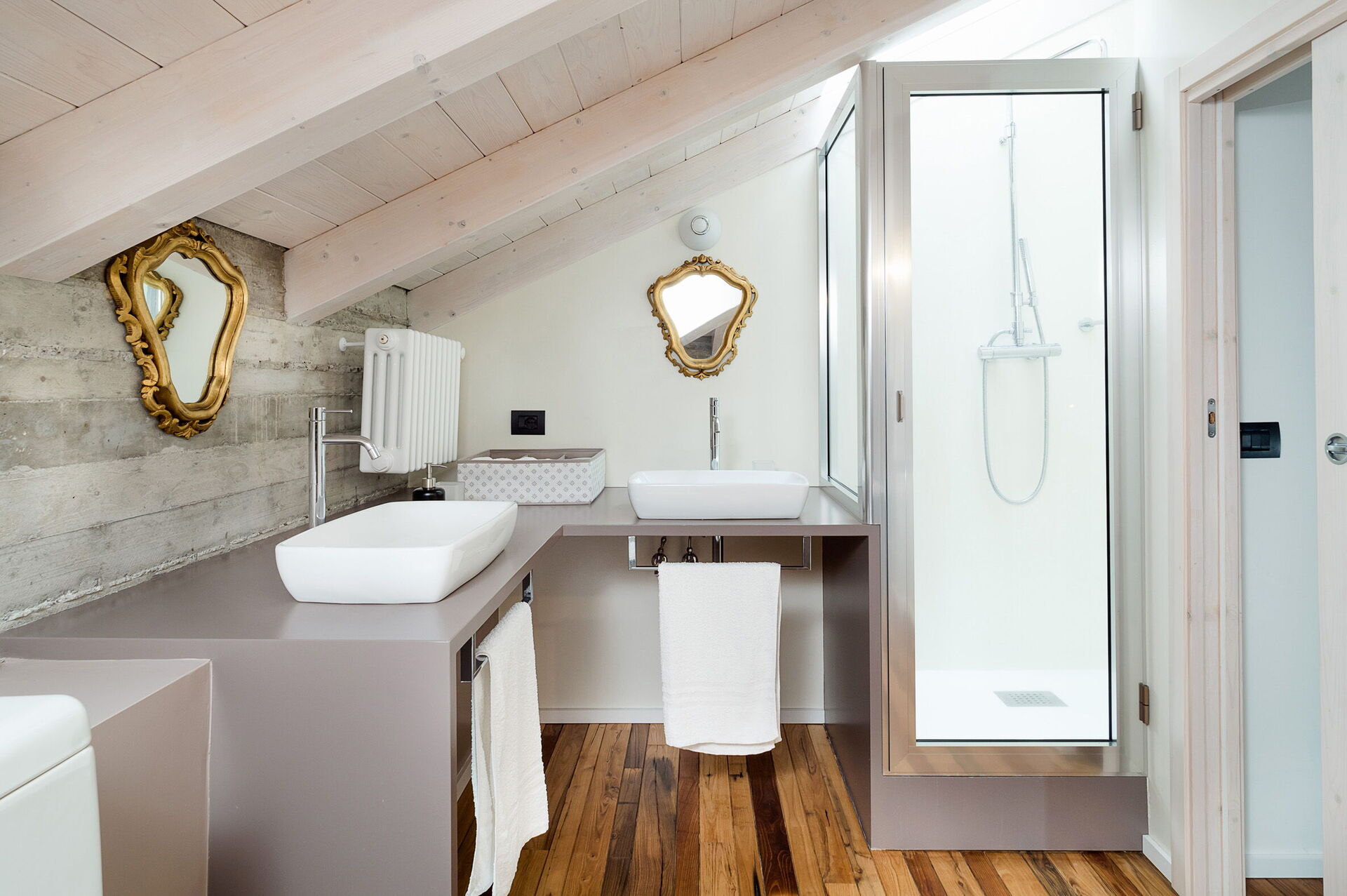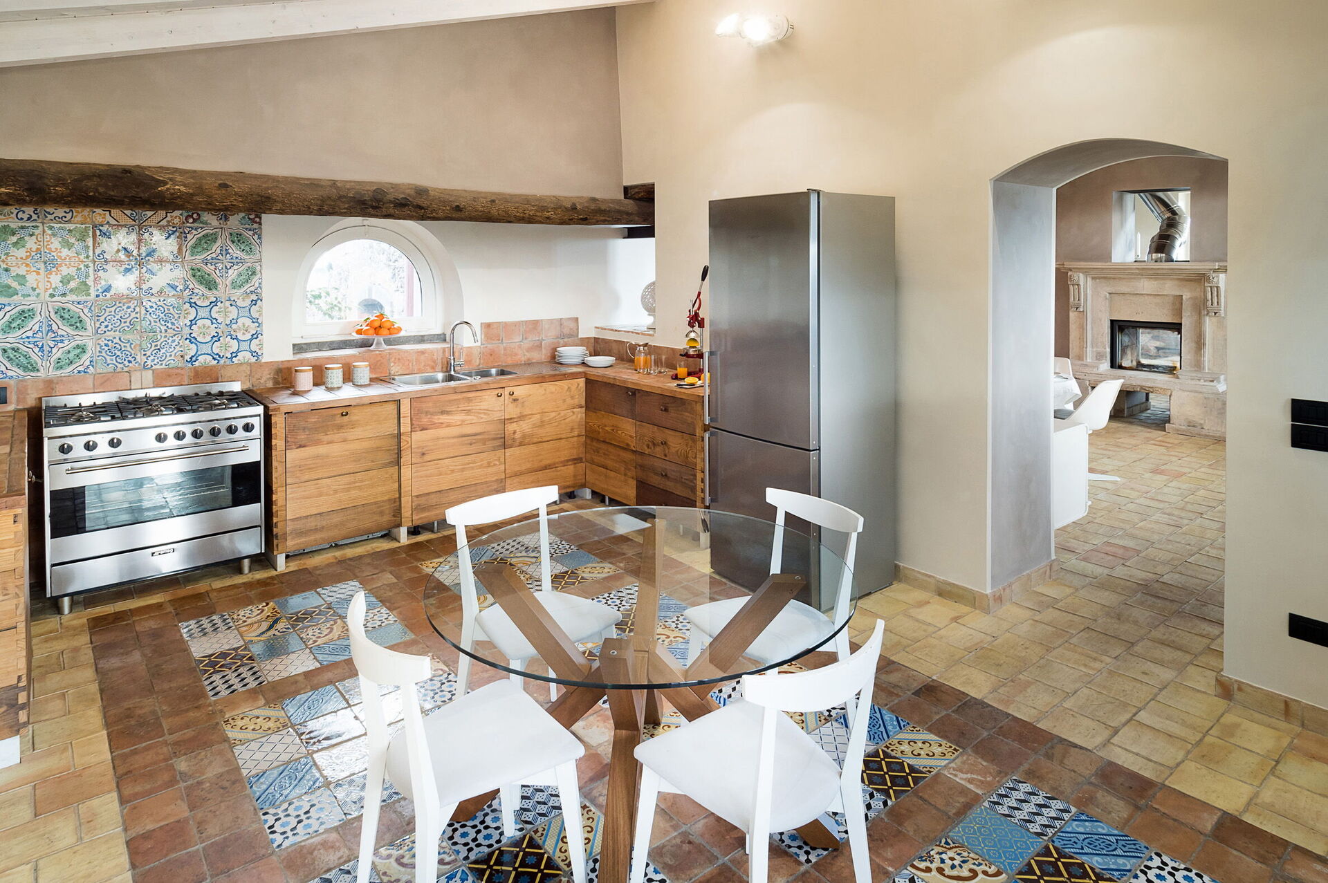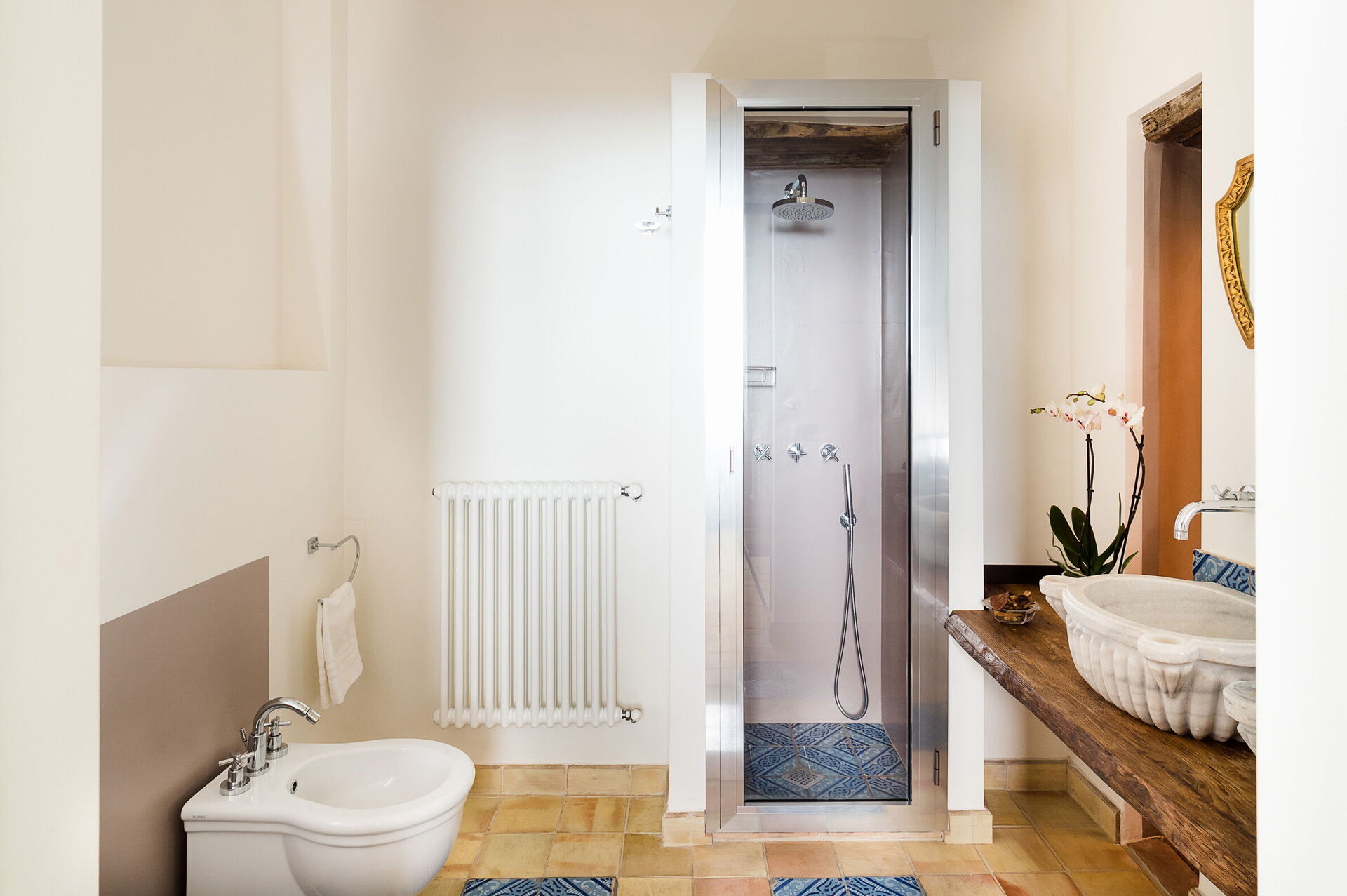 Disse stilige interiøret kombinerer det moderne funksjonelle med tradisjonelle elementer, som originale steinvegger. I første etasje i herregården er det oppholdsrom med stue, spisestue, kjøkken og bad. I andre etasje er det tre soverom med eget bad og i underetasjen, i det tidligere vinpresserommet, er velværeområdet. De to anneksene har henholdsvis en suite med dobbeltseng på loftet (Casetta) og et dobbelt soverom (Dependance), begge med eget bad.