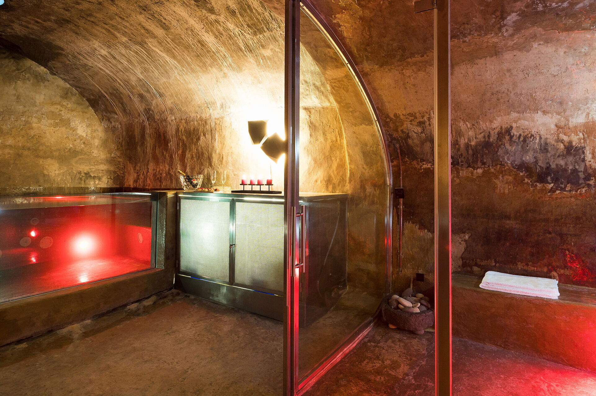Nedre etasje: velværeområde med boblebad, saltgrotte, badstue, tyrkisk bad, multi-sensorisk dusj, avslappende område