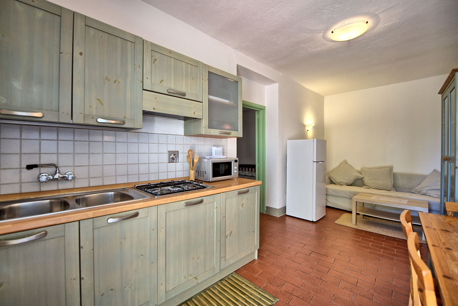 Første etasje (tilgang fra terrassen): lite kjøkken (satellitt-TV, kjøleskap 120 lt, liten elektrisk ovn) med spisebord og sovesofa, dobbelt soverom (aircondition) med tilgang til terrasse og eget bad med dusj. Sovesofaen er begrenset til barn under 12 år.