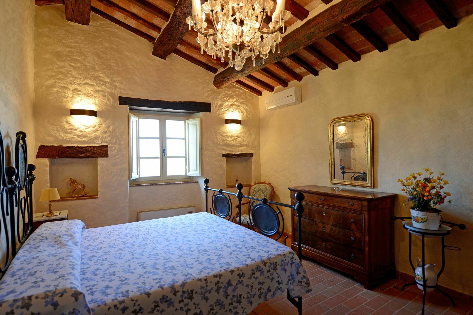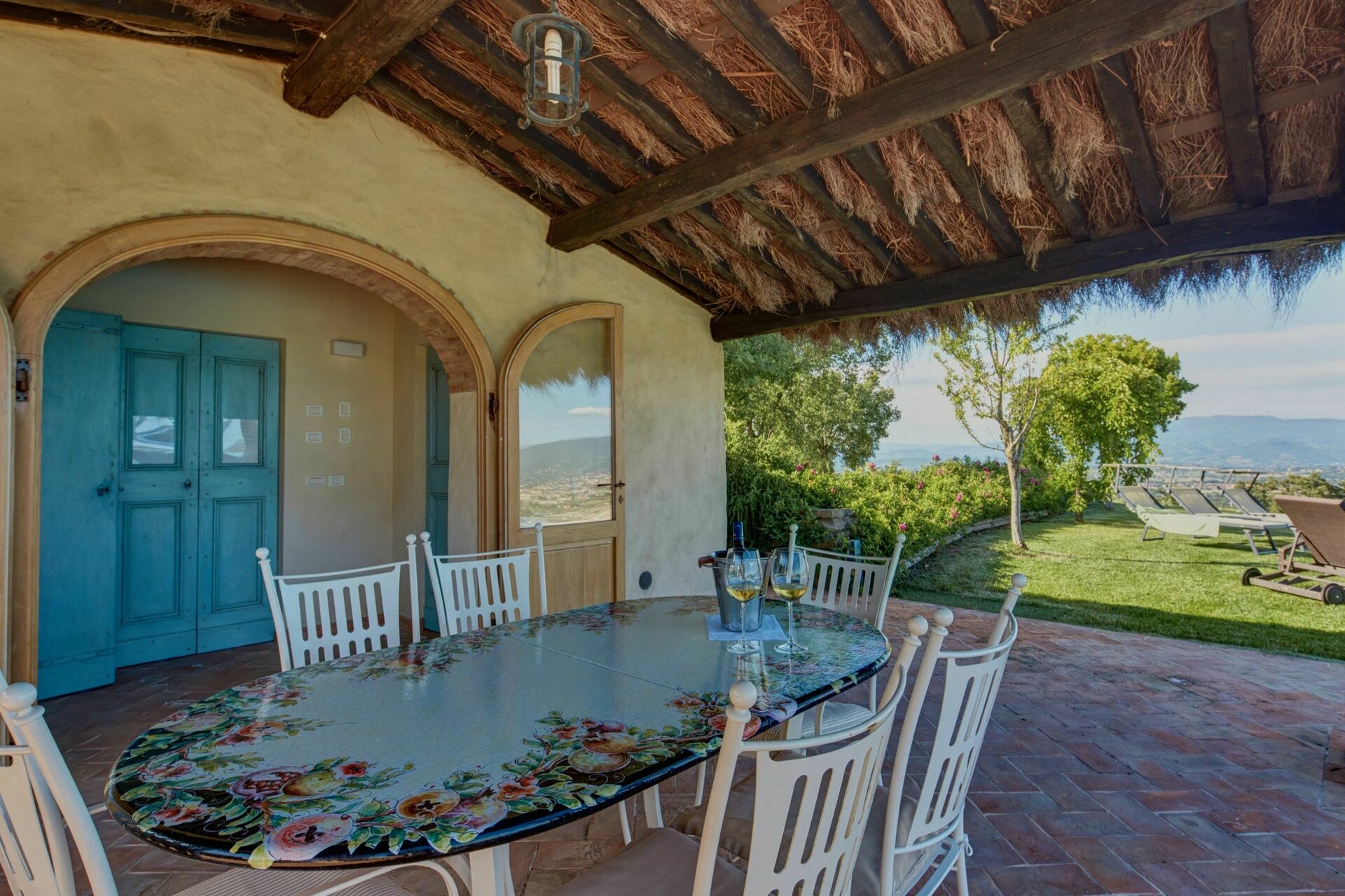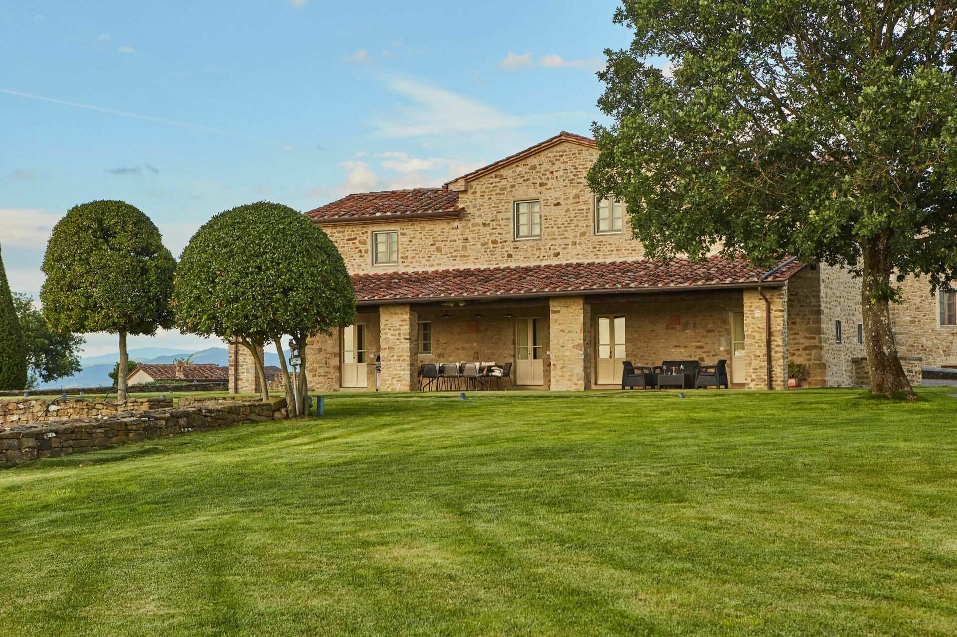 Vakker, nylig restaurert villa som ligger på en bakketopp med utsikt over byen Arezzo og Chiana-dalen . Denne eiendommen er helt inngjerdet og består av eiernes hus og en sjarmerende liten kirke som kan dateres tilbake til det syvende århundre. På uteområdet kan gjestene nyte bruk av en stor , velstelt hage med et pent privat svømmebasseng med panoramautsikt. Villaen ble delt inn i fire leiligheter som er koblet sammen internt og er utleibar bare samlet som en privat villa. Huset er smakfullt innredet med innbydende interiør. I første etasje er det et stort, møblert portrom som er ideell for utendørs måltider.