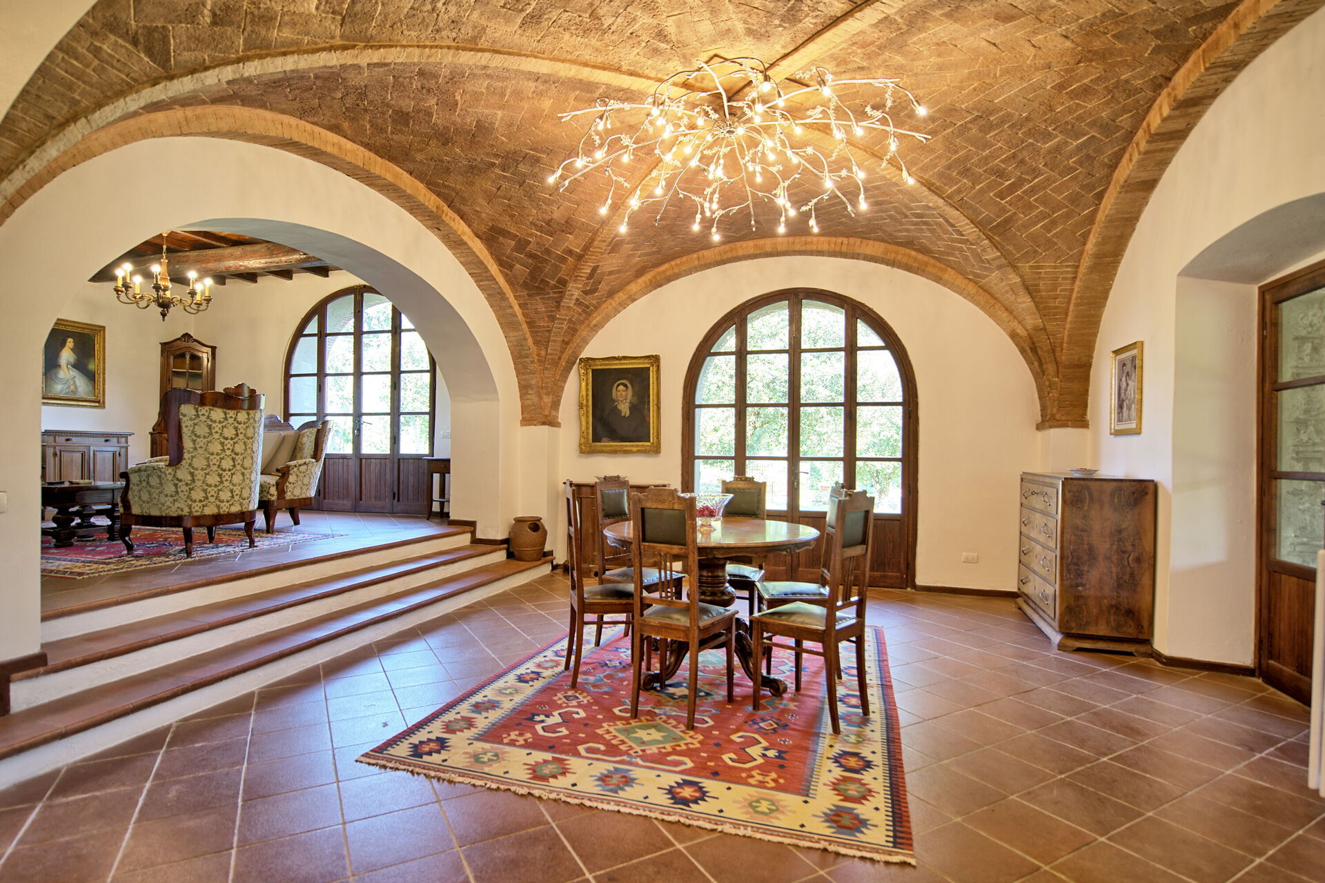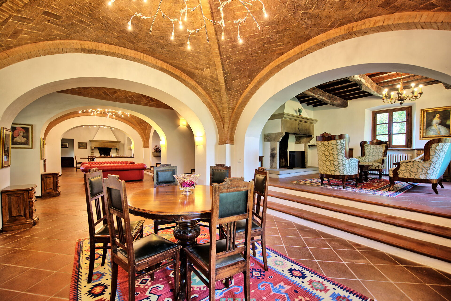 Stor stue fordelt som tre ulike stuer, to av dem med åpen peis og en stor spisestue med plass for alle å sitte sammen.