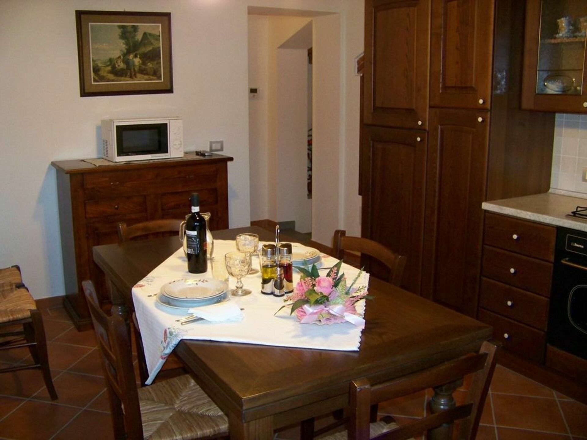 Leiligheten har et fullt utstyrt kjøkken utstyrt for tilberedning av mat bestående av: komfyr og vask, elektrisk ovn med grill, fryser, oppvaskmaskin, mikrobølgeovn, servise og bestikk for 12 kuverter, servise, etc., med uttrekkbart rektangulært bord og stoler i tilstrekkelig antall.
