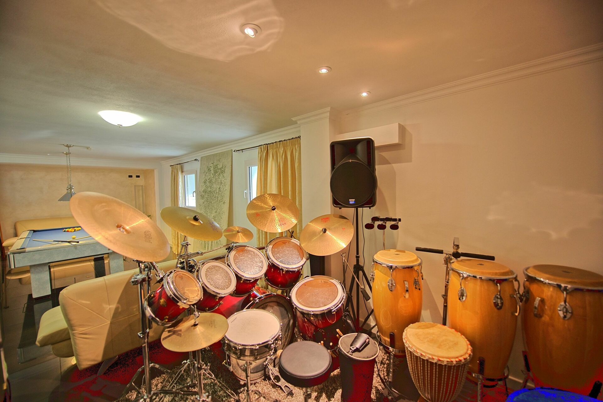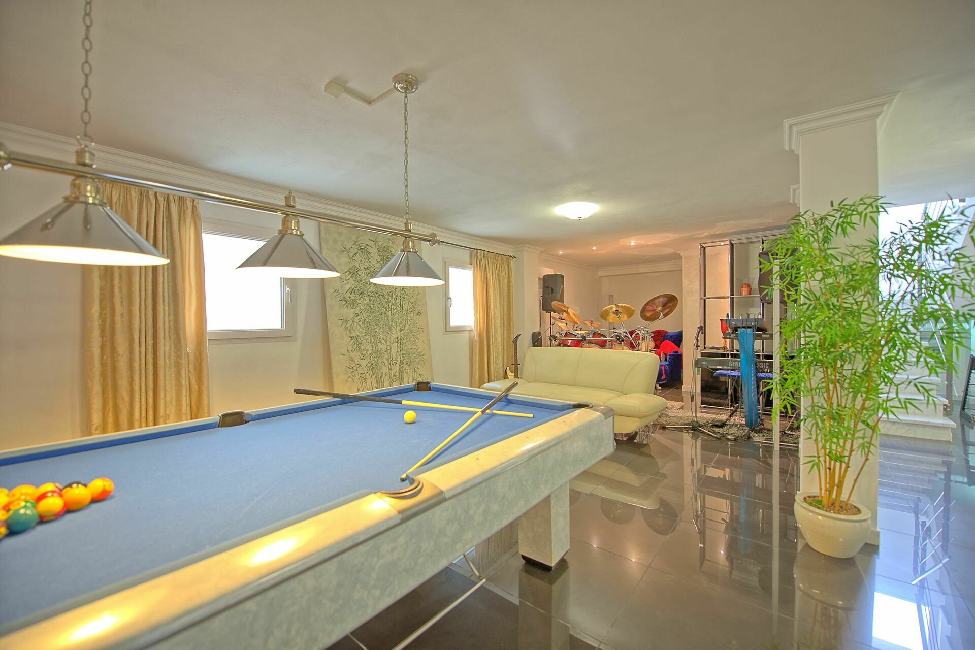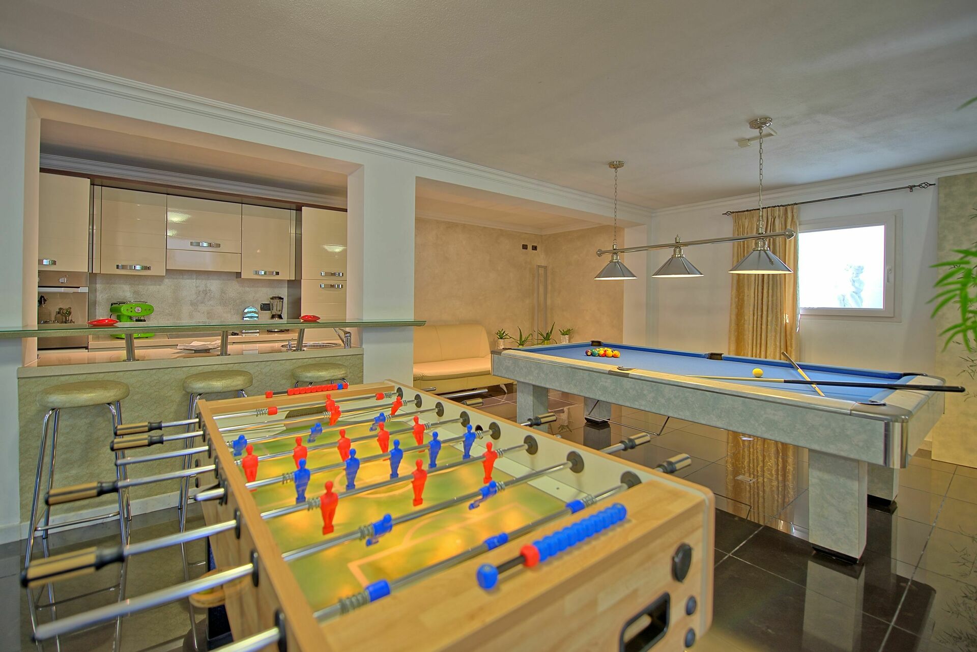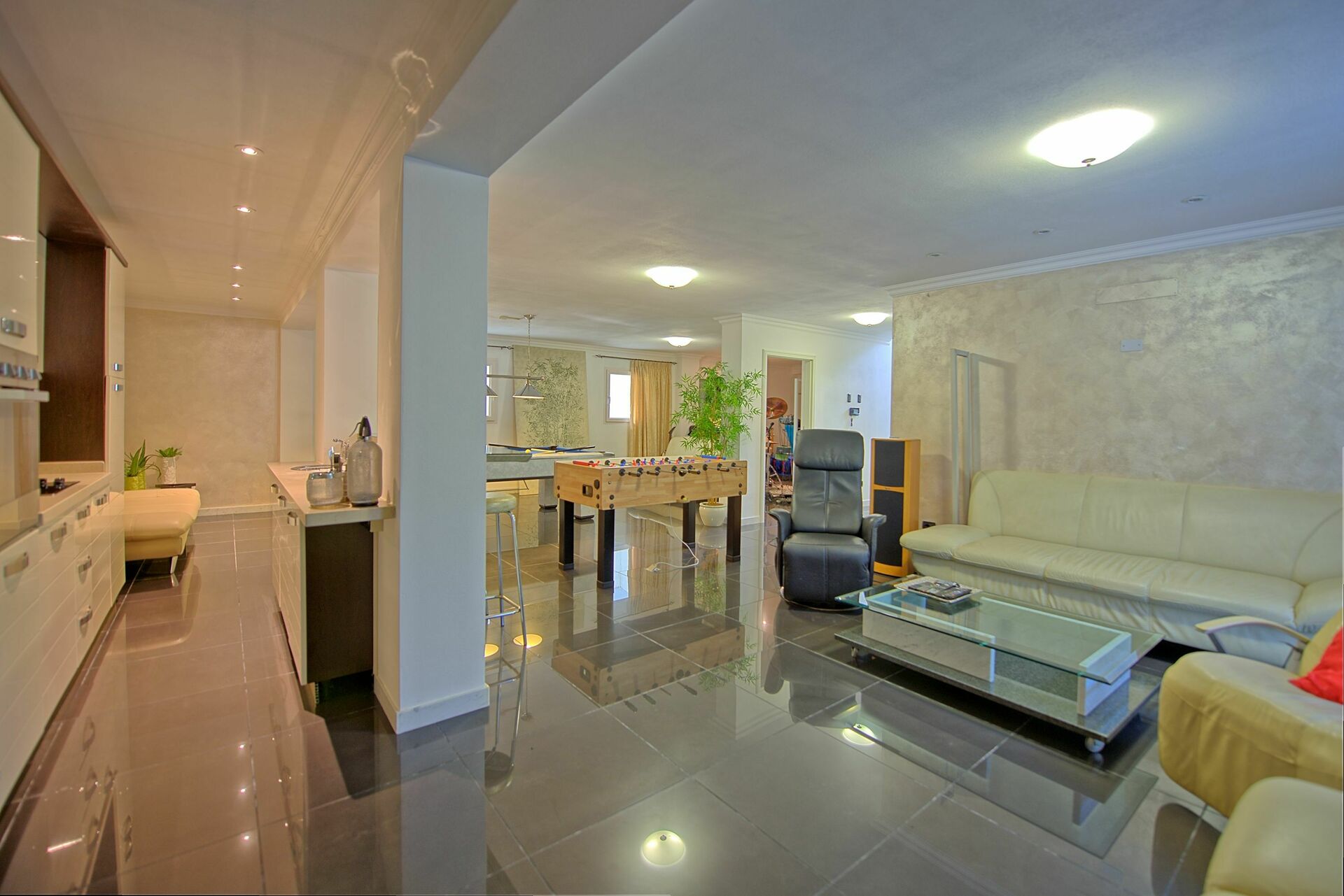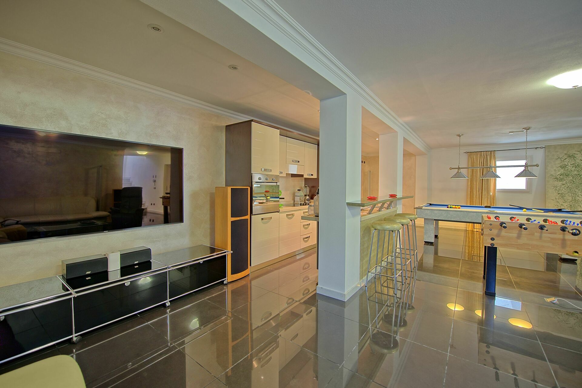 Kjelleretasjen: biljardbord og fotballspill, kino med hi-fi.