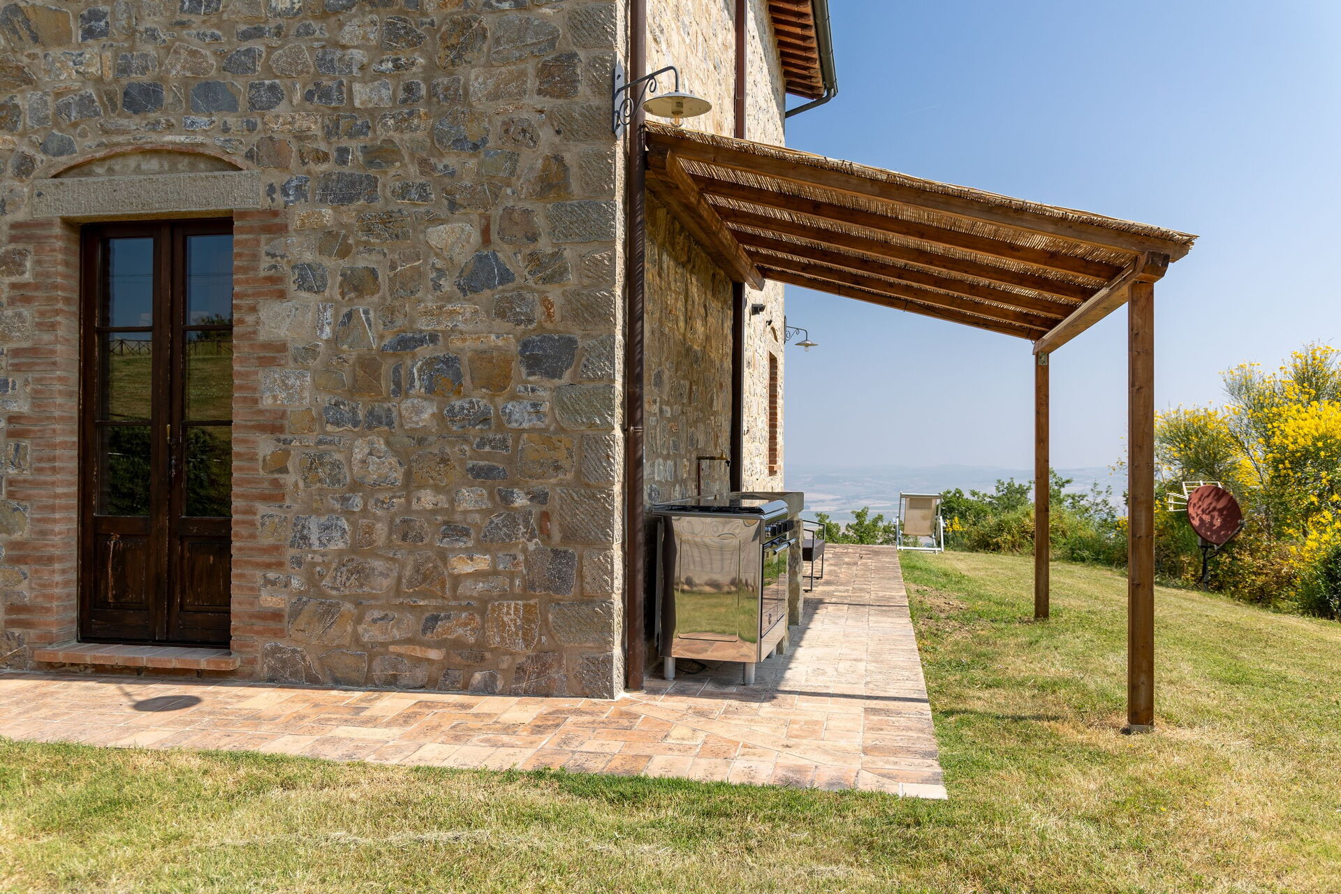Grunnplan: Inngang til spisestue og stue med peis, LCD-satellitt-TV, spisebord, I stue åpner en fransk dør ut til hagen med en utstyrt veranda med sofaer og fantastisk utsikt over Val d'Orcia. Stuen fører inn til et fullt utstyrt kjøkken med gass komfyr (4 brenner), elektrisk stekeovn, mikrobølgeovn, brødrister, kjøleskap med fryser, amerikansk og italiensk kaffetrakter, vannkoker, en fransk dør fører ut til hagen med spisebord og stoler for er for utendørs måltider. Det er også et bad med dusj i denne etasjen.